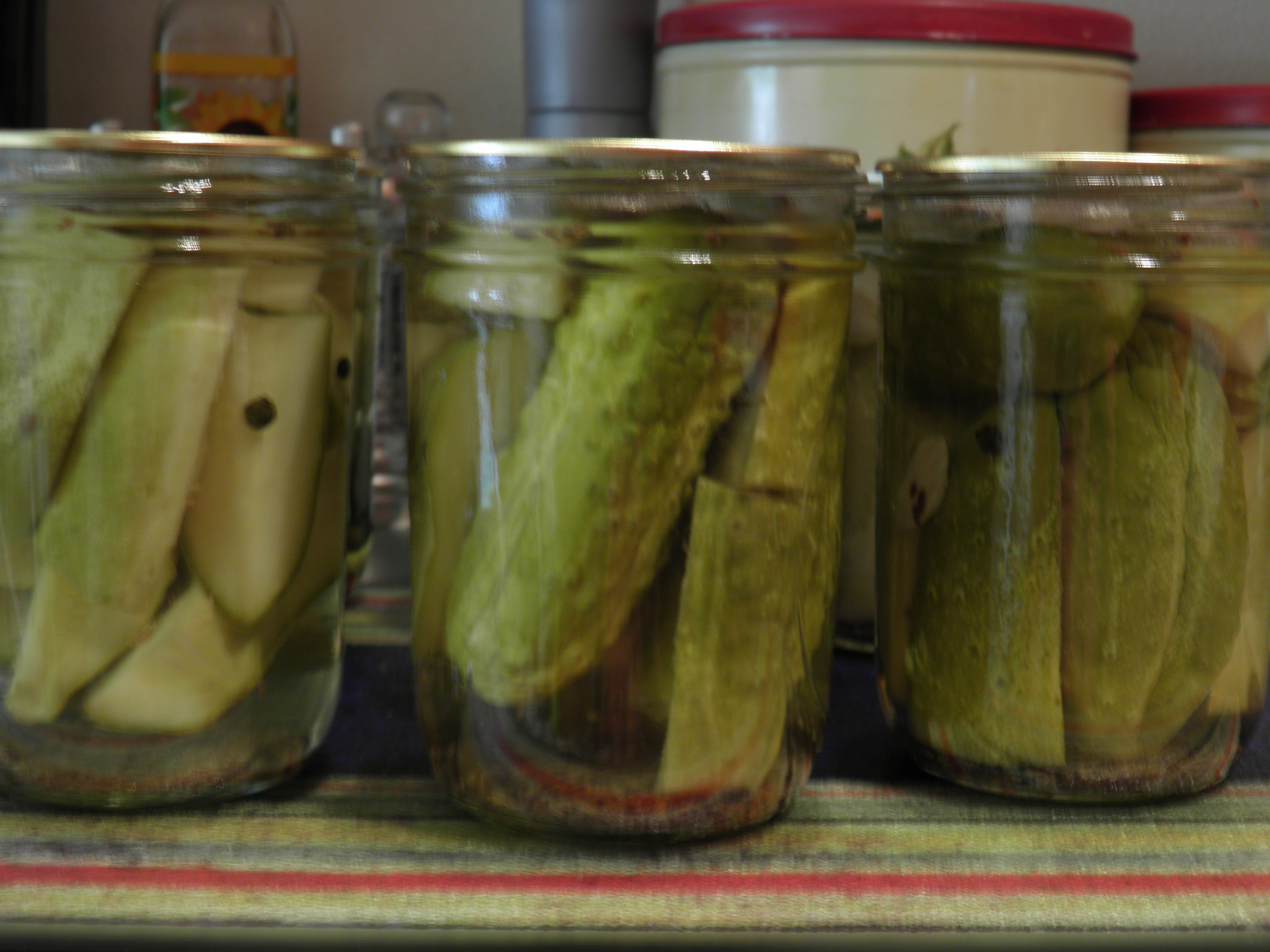 Processing time: Processing time refers to the time the food item spends immersed in a boiling water bath (or fully charged pressure canner). That’s why you have to count the time from the moment the water returns to a boil after the jars go into the canner. The original Kosher Dills recipe, which I got from my mother, who got it from a friend when I was a teenager, and which has been used in my family for 40 years, called for no processing. That’s right. You just covered the cukes in the boiling brine, slapped those hot flats on, screwed down the rings really tight, and put the jars away once they’d cooled. The jars weren’t supposed to seal because the brine is supposedly acidic enough and salty enough to kill off any bad bacteria, and botulism needs an air-tight environment to germinate. I ate pickles and sauerkraut made this way for at least ten years. Then I had children, one of them with a sour tooth, and suddenly, this method didn’t seem so safe.