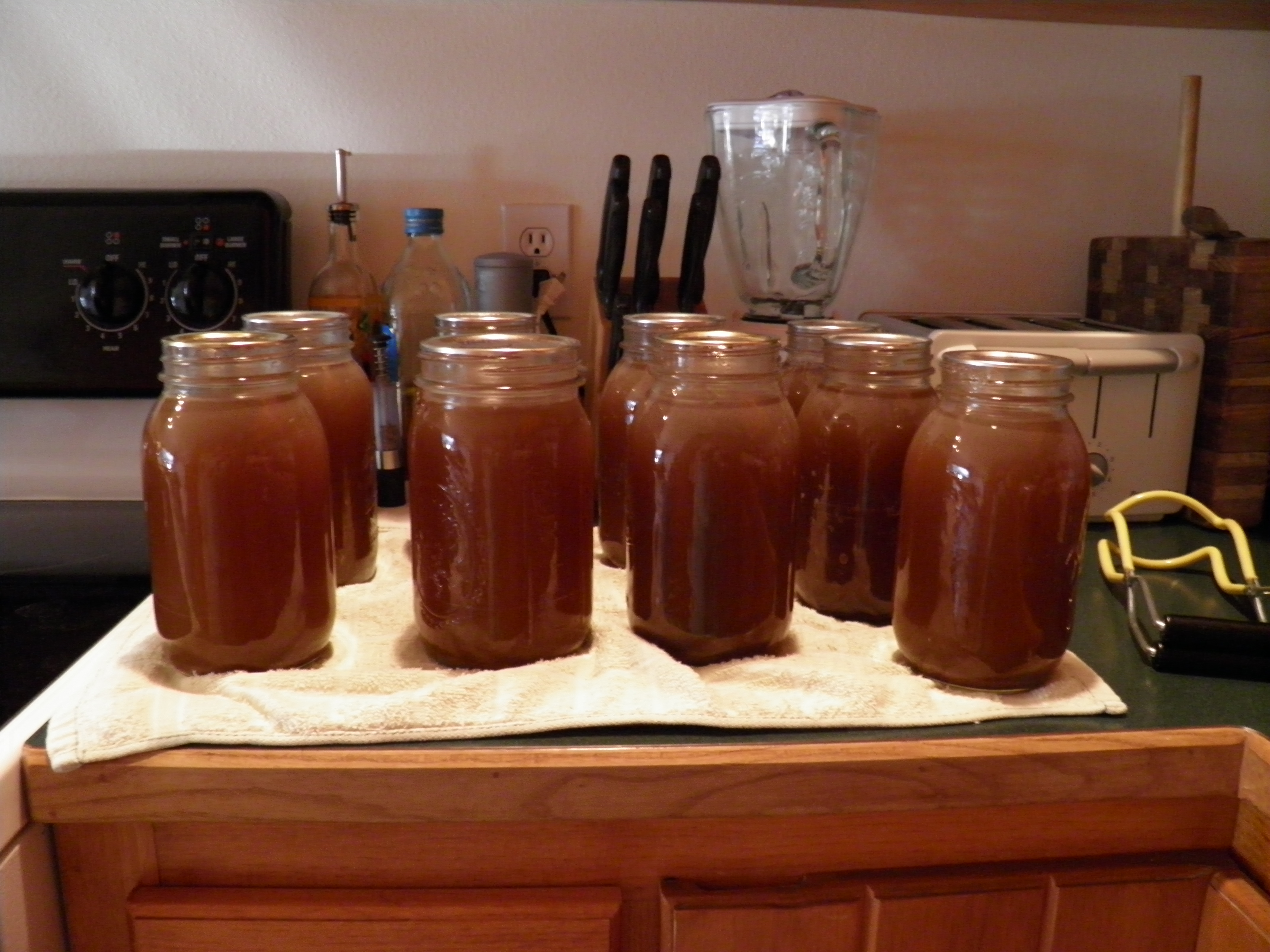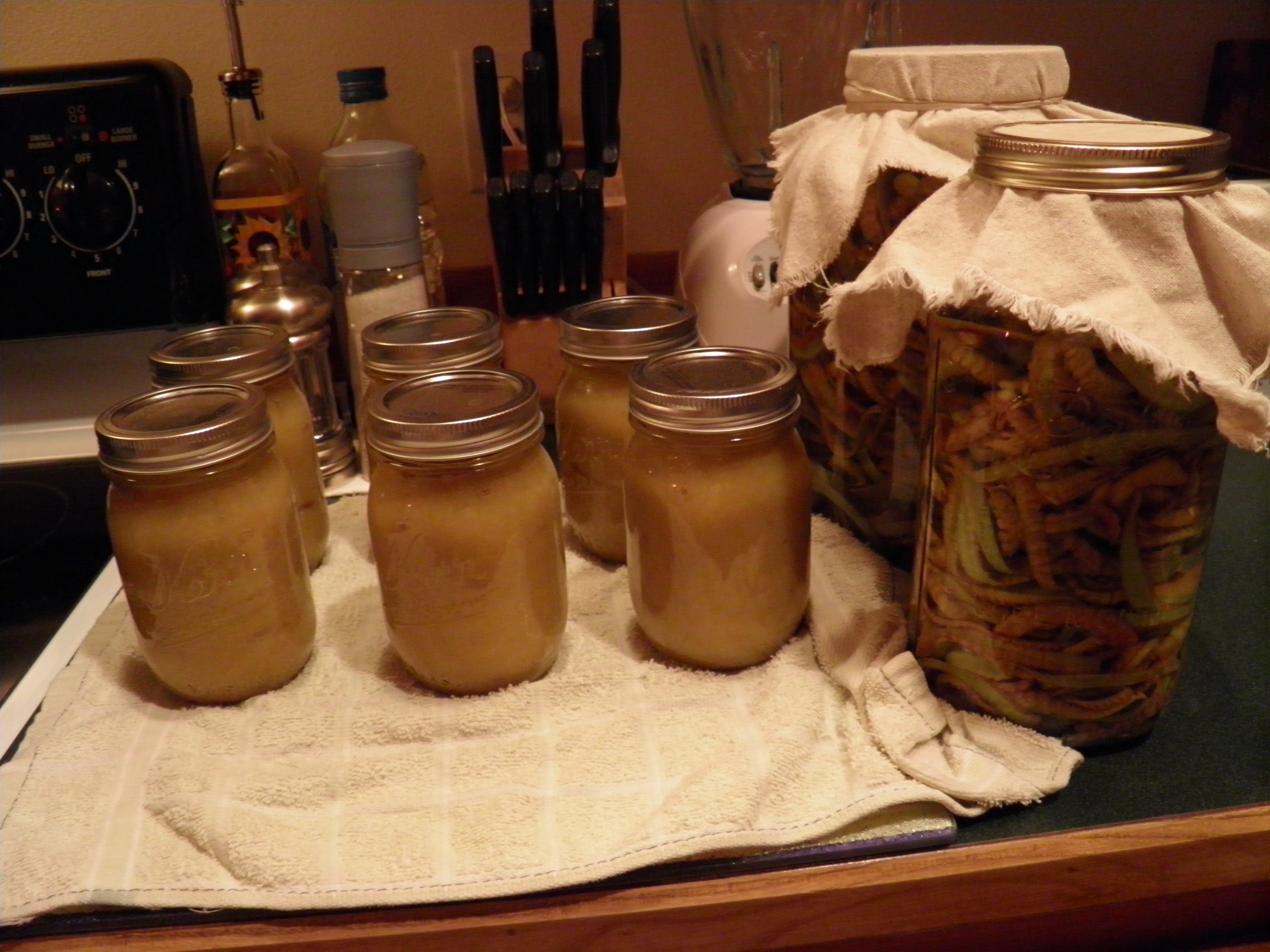 Finally, pear butter, which took two days. My hands were so tired, and the right one so swollen from canning three-in-one pears the day before, that the final box of very ripe, bruised, and worm-damaged pears had to be processed simply. Pear butter was the answer. It could have been pear sauce, but I knew that I would be so slow in getting the pears cut up that they would darken more than I’d want for sauce. So butter it was, since it cooks for a long time and darkens as it cooks.