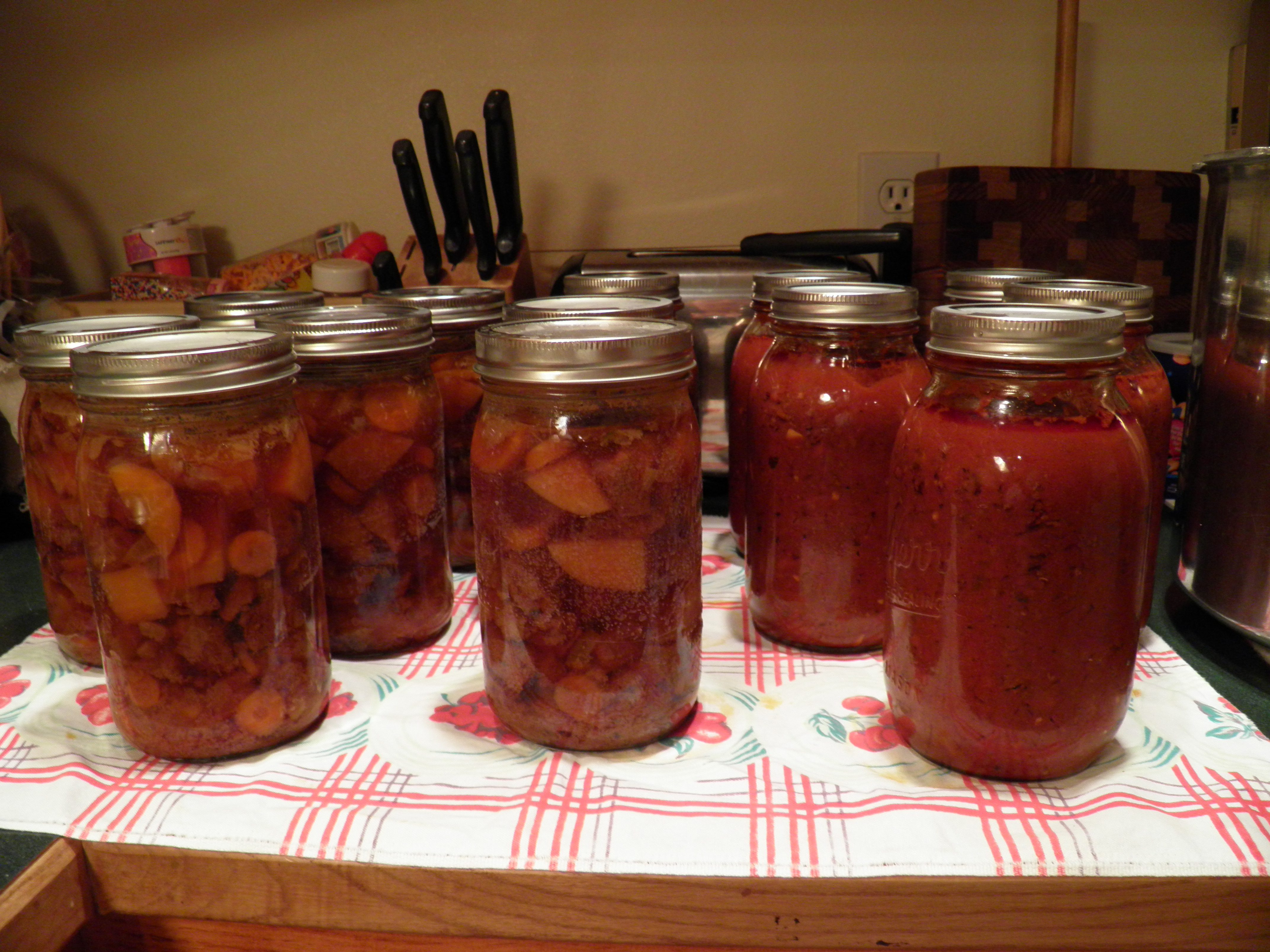 Bring all ingredients to a simmer over medium heat in a large, oven-safe pot. Bake in 300 degree oven until thick and reduced by one-third to one-half. You can do this in a crock pot; many people do, but I don’t think the crock pot gives the same flavor that roasting in an open pan in the oven does. But it’s up to you which way you want to cook your butter down. I don’t recommend boiling it down on the stove; both pear and apple butters are prone to scorching when cooked on the stove top, although it is faster. Typically, I cook my butters down for about 18 hrs, part of that time overnight, when I’ll lower the temp on the oven to 225 degrees. Then when I get up in the morning, if it’s not quite ready to can, I’ll raise the temp back up to 300 while I get the canner and jars ready. Usually, it’s ready by then. When the butter is thick and dark and tastes rich and spicy, and it will mound in a spoon, it’s ready to can.