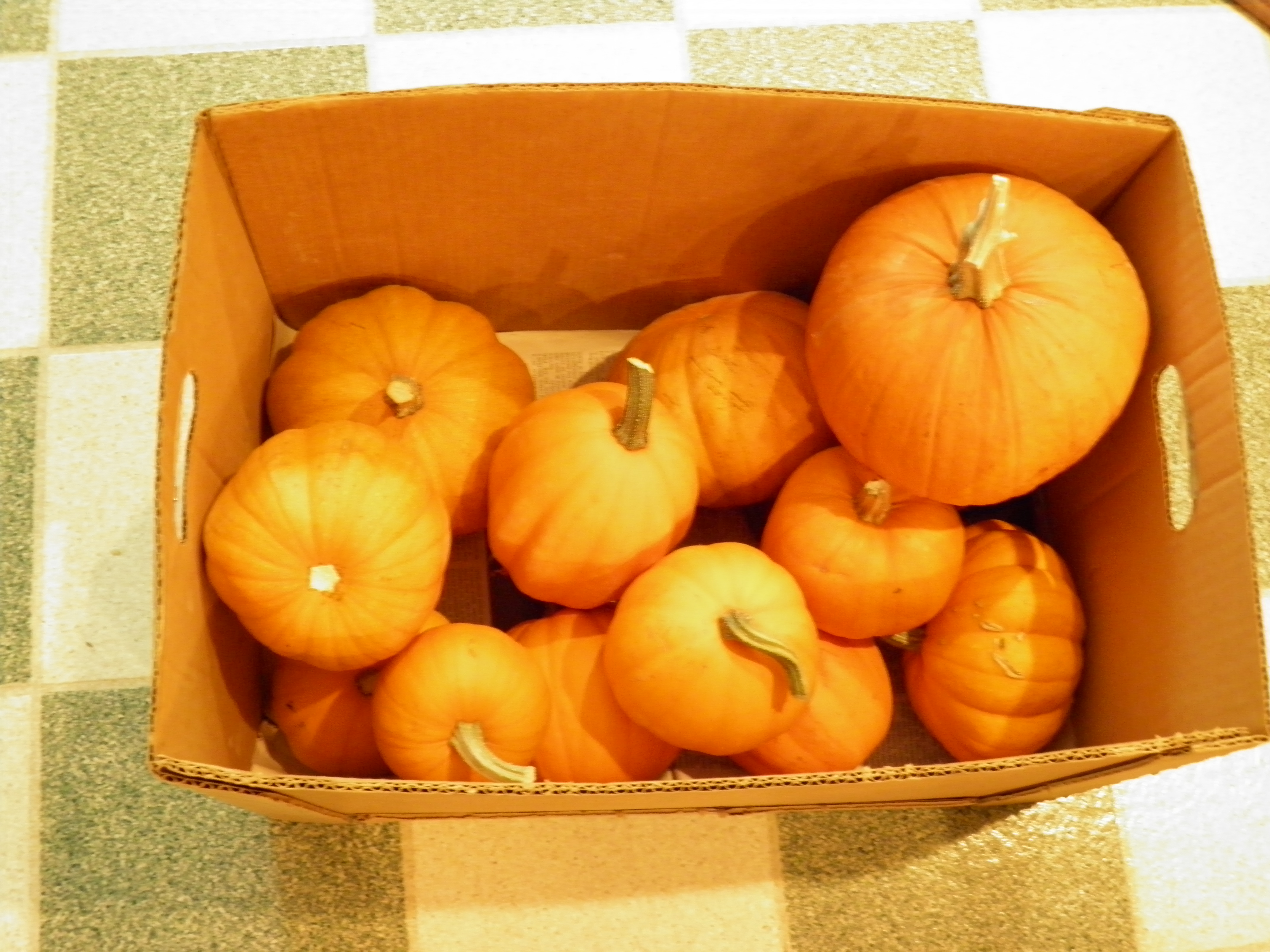 The photo below was taken on May 8, 2013 of the box of pumpkins I had left from the 2012 growing season. (I didn’t weigh them, but I must have grown about a hundred pounds of pumpkins and squash in 2012.) These were still sound! (Yes, I think that fact deserves an exclamation point, maybe two.) In March, I had taken out those that were left and had given them another wipe down with a vinegar wash–just being proactive with possible mold. In May, I decided it was time to roast and puree what was left and freeze my puree in bags, so now I have pumpkin puree all ready for this fall’s pies, which is fortunate because I didn’t get many pumpkins this year. Just another lesson from the garden: this year’s bounty may turn to next year’s dearth, so preserve while you can.