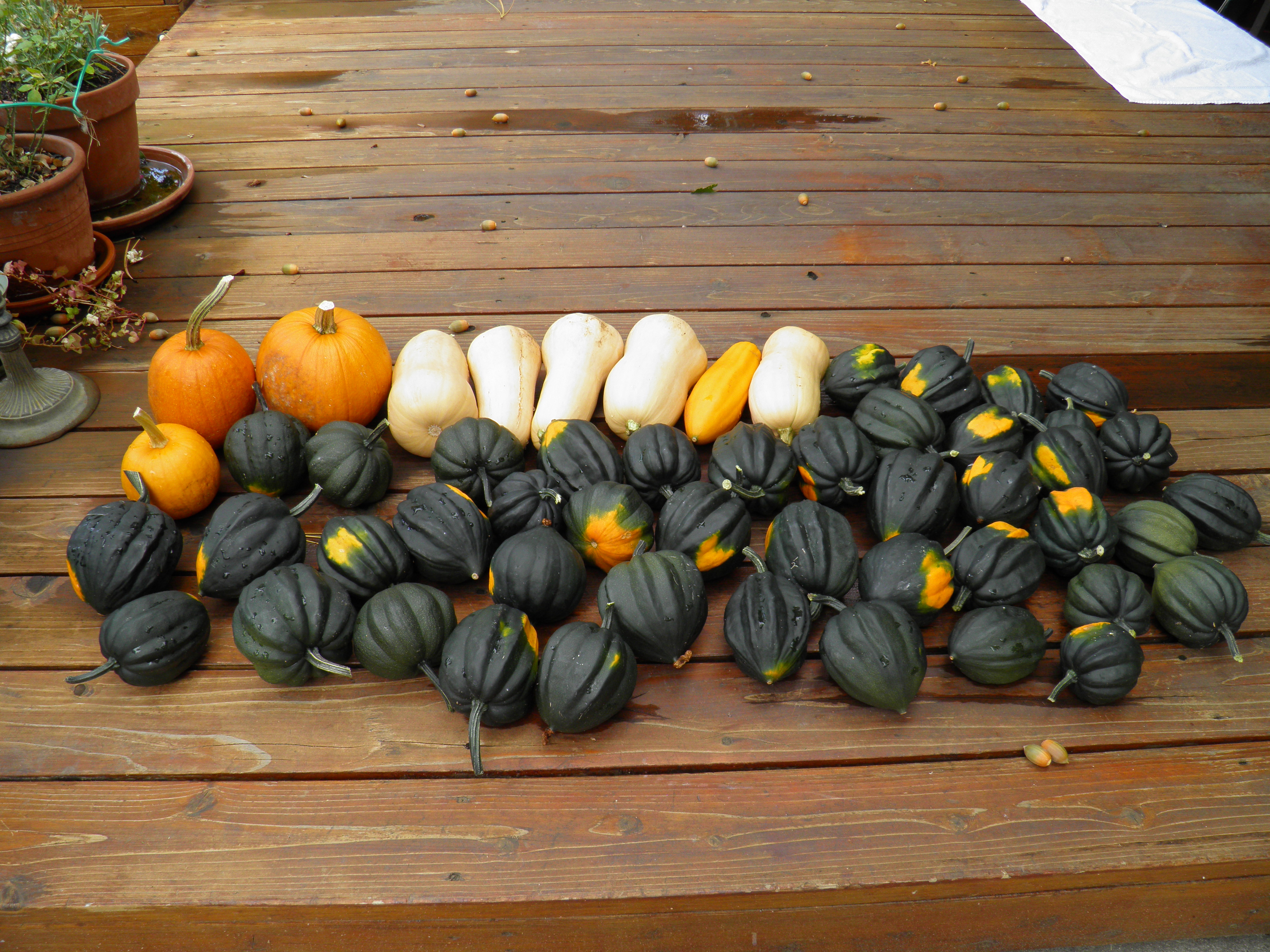 I like to grow acorn, butternut, and pie pumpkins. I have tried other squashes, but these are my favorites, and in a garden the size of mine, space is a factor. I try to use up my butternuts first because they have the thinnest skins and will usually spoil before pumpkins or acorn squash.