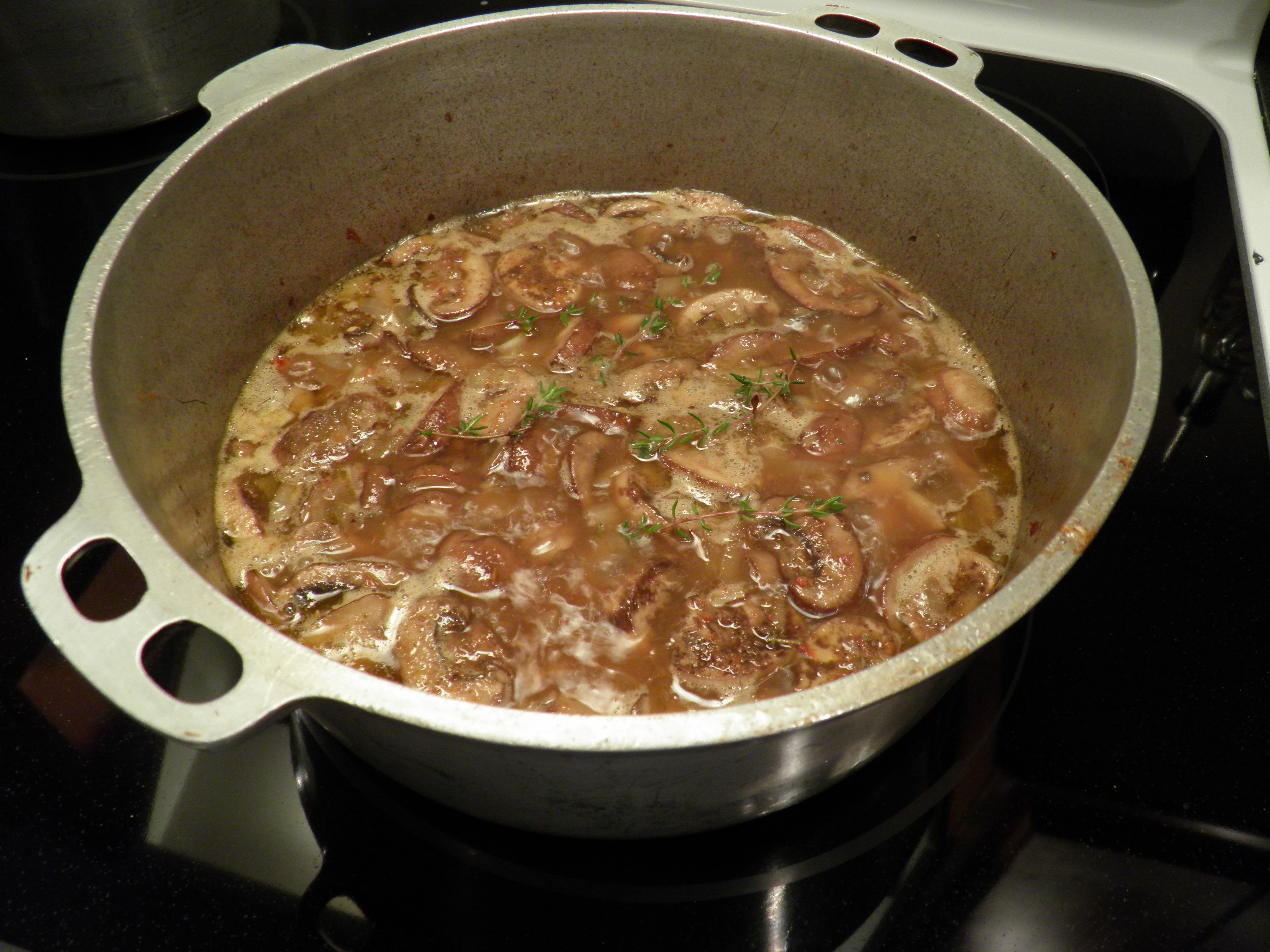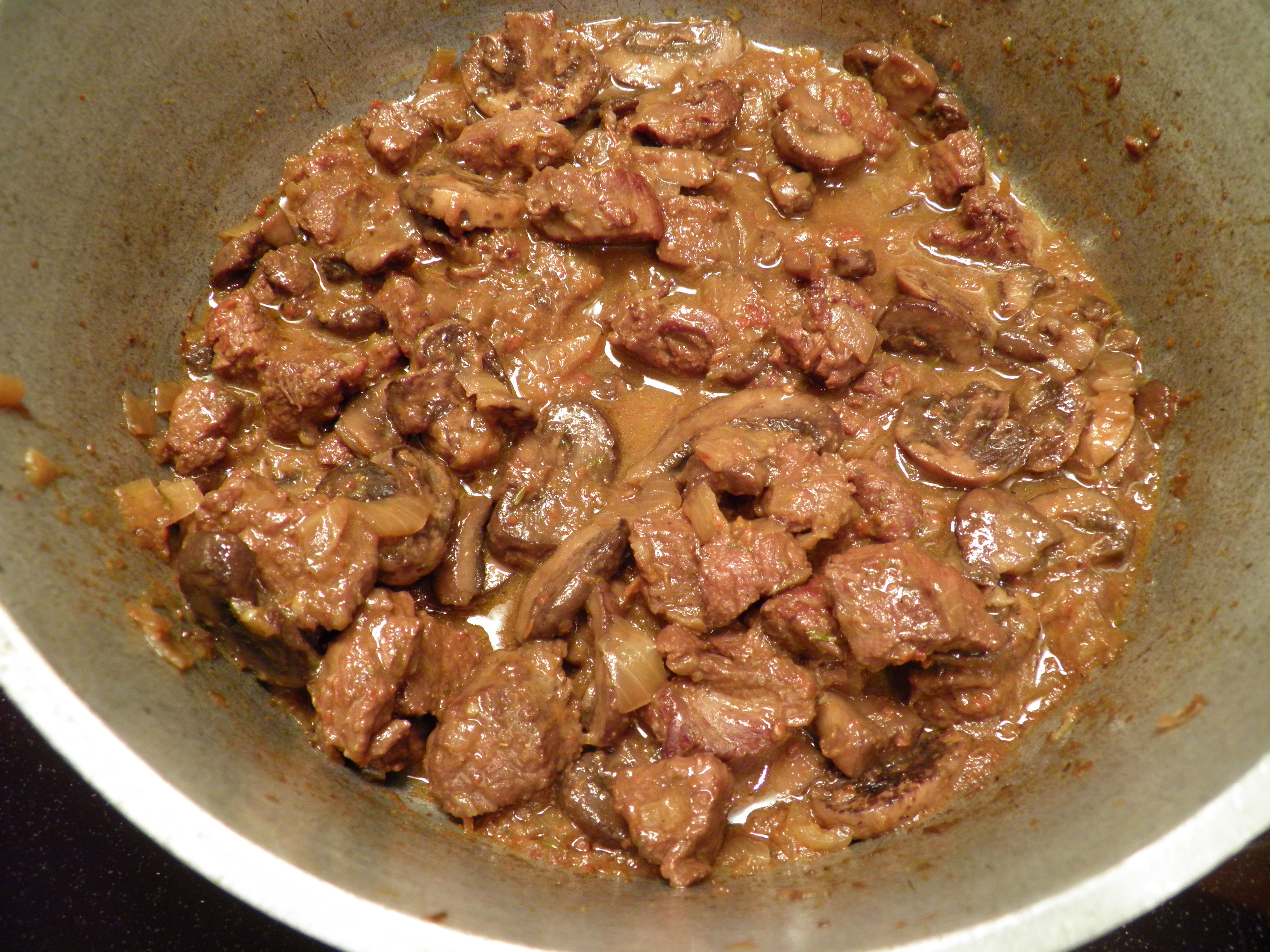 Reduce heat to medium low (you want a good simmer) and cover with the lid, leaving it cracked just a bit to let the sauce reduce. Keep an eye on this, and add a little more stock if it cooks too dry, then cover tightly and reduce heat to low to hold it. Simmer until meat is tender, about 1 ½ – 2 hours, and there is still enough sauce to coat the meat and mushrooms. This should be saucy but not watery, and now is the time to taste the sauce for seasoning, adding more salt if necessary. You can see from the photo below what the consistency of the sauce should be after it reduces and just before serving.