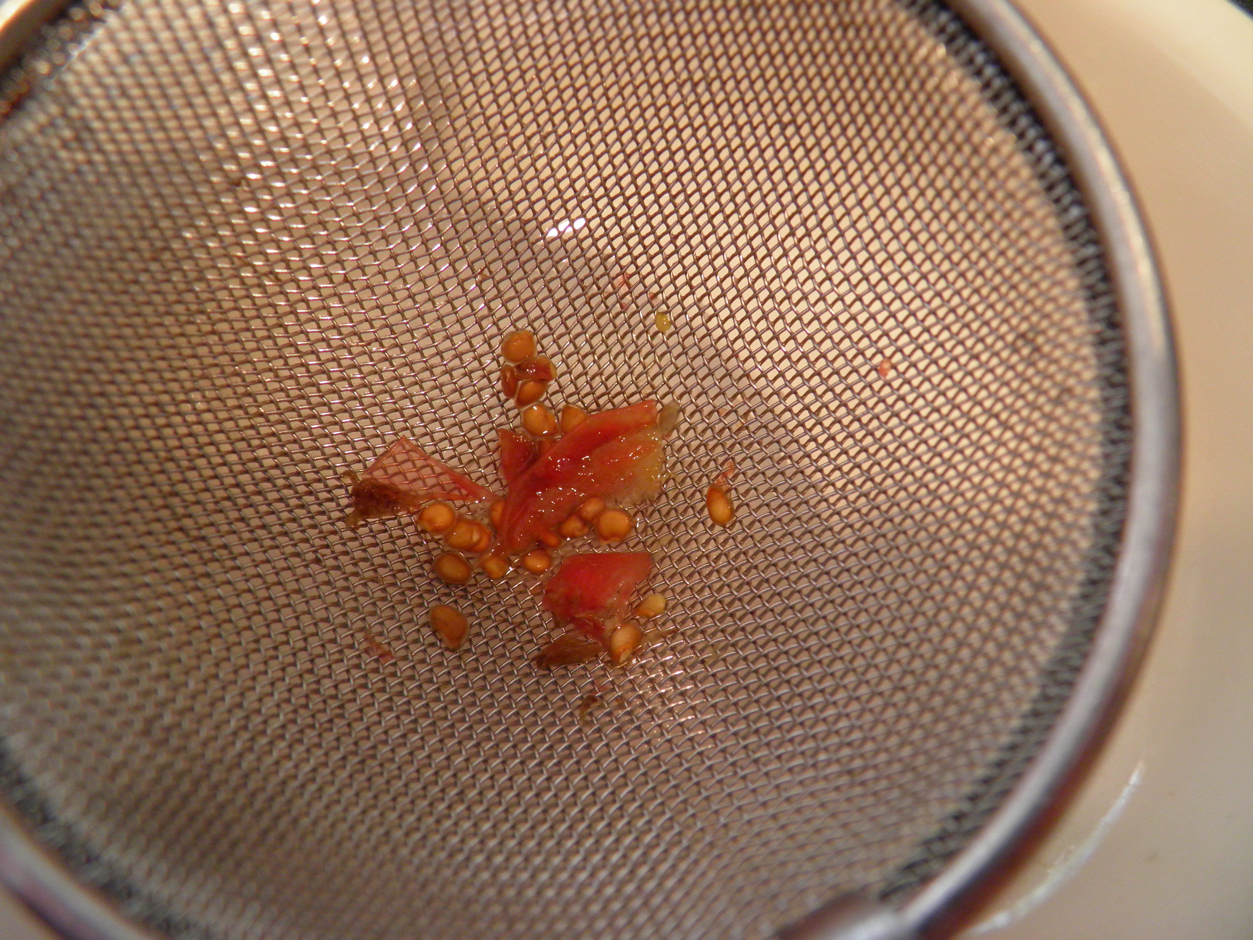Fermentation of the seeds takes a few days, but this kills off bad bacteria that could affect the seeds’ sprouting capabilities. It also helps kill off any diseases or viruses the tomato plant and fruit might have had. (Heirlooms are susceptible to various diseases that many hybrids were bred to be resistant to.) I wait for a little mold to appear in the bowl, and then I pour the seeds and liquid into a fine mesh strainer, rinse the seeds well, and dump the contents onto a piece of labeled waxed paper.