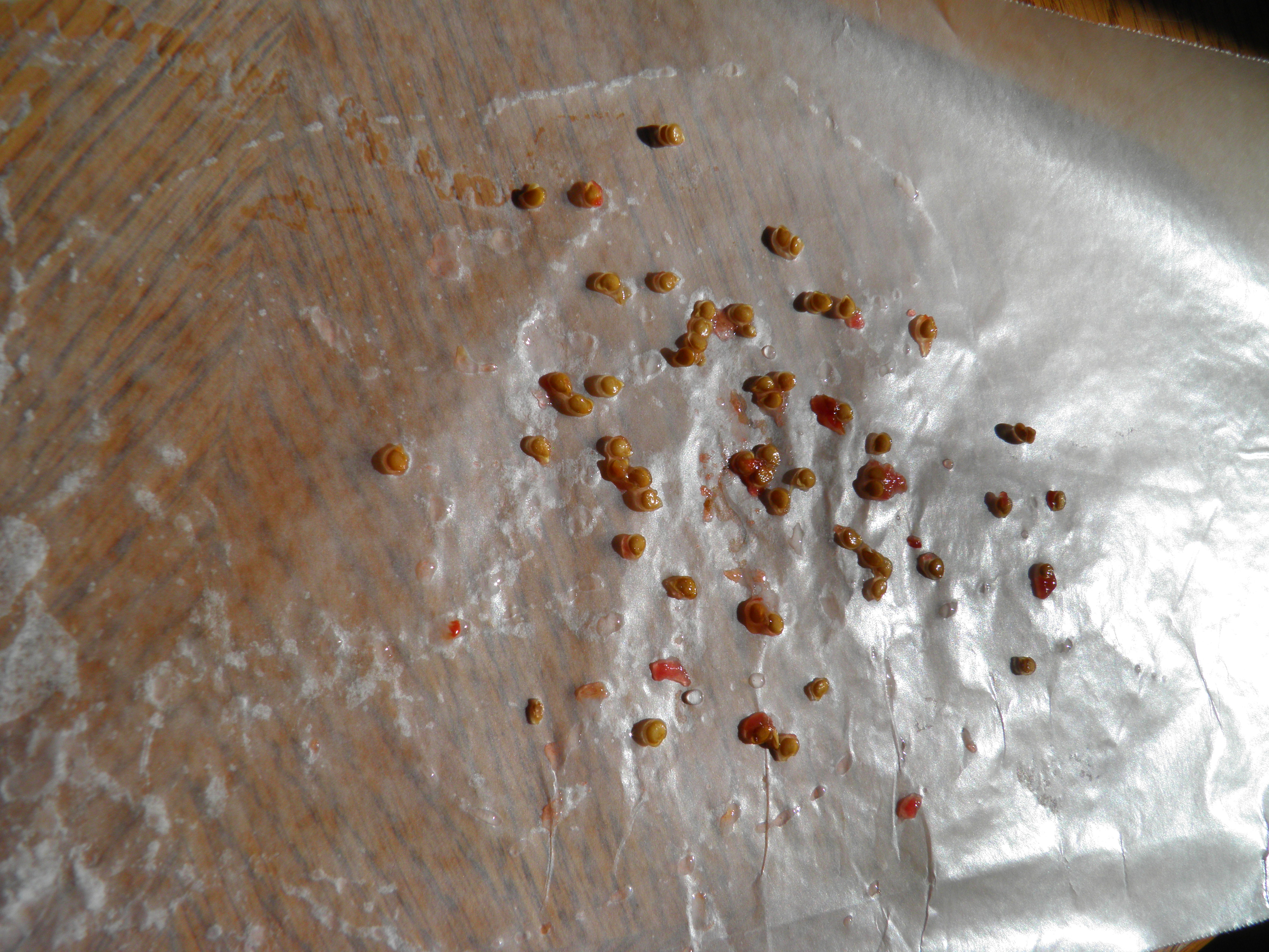 At this point, it’s easy to pick out any skin or flesh that might have adhered to the seeds when they were placed in the bowl. Spread the seeds out so they’re not too clumped up and will dry faster. I let the seeds dry for two or three days, until they pop right off the waxed paper when it’s jiggled.