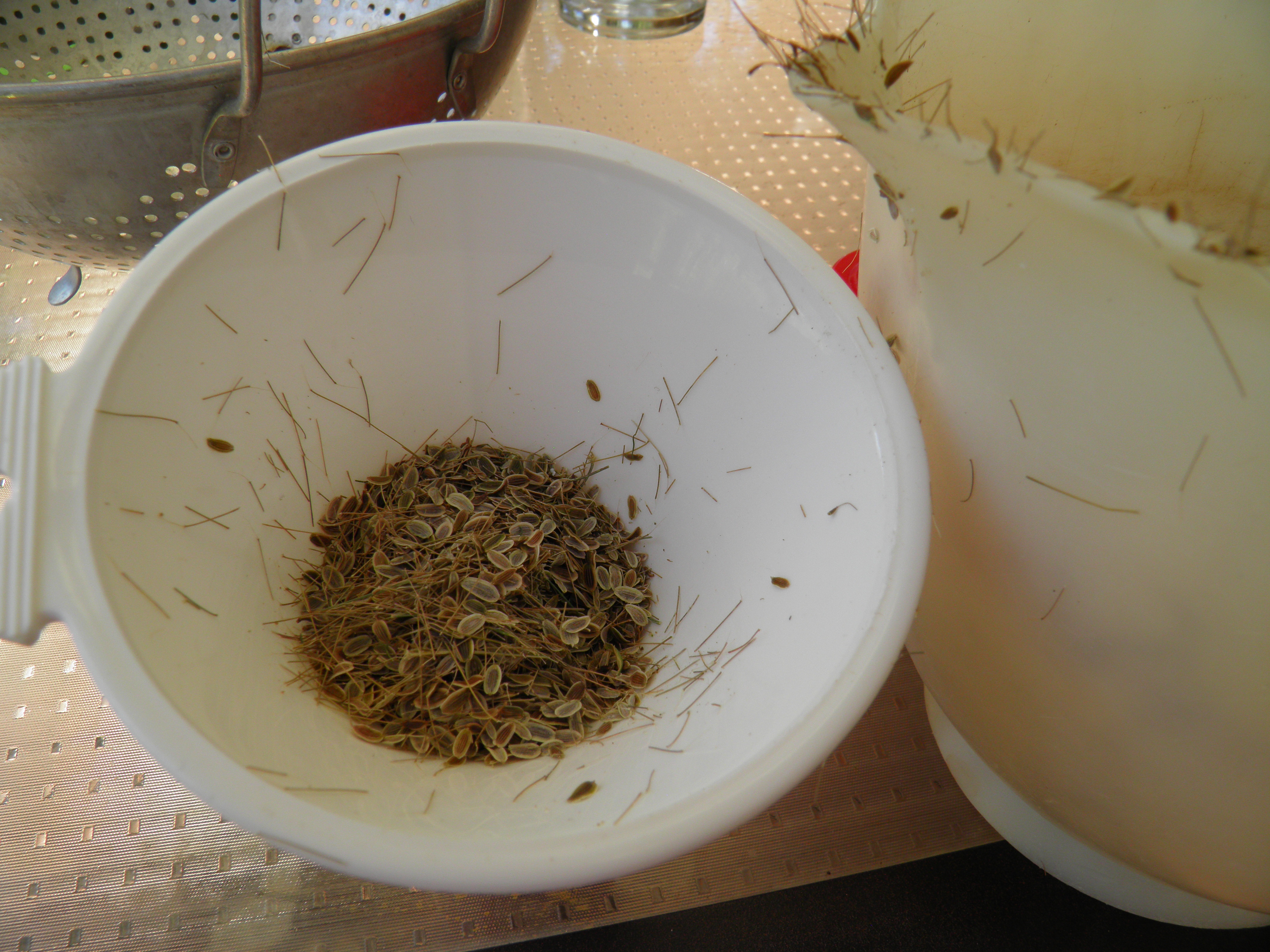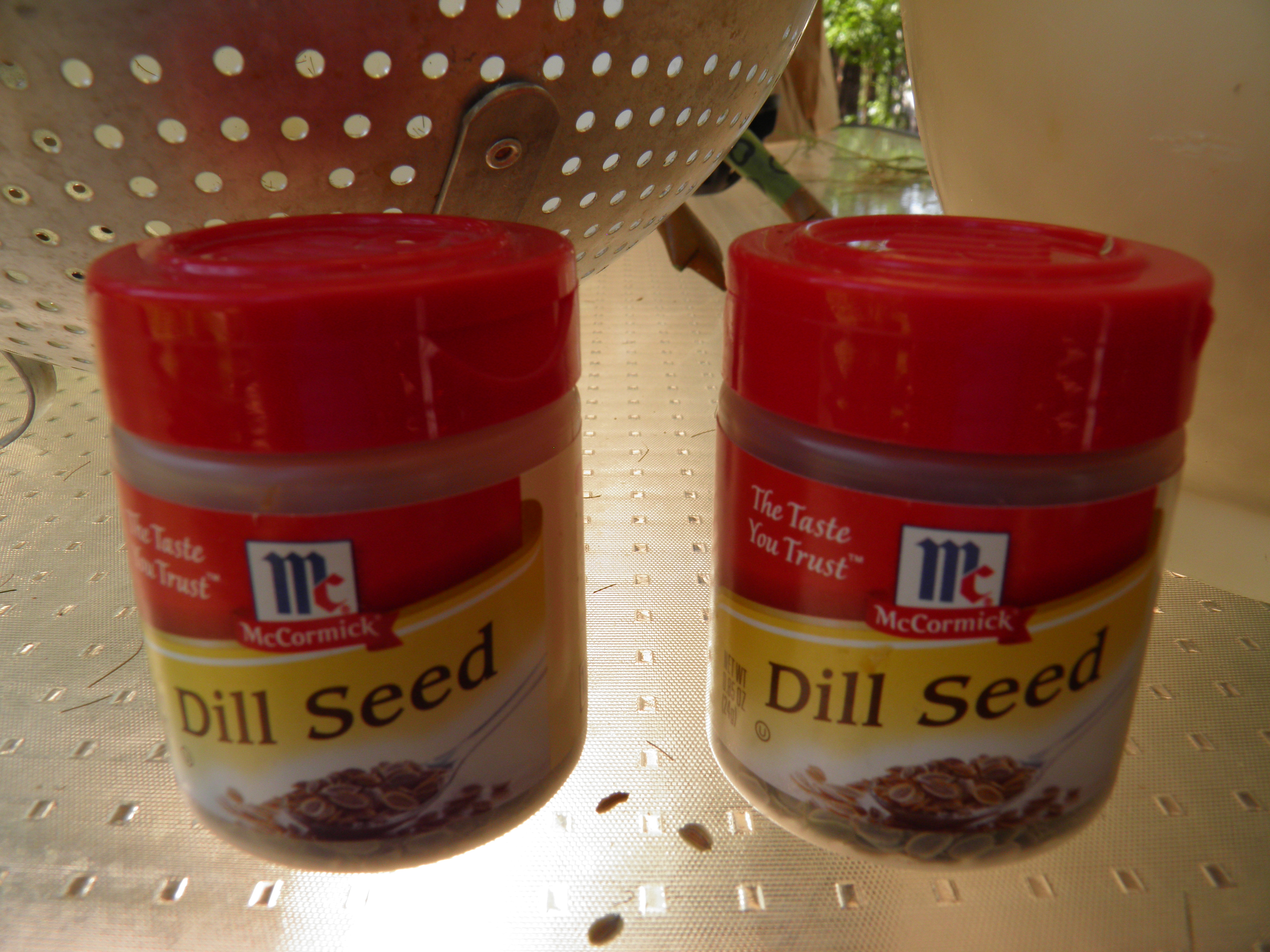 The best way to save dill seeds is to put a large, paper grocery bag under the plant and clip the umbel directly into the bag. I do this when just a few of the seeds have turned brown and the rest are swollen but still green. Leave a long stem, and drop the umbel in upside down. The seeds will continue to ripen on the stem. Staple or paper clip the bag closed to keep out dust, and let it sit somewhere out of the way. When all the seeds are dry, pull out one stem at a time, breaking off the dry seeds into the paper bag. When all the seeds are off the stems, pour them into a colander or sieve to separate seeds from stem pieces. Then they go into jars (I have saved old dill seed jars from the grocery store), all ready for next year’s dilly beans or pickles. I always let some seeds drop to the ground for volunteer plants next year. I seem to have better luck letting the plants self-sow. The seeds know when to sprout in the spring.