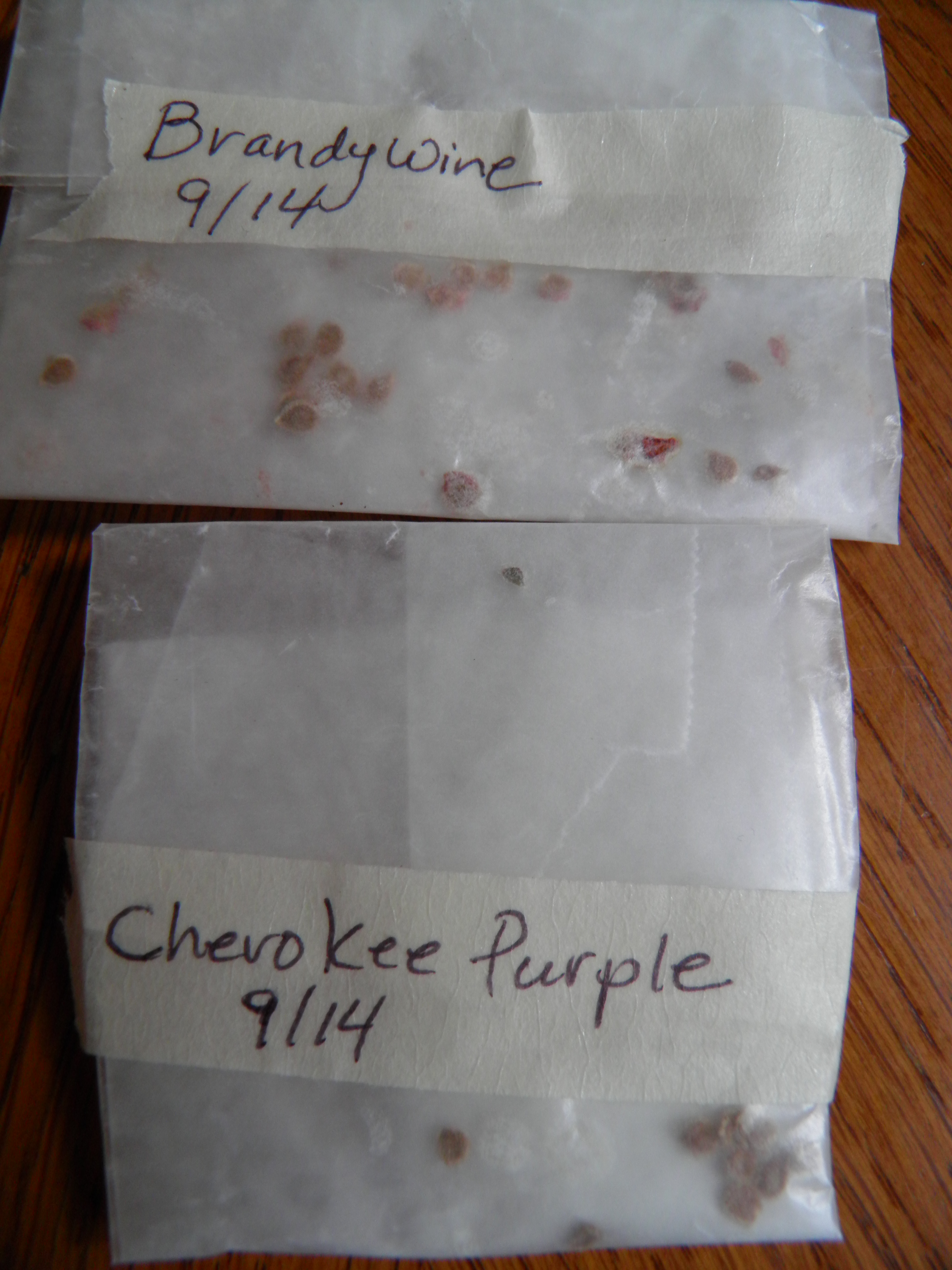 Then I fold the waxed paper containing the seeds into a tight packet, seal it with labeled masking tape, and put the packets into my seed jar. I have a plastic gallon jar that I put charcoal and/or silica packets into along with all the seeds I’m saving. This goes in a cool corner of the laundry room or out in one of the pump houses where it will stay cold but not freeze until I’m ready to plant in the spring.