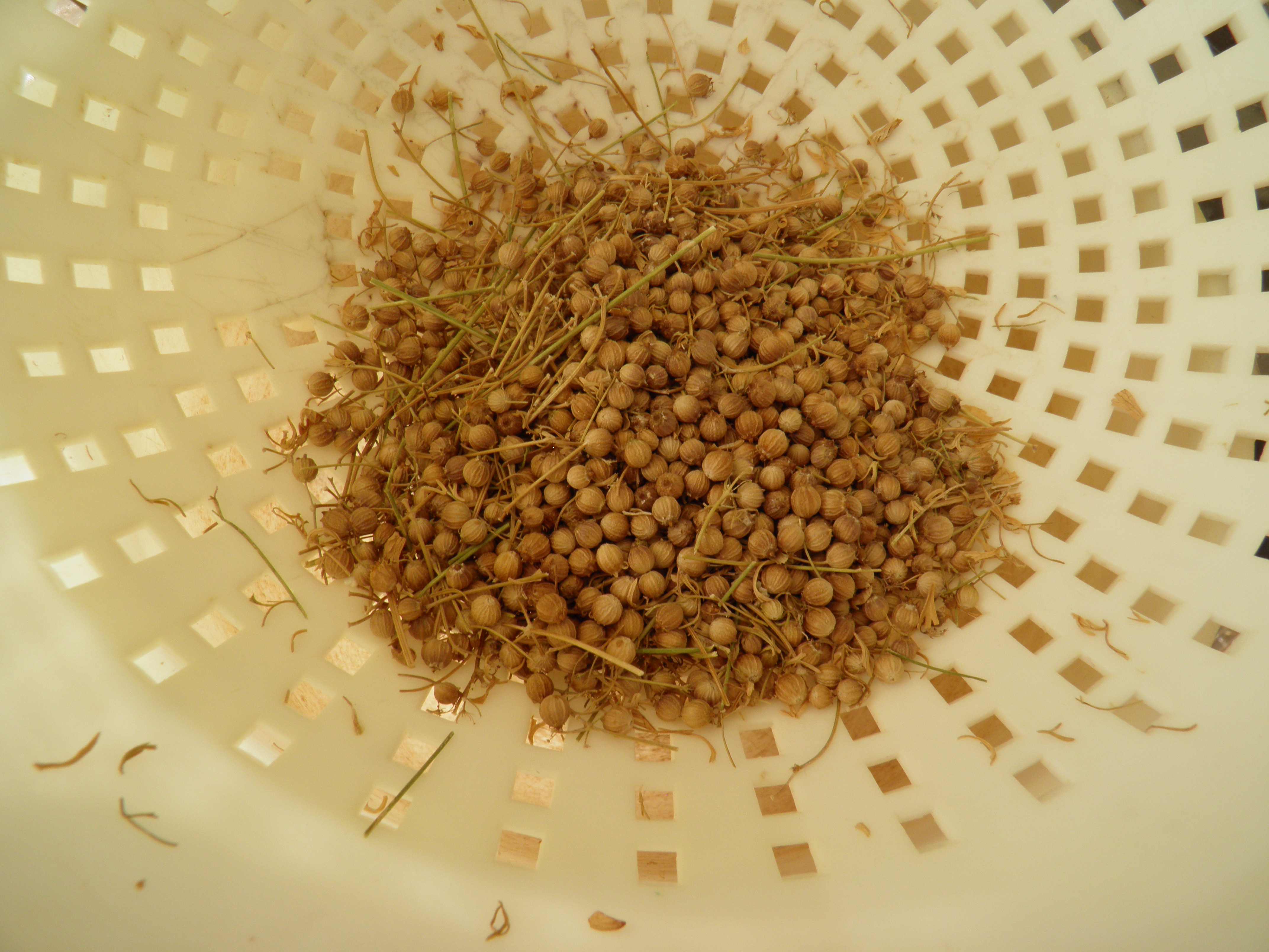 I use the same harvesting method for coriander seeds. Coriander and cilantro are one and the same plant. When the plant is green, before it blooms, it’s called cilantro and is used in salsa and other Mexican dishes. Let it flower and go to seed, and you have coriander. These little round seeds roll around, so you have to be careful not to let any escape! It is easy to grind them yourself in a spice grinder or coffee grinder dedicated for spices. (I have one labeled “Not for coffee!” so my husband doesn’t use it by mistake.) I love ground coriander in lots of dishes, especially my pumpkin/winter squash soup. Freshly-ground coriander is wonderfully aromatic. So if your cilantro wants to bloom, let it. Then harvest the seeds.