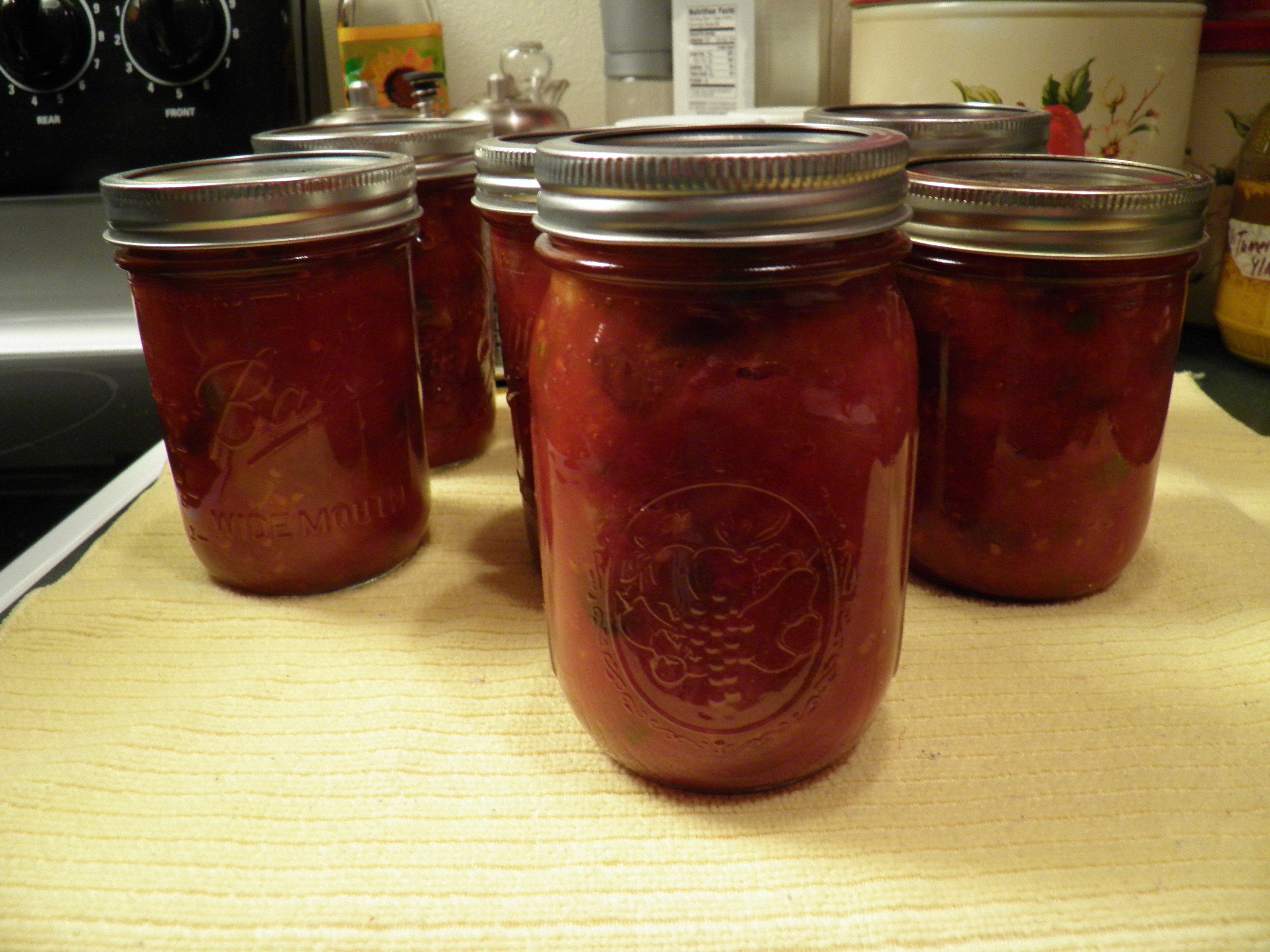 I found this recipe some years ago in my old Ball Blue Book from 1981. I made it back then and haven’t made it since because it requires having apples and tomatoes at the same time. Yes, I could buy either apples or tomatoes, but I like using what’s in season in my garden. This year, I have lots of both apples and tomatoes at the same time, so I decided to make a batch of this slightly sweet but tangy condiment. I’ve played with the recipe to spice it up a bit, but I’ve been careful to maintain the same ratio of non-acid foods to acid foods and vinegar to maintain a proper balance for water-bath canning.