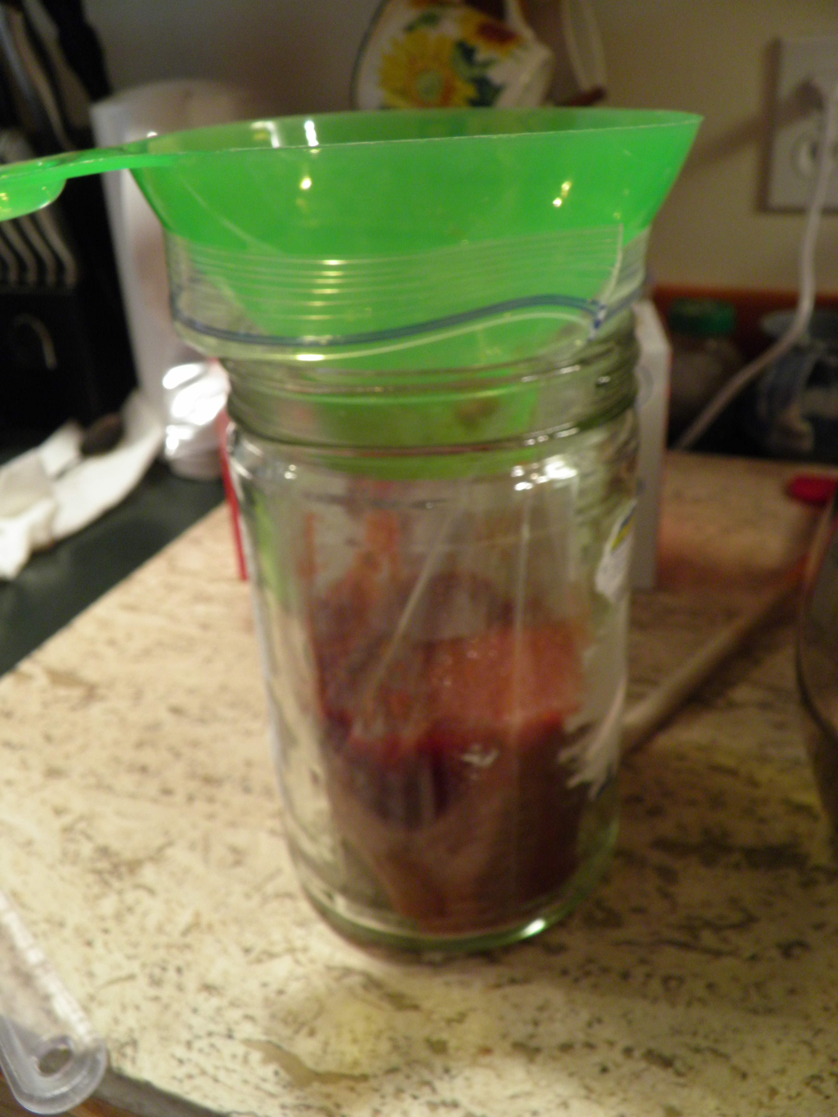 I’m tired by this time of year, and sick of canning, and I’m out of shelf space for full jars (boxes of applesauce, apple butter, green tomato relish, and green tomato marmalade—all the fall canning projects—are reposing under my bed). So I freeze my red sauce in quart freezer bags rather than canning it. Below is a picture of my no-mess method for filling bags. I put a quart freezer bag in a quart jar, then insert a canning funnel into the mouth of the jar, which holds the bag open. This keeps whatever’s going inside the bag from getting all over the zipper closure.