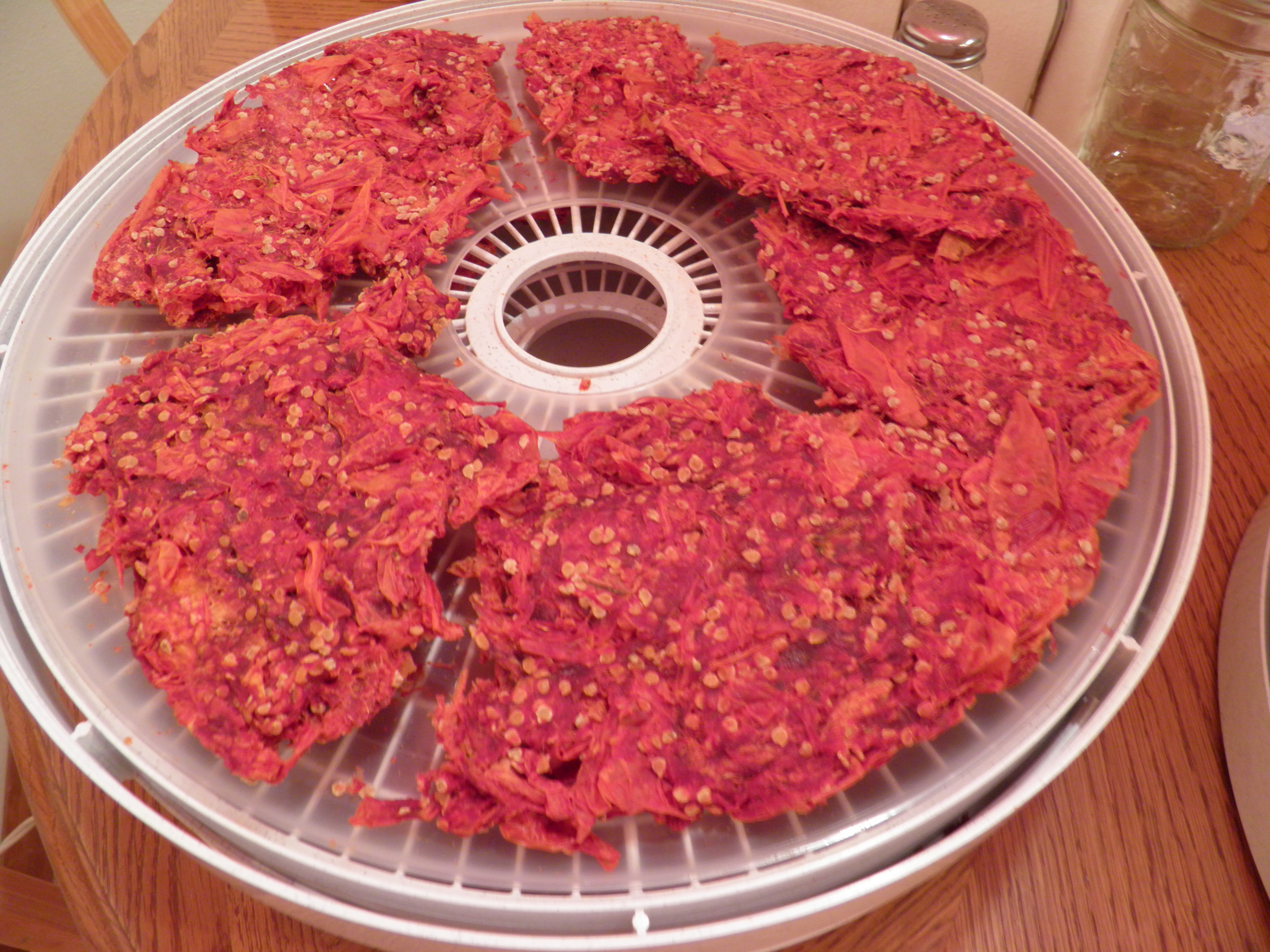 Don’t throw the skins and seeds away after straining! I save skins and seeds, and either spread them on parchment-lined cookie sheets and dry in the oven on low (170 degrees or lower) until crunchy, or spread them on the fruit leather trays in my dehydrator (set at about 135 degrees) and leave them until they’re very dry, and then grind them to powder in the blender. (More about how to use this flavor-packed powder in these posts: Dried Tomato Skin Rub and Pulled Pork, and Braised and Barbecued Pork Spareribs.) I don’t know about you, but I just don’t want to waste a single bit of those wonderful garden tomatoes. This powder can also be added to soups and stews for an extra punch of flavor.
