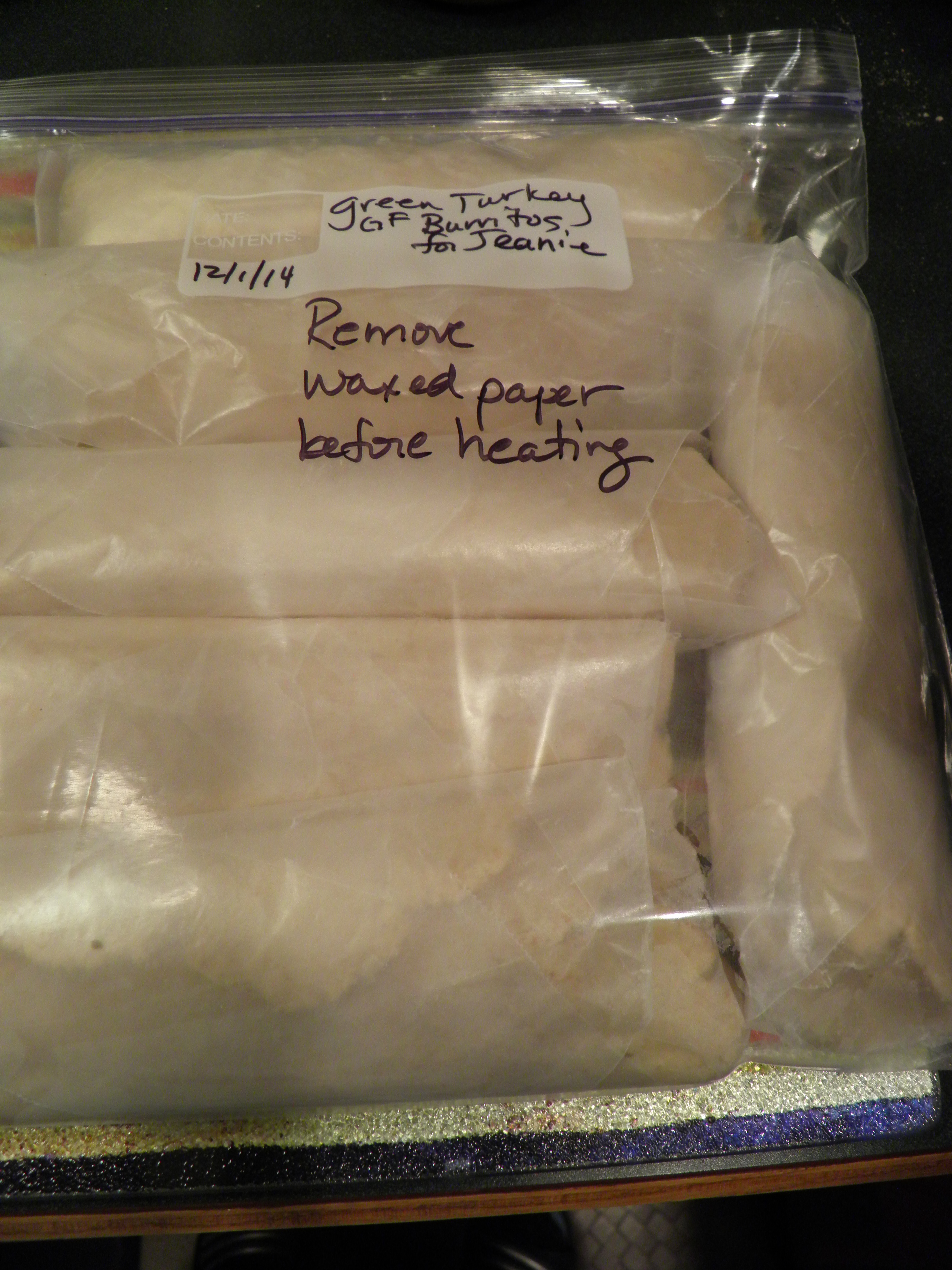 I make gluten-free tortillas for myself, and use store-bought flour tortillas for Dennis, and I make up a bag for each of us.  The burritos are wrapped in waxed paper, which doesn’t stick to the tortillas when frozen like plastic wrap sometimes does, but which must be removed before heating.  I write a note on the bag to this effect, because I don’t trust Dennis to remember if I just tell him!