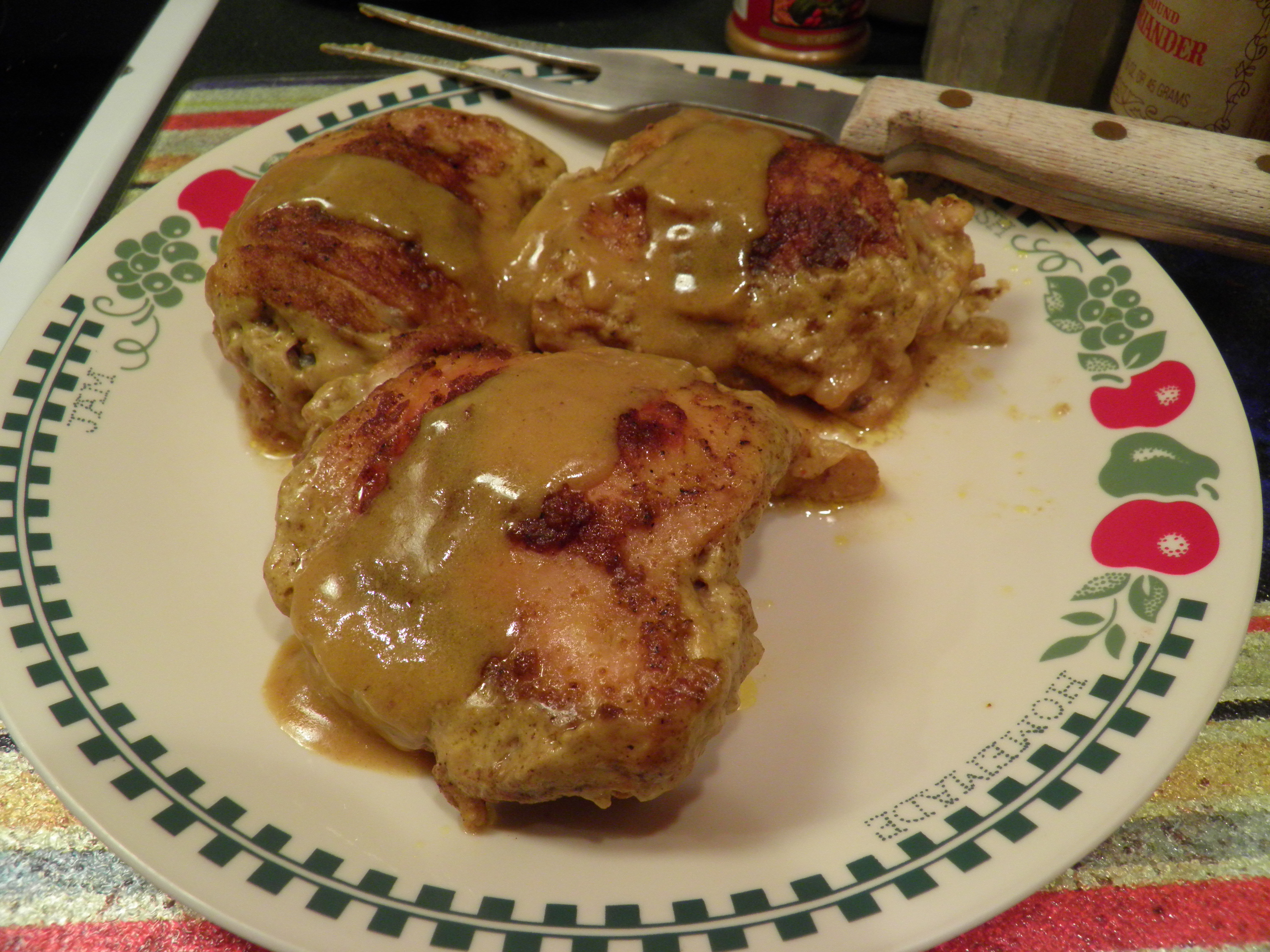 Remove chicken from pan. Stir 1-2 tablespoons of flour (I use brown rice flour) into pan juices. Whisk over medium heat until boiling. Boil and stir one minute to thicken sauce. Serve sauce over chicken thighs.