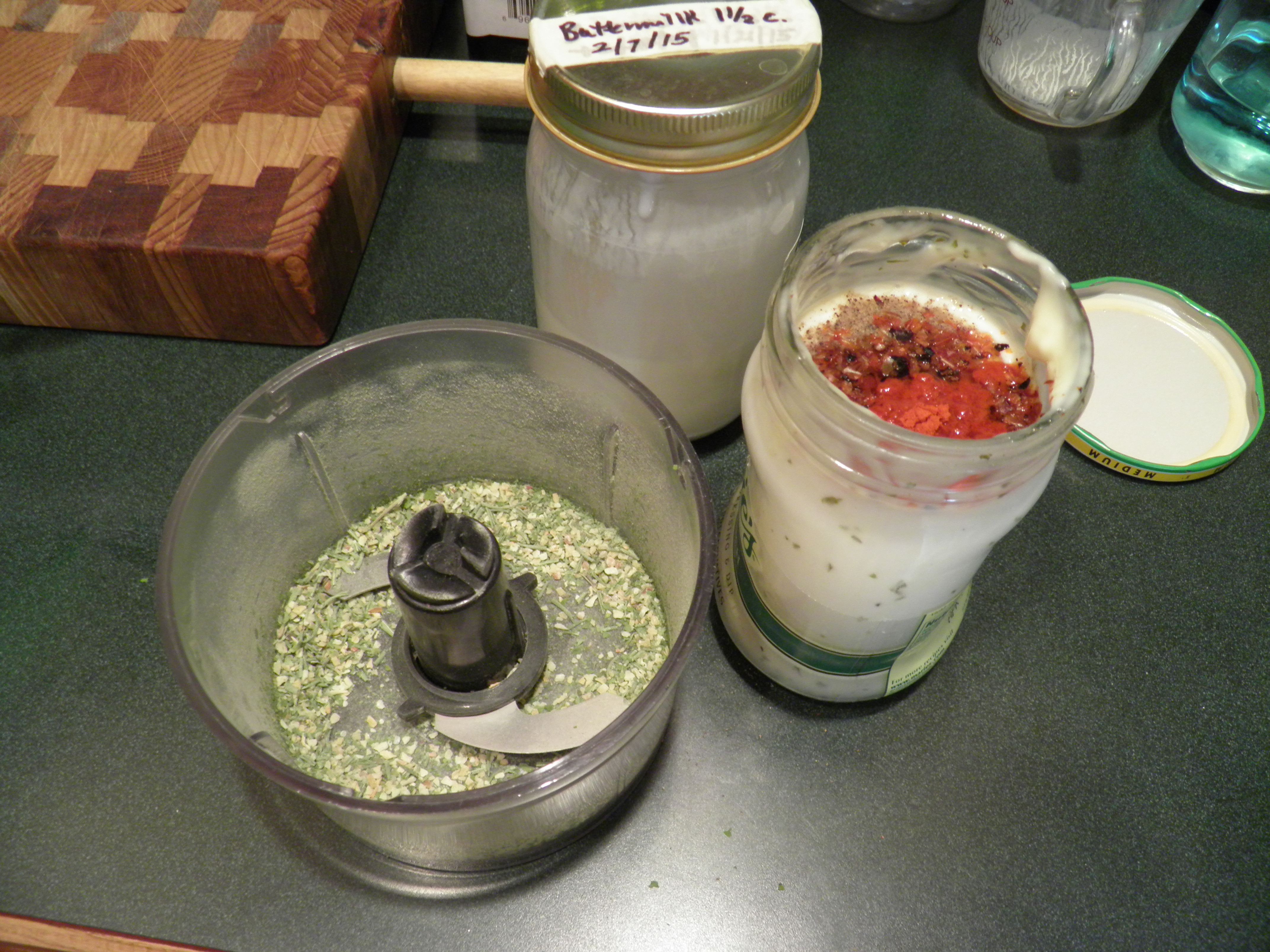 My husband is addicted to ranch salad dressing. I like it too, but I don’t like all the extra junk they put in the stuff sold in stores: soybean oil, for instance. I stay away from soybeans because they are treated with glyphosate herbicides. So I’ve been working on a buttermilk ranch-style salad dressing that is made with the freshest, healthiest possible ingredients. These include homemade buttermilk, cultured at home and full of good probiotic organisims (make it from organic milk for best health), homemade mayonnaise (also made with healthier, higher grade oils than the commercially-produced mayos), and home-grown and dried herbs. Now, you can make this dressing with store-bought buttermilk, store-bought mayo, and store-bought herbs, and it’s still going to taste better and be better for you than any ranch dressing you buy in a store. I hope you’ll give this a try.