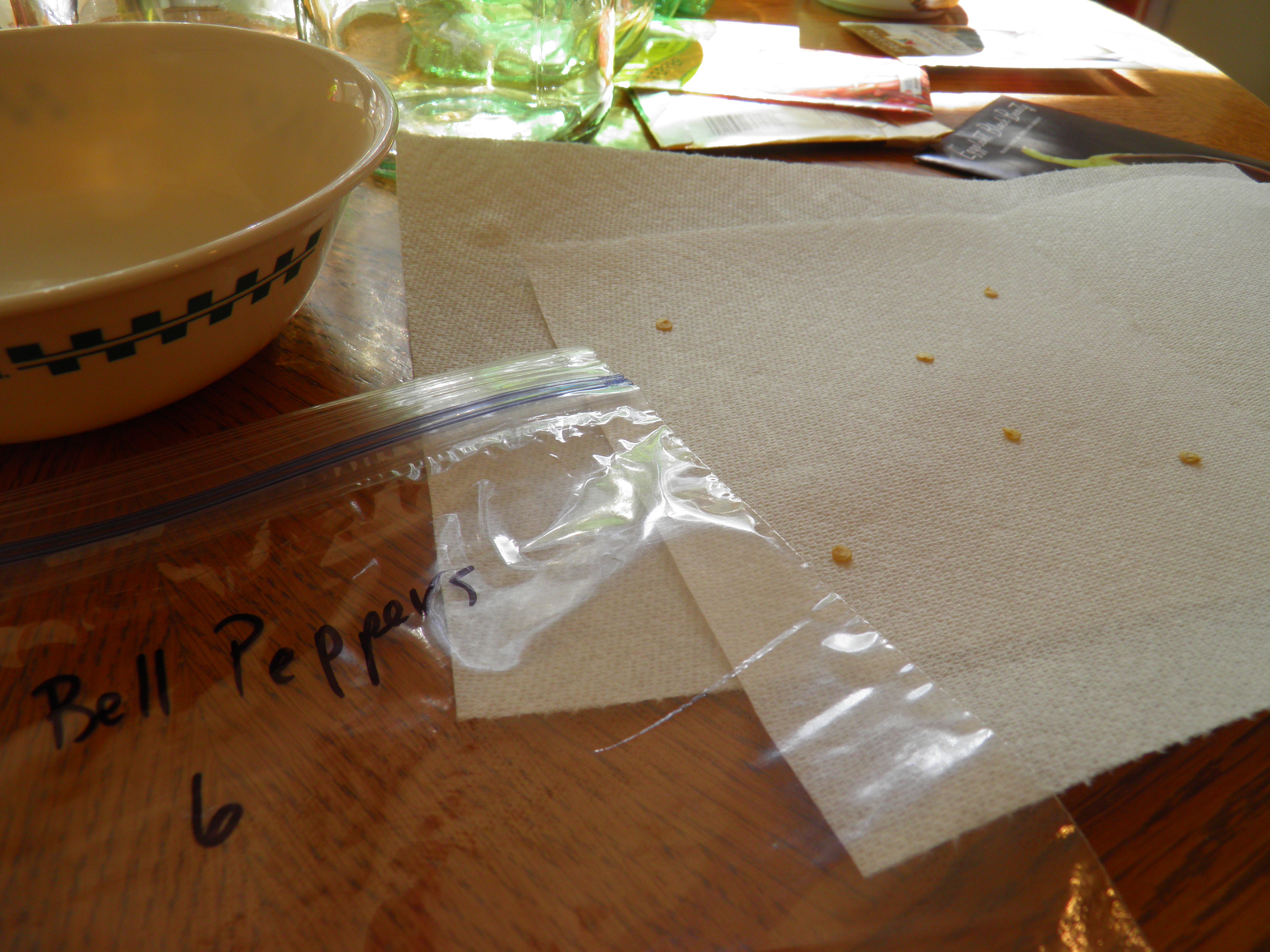 First, I germinate my slowest seeds in the house, near the heating stove. The temperature by the stove is about 75-80 degrees, which is perfect for the slow-to-germinate seeds like peppers and eggplant. I decide how many of each kind of plant I want to grow, and I place my seeds on damp paper towels, spaced out with several inches between each seed, one kind of seed to a towel, of course, and then fold the towel over and place it in a new, plastic zipper closure sandwich bag. I label the outside of the bag with a Sharpie, writing the type of seed/plant and the date I started them. All the sandwich bags go into a clean, larger zipper bag, and that is wrapped in an old towel and placed by the stove to warm.