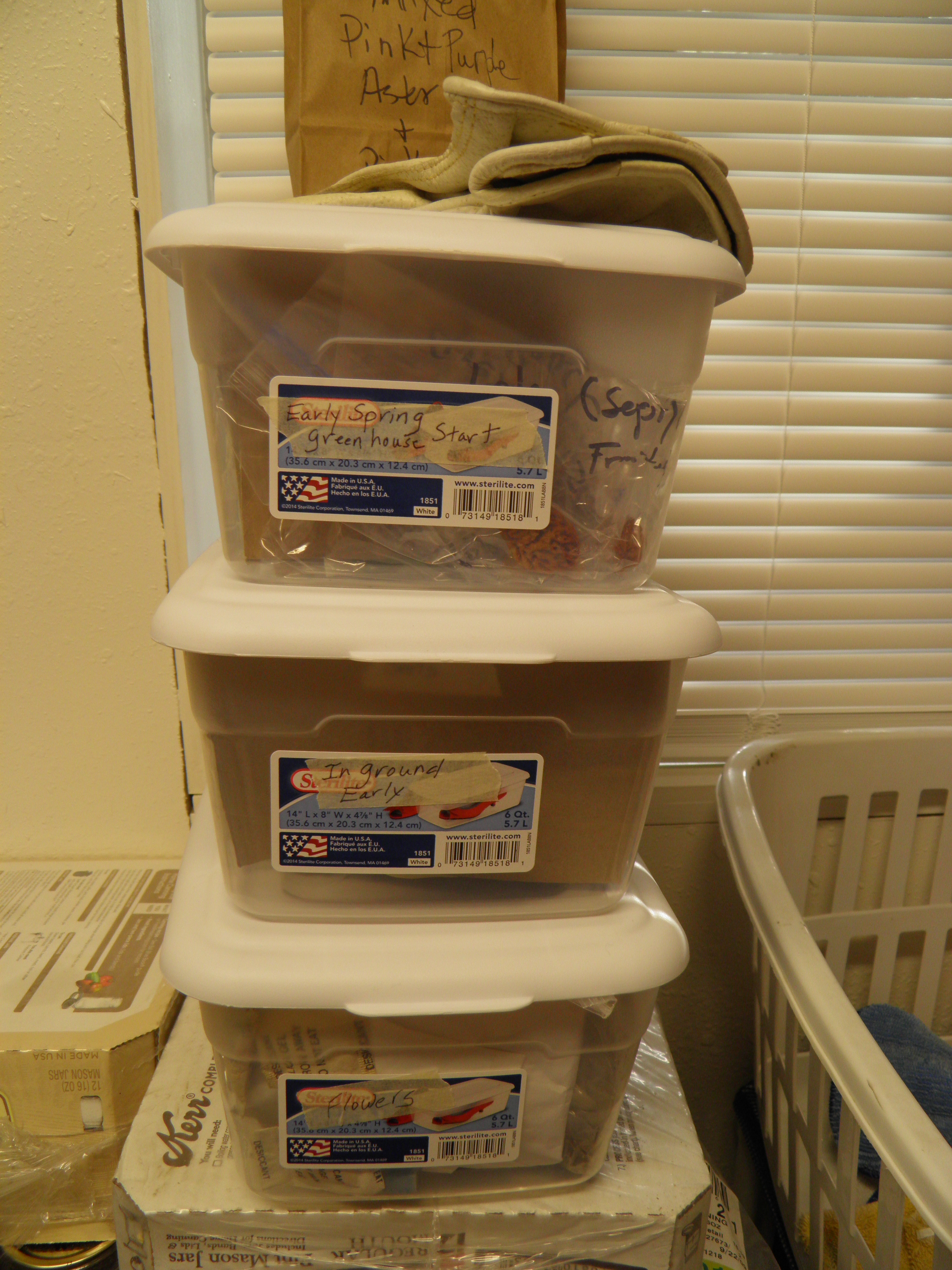By the way, if you are throwing out seeds and buying fresh ones every year, I hate to tell you how much money you are wasting. Most seeds are viable for years, and there are things you can do to improve seed life. I keep my seeds in plastic containers (glass would be better but I don’t have enough large glass containers) with several silica or charcoal packets (saved from medication bottles and from shoe boxes) in each container to absorb moisture. These containers are kept in my cool, unheated laundry room. I have had seeds (pumpkins and herbs) last 20 years or more in these conditions.