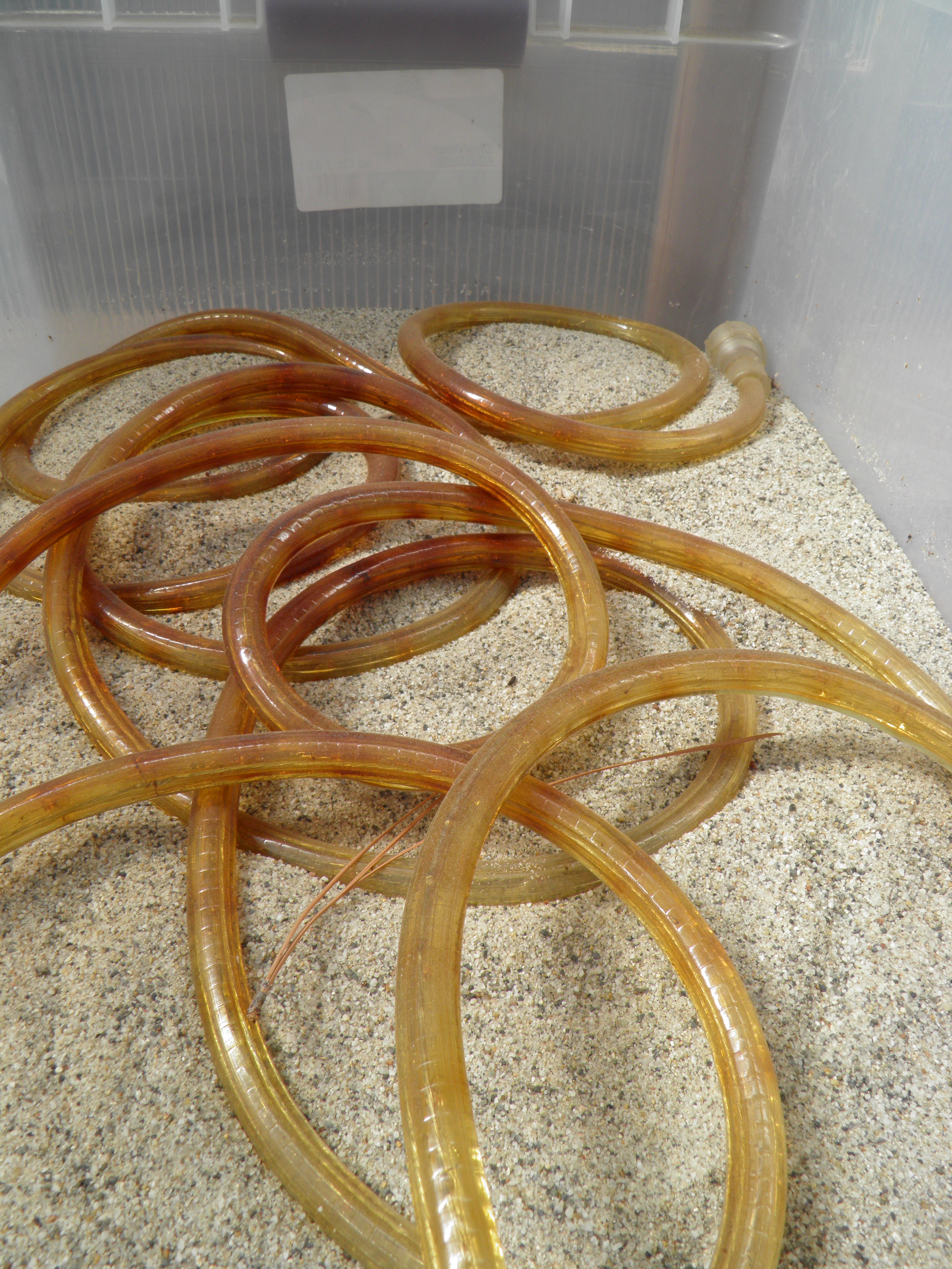 My heat box consists of a large plastic tub filled half-full of builder’s sand that you can buy in a bag at a hardware or lumber supply store. On top of the sand is a rope light. My husband drilled a hole through the tub so that the end of the rope light fits through the tub and can be plugged into an extension cord that runs electricity to the greenhouse from the outside outlet on the side of the house.