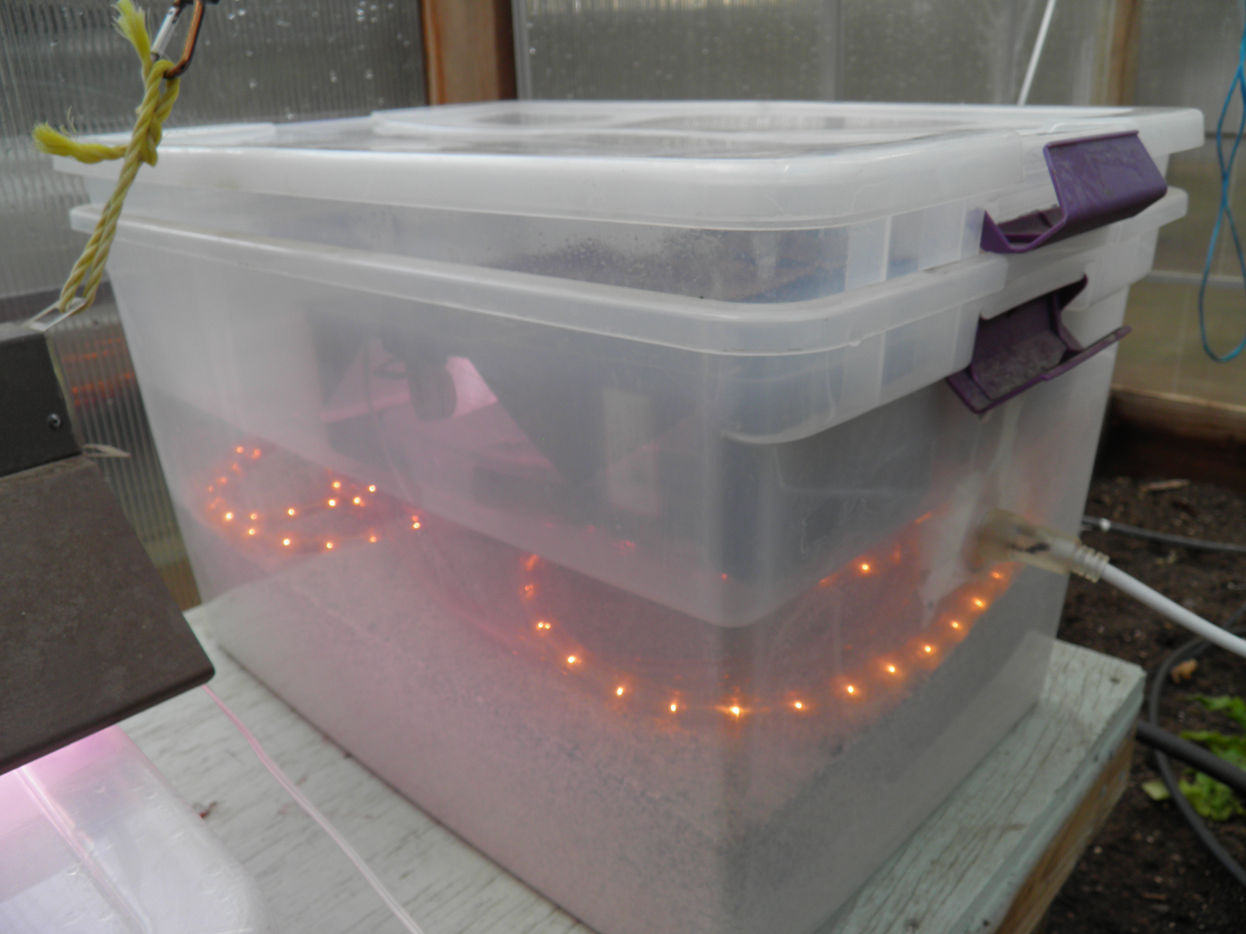 (UPDATE: I just checked the heat box in the greenhouse, and the LED rope light has warmed up the sand and the sprouting box above beautifully! I guess it just took a day or so to heat up. What a relief!)