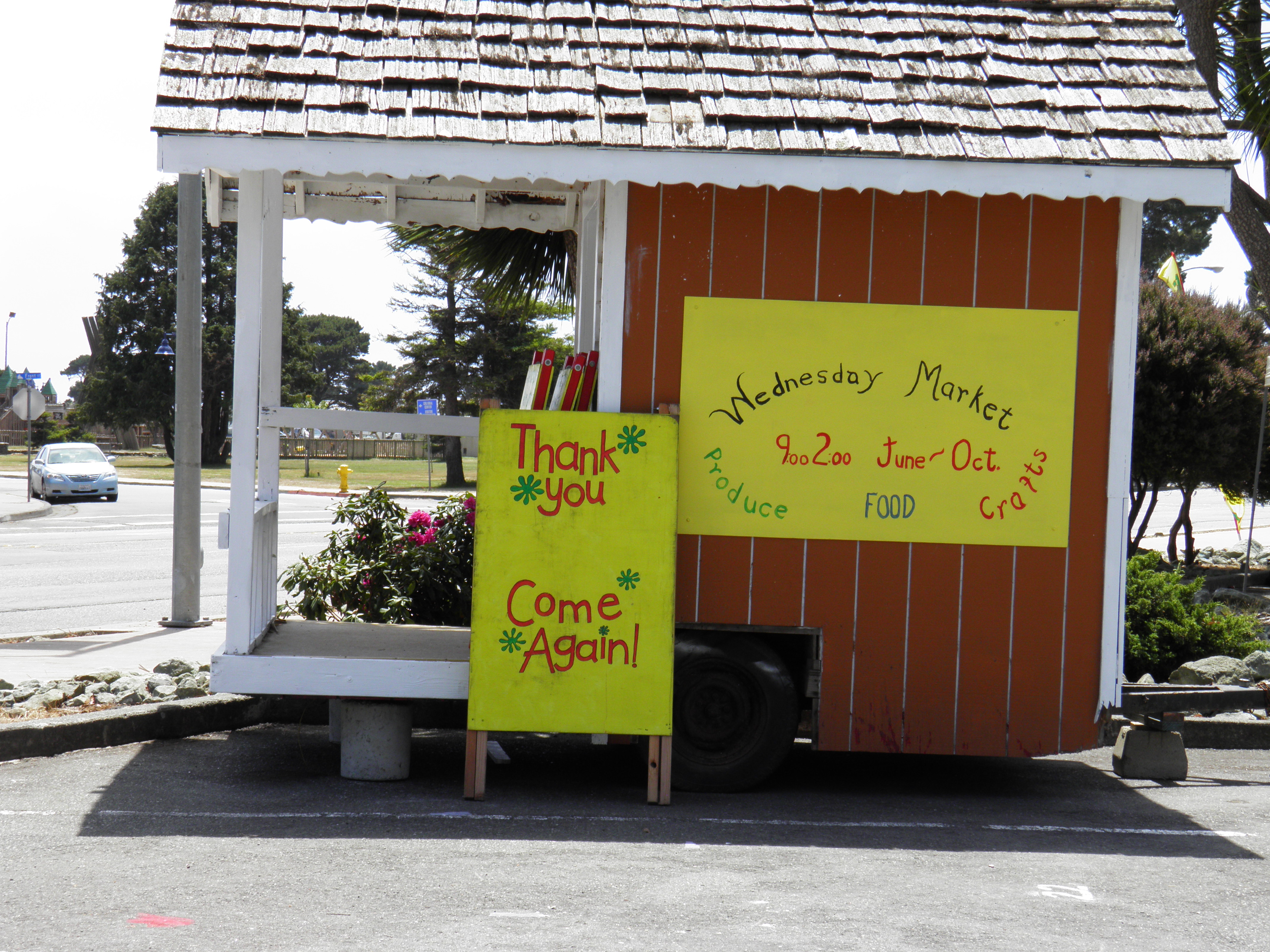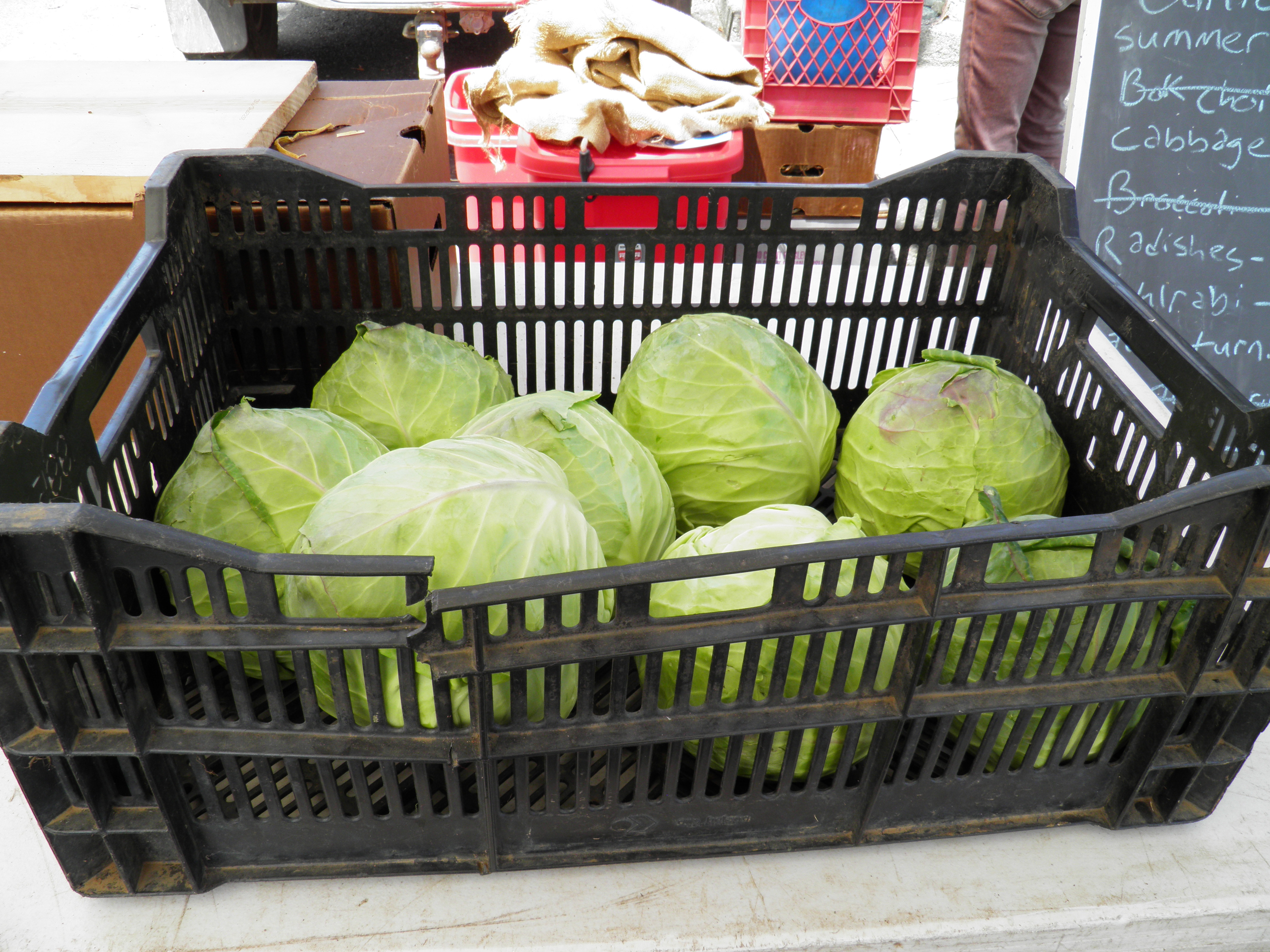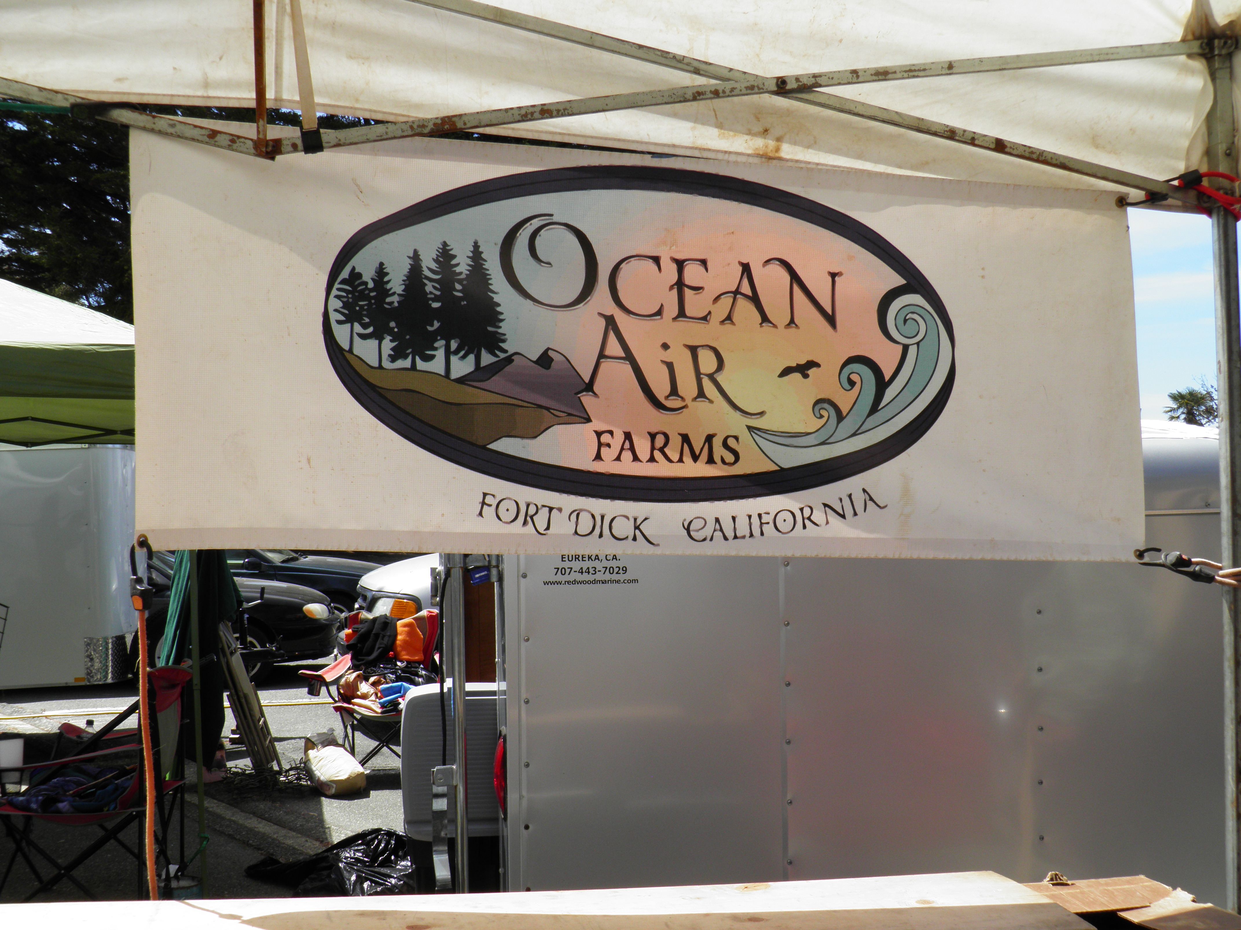 I arrived just as the market was closing at 2 p.m., but I still managed to speak with Hallie from Ocean Air Farms and get a few snapshots of some lovely produce she had leftover and the signboard that advertised what the farm was offering that day. Hallie told me that the farm sells to the farmers’ markets in Crescent City and Brookings and to the local whole/health foods store in Crescent City. I have to say, that cabbage looked wonderful, and if I’d had room in the little fridge in the travel trailer, I’d have bought one.