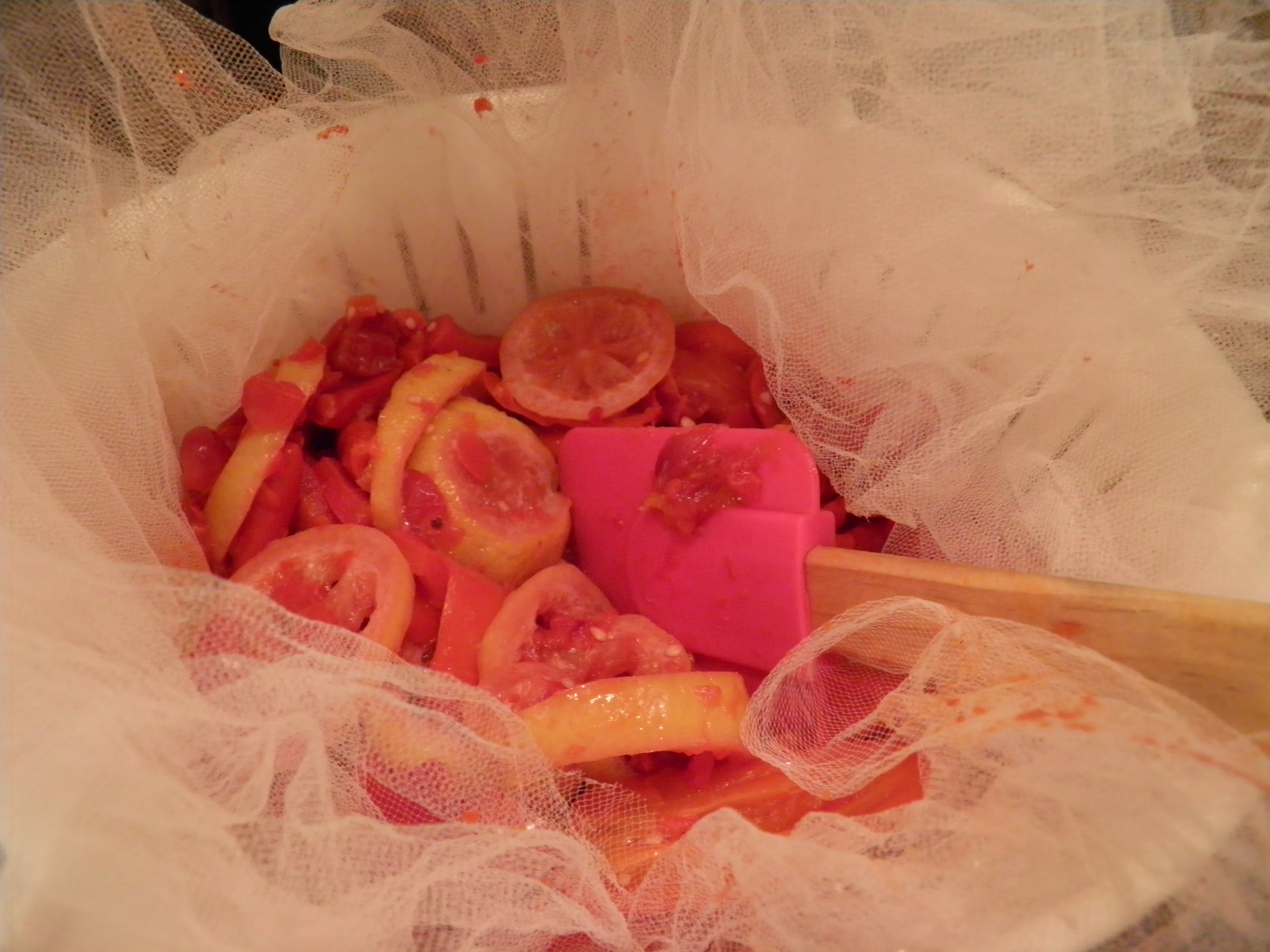 When all the peppers have softened, pour the contents of the pot into the lined colander to drain. Stir occasionally to release liquid from solids, but don’t press. You want to keep all the solids out of the liquid so the jelly will be clear. Let the colander drain for about 30 minutes, or until dripping slows or stops. In the meantime, wash out the big pot (there will be a sort of red scum on the sides that you don’t want in your jelly) and get ready to use it again.  Now is a good time to prepare your water bath canner and jars, as well.  Jars should be sterilized!