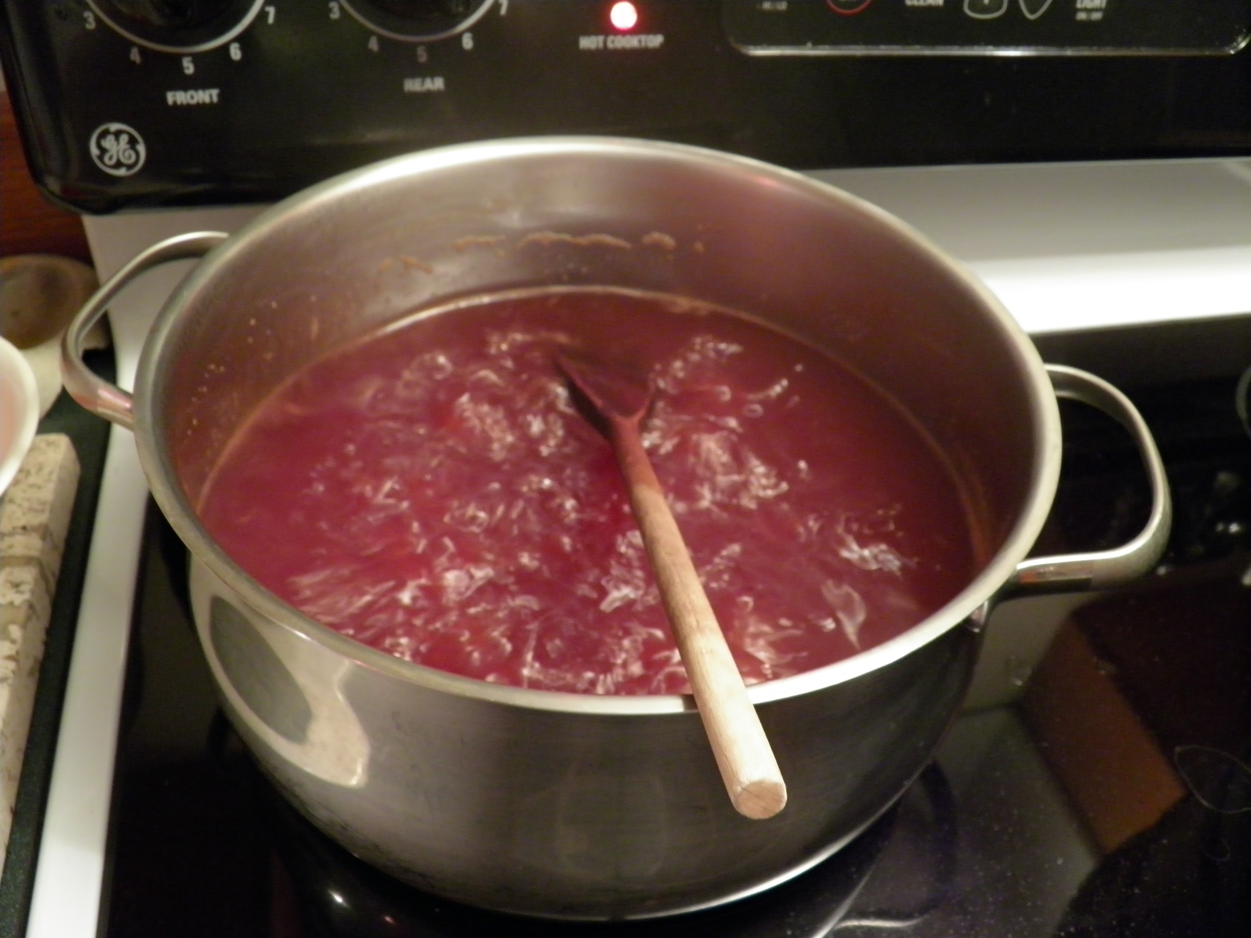 Pour off and measure the liquid in the bowl. You should have about 8 cups of liquid. If you don’t have enough liquid, return the solids to a pan, add as much water as you are missing from the 8 cups you should have (if it’s more than a cup, also add additional vinegar, ¼ cup for a cup of water, ½ cup for 2 cups of water), and cook again, on lower heat, for another 15 minutes. Be very careful to keep the solids from sticking and scorching at this point. Strain again, and measure liquid. You want 8 cups of liquid in total before you move on to the next step, which is boiling down your jelly. If you end up with a quarter cup more or less, that’s okay.