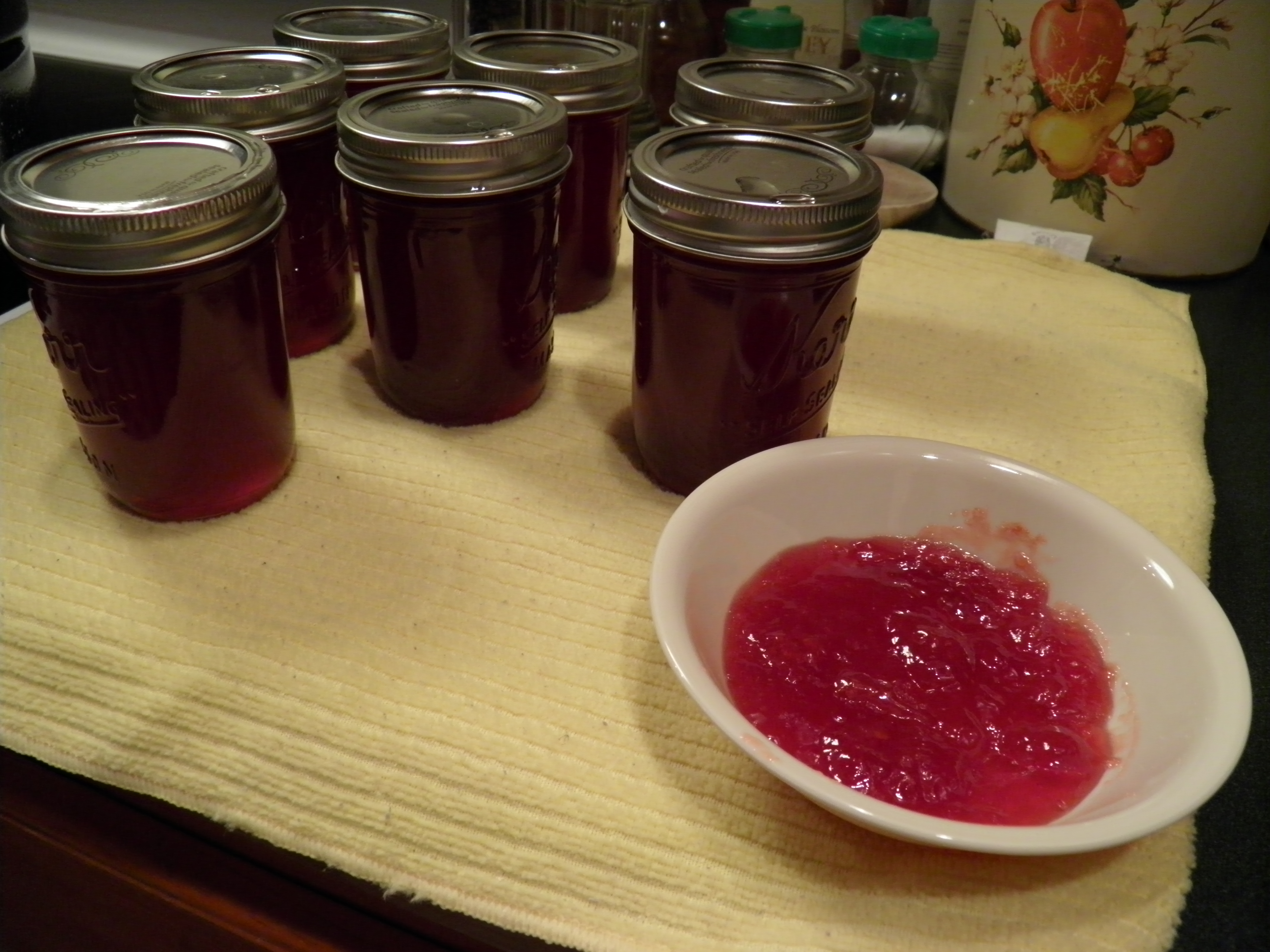 You can use a candy thermometer to measure the temperature, which will tell you when the jellying point has been reached at 220 degrees. I have one. I don’t use it. Because of my altitude, I prefer to use the cold plate method. Place a small ceramic or china plate in the freezer when you strain off the liquid. It should chill for about 30 min. before you start using it to test your set. I start testing at about 20-30 minutes cooking time, when I can see that the jelly liquid has reduced by about half. I place about half a teaspoon of the liquid on the cold plate, put it back in the freezer for 1 minute, and then push at the dab with my finger. If the dab wrinkles, the jelly will set. If it doesn’t, it’ll be syrup. I continue to test every five minutes until I get a good wrinkle on the plate. At that point, it’s ready to go in the jars. I pull the jelly off that burner and put it on the front one, on low, to keep it at a very low simmer, just barely a bubble breaking the surface, while I get it in the jars. This is very important, because if you over-cook the jelly, it will become gummy and set too hard. But you want the jelly very, very hot when it goes into the jars. (As you ladle in the jelly, you may notice that as it cools, it starts to string a bit and stick to the sides of the pan. That’s a good sign you’re going to get a good set, but keep the temperature low so that it doesn’t cook any further.)