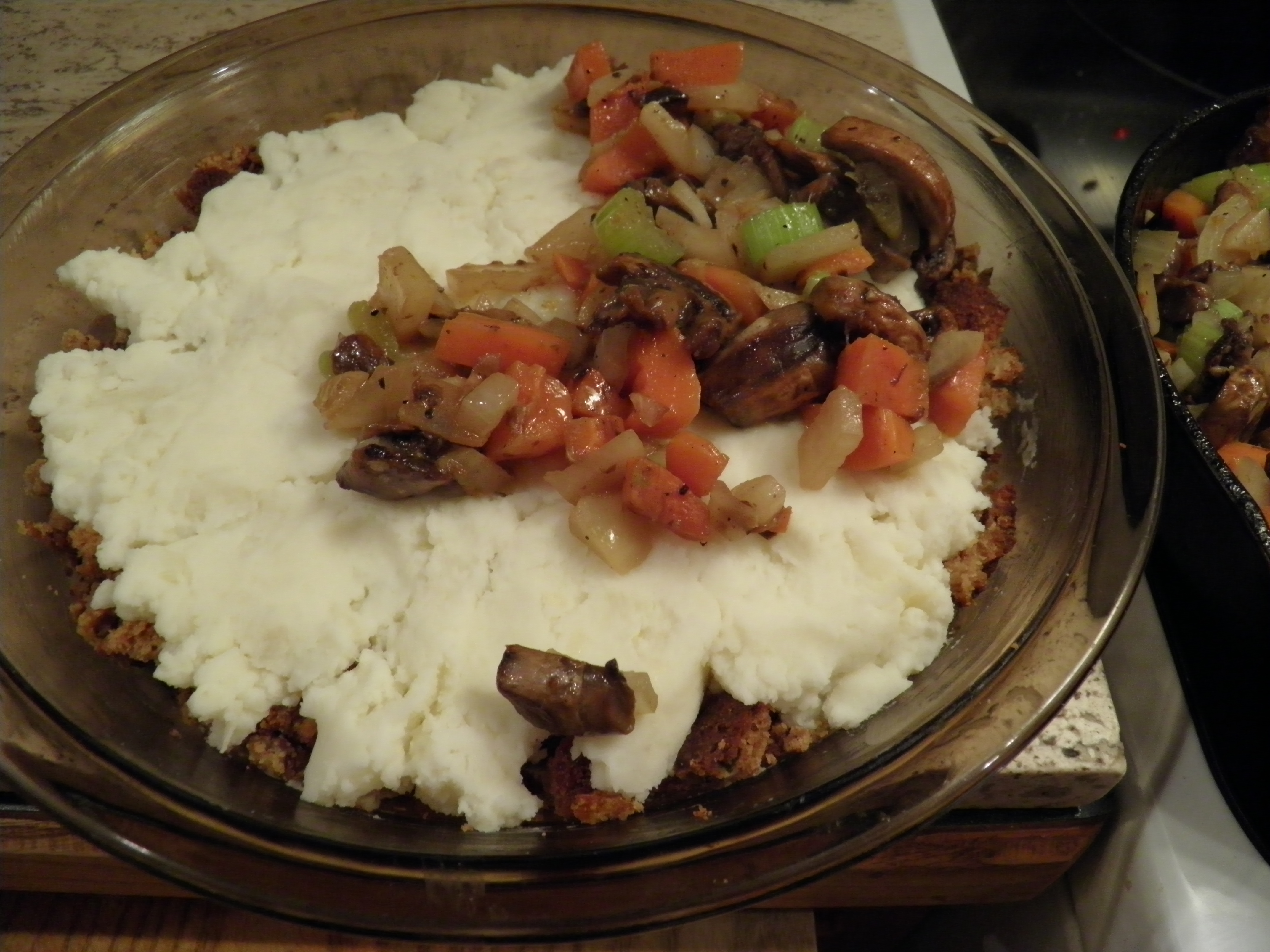 While vegetables are sautéing, butter or spray oil the bottom and sides of a nine-or-ten inch pie plate. Crumble stuffing between your fingers and press it onto the bottom of the pie plate, and up the sides if you have enough and want to. Dollop the mashed potatoes over the stuffing and press into a compact layer.