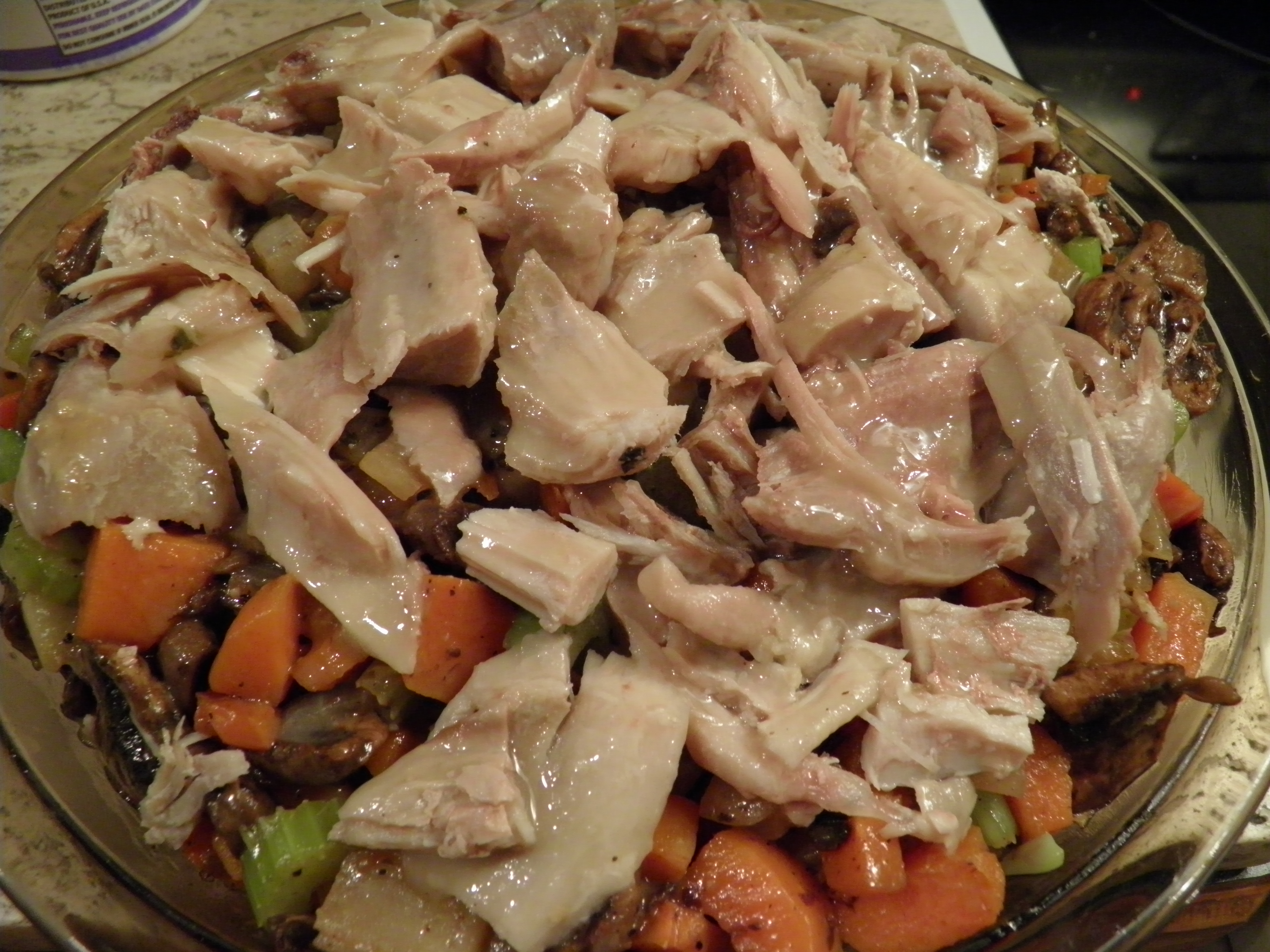 The thing that clinched this dish, turkey pot pie, was the fact that I had a little bit of pie dough left over too. I also had some mushrooms that needed to be used before they became unusable. I have a lot of carrots in the fridge from my garden (and more in the garden), and I had some raw turnips already peeled and cut which were left over from the raw veggie plate.