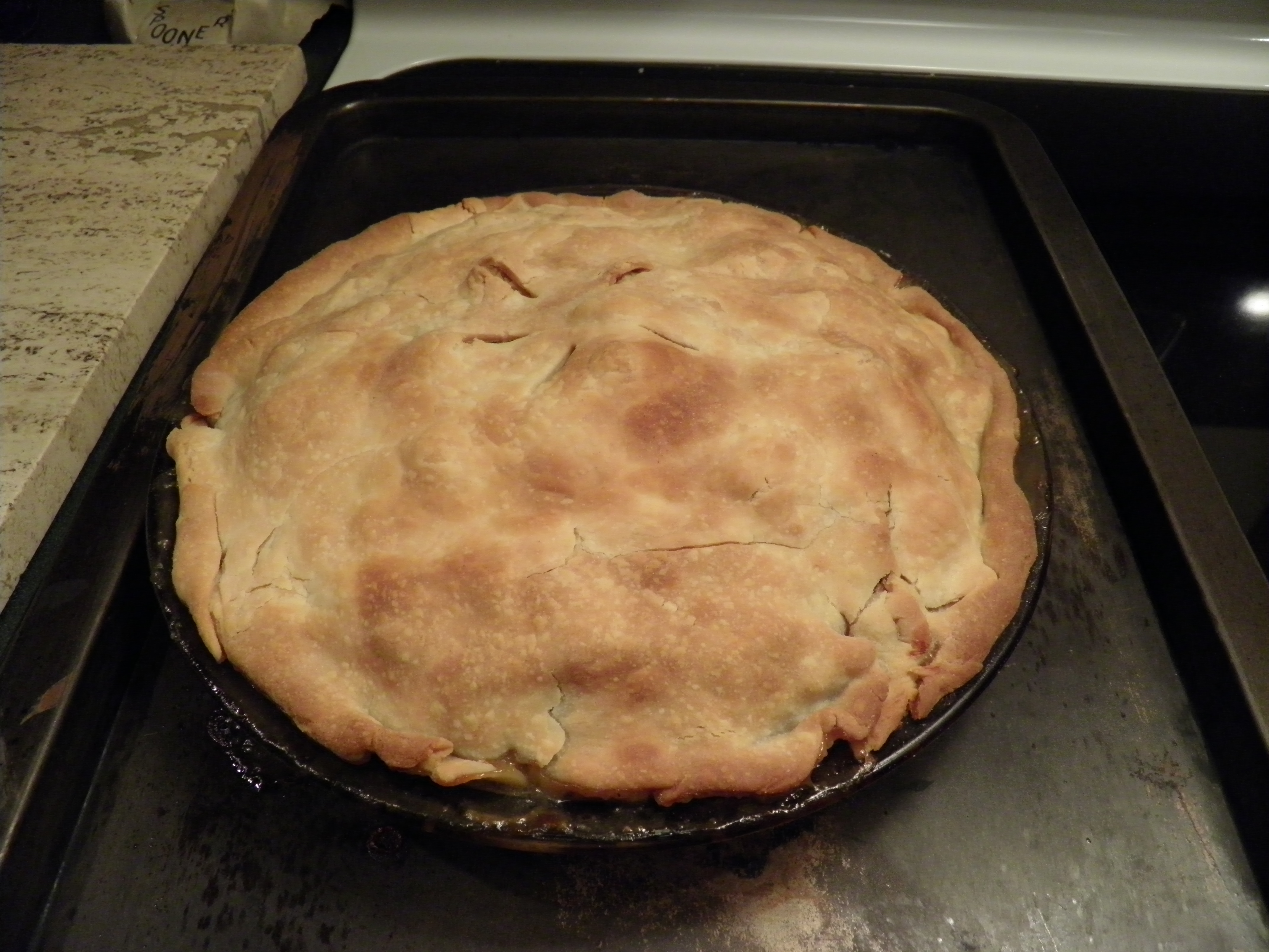 Roll out your pie crust, cut several vent slits in the top, and lay it over your filling. You can crimp the edges if you like. Place the pie on a cookie sheet to prevent it from bubbling over onto the bottom of your oven.