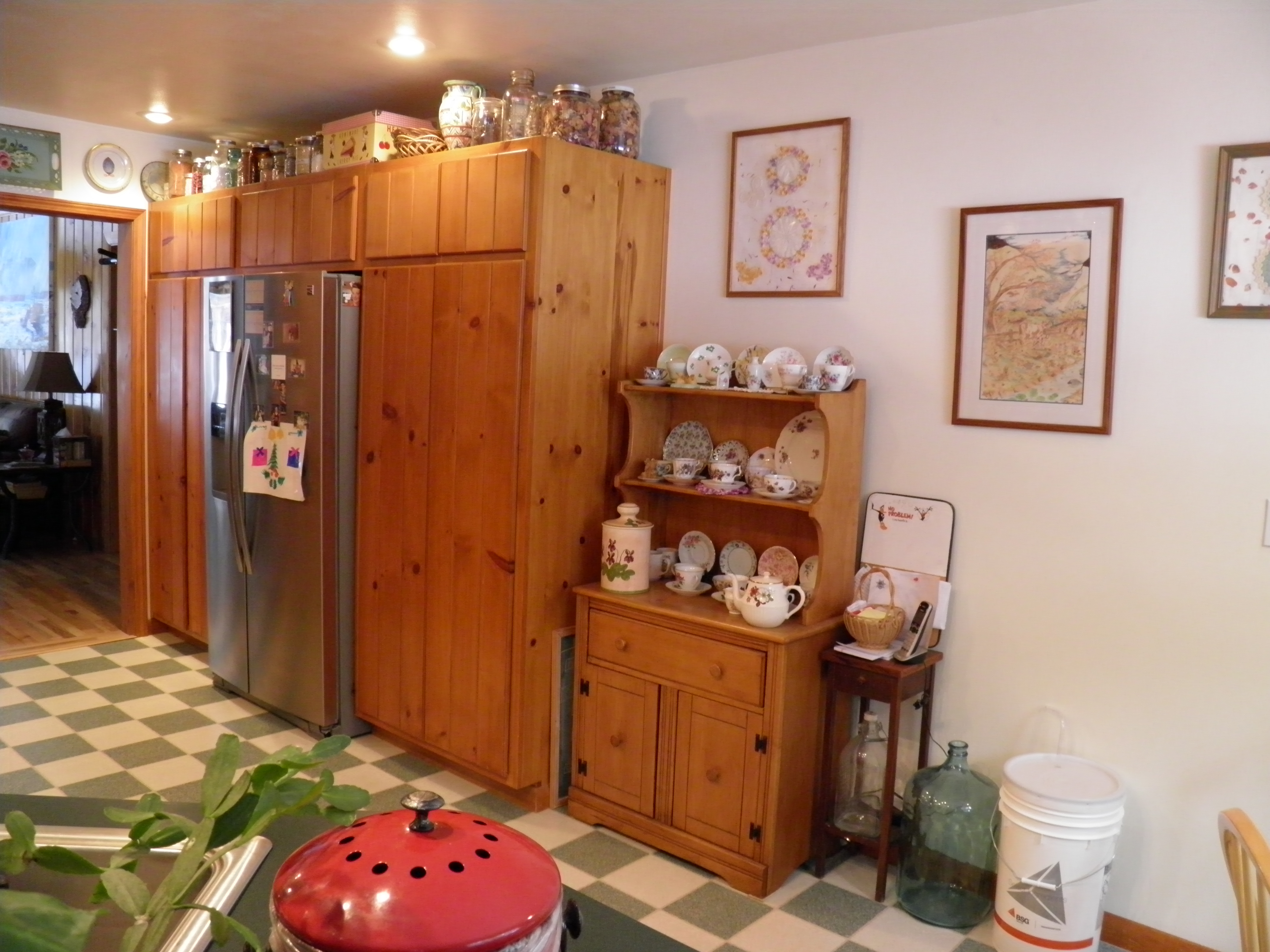 The big pantry cabinets, which are coming out, on the other side of the kitchen. When these pantries were put in nearly 20 years ago, I needed them. But now I have pantry storage in my laundry room, and I need counter space/work space more than I need pantries. The new cabinets, uppers and lowers, will extend to about where the little telephone table is sitting. Counter space!