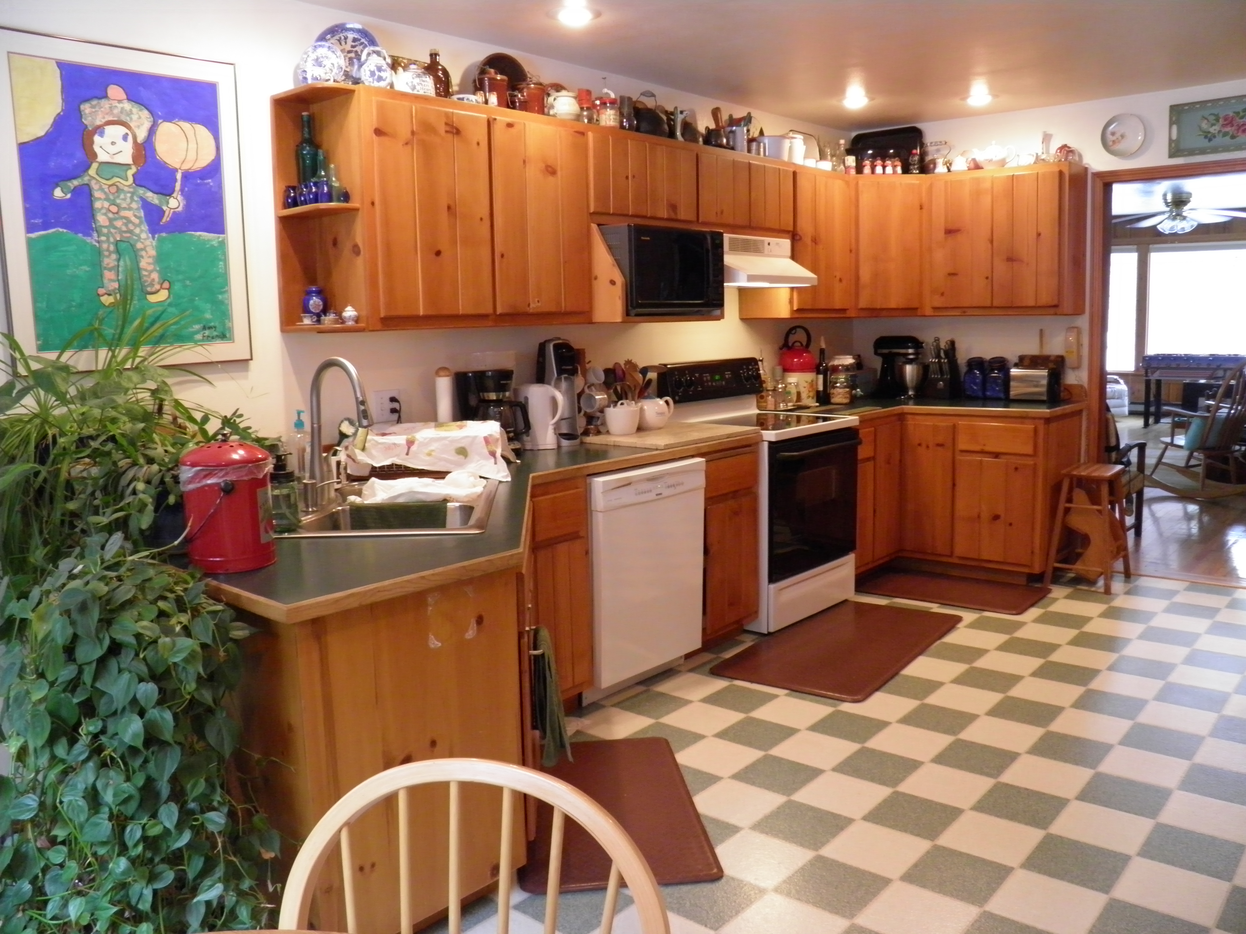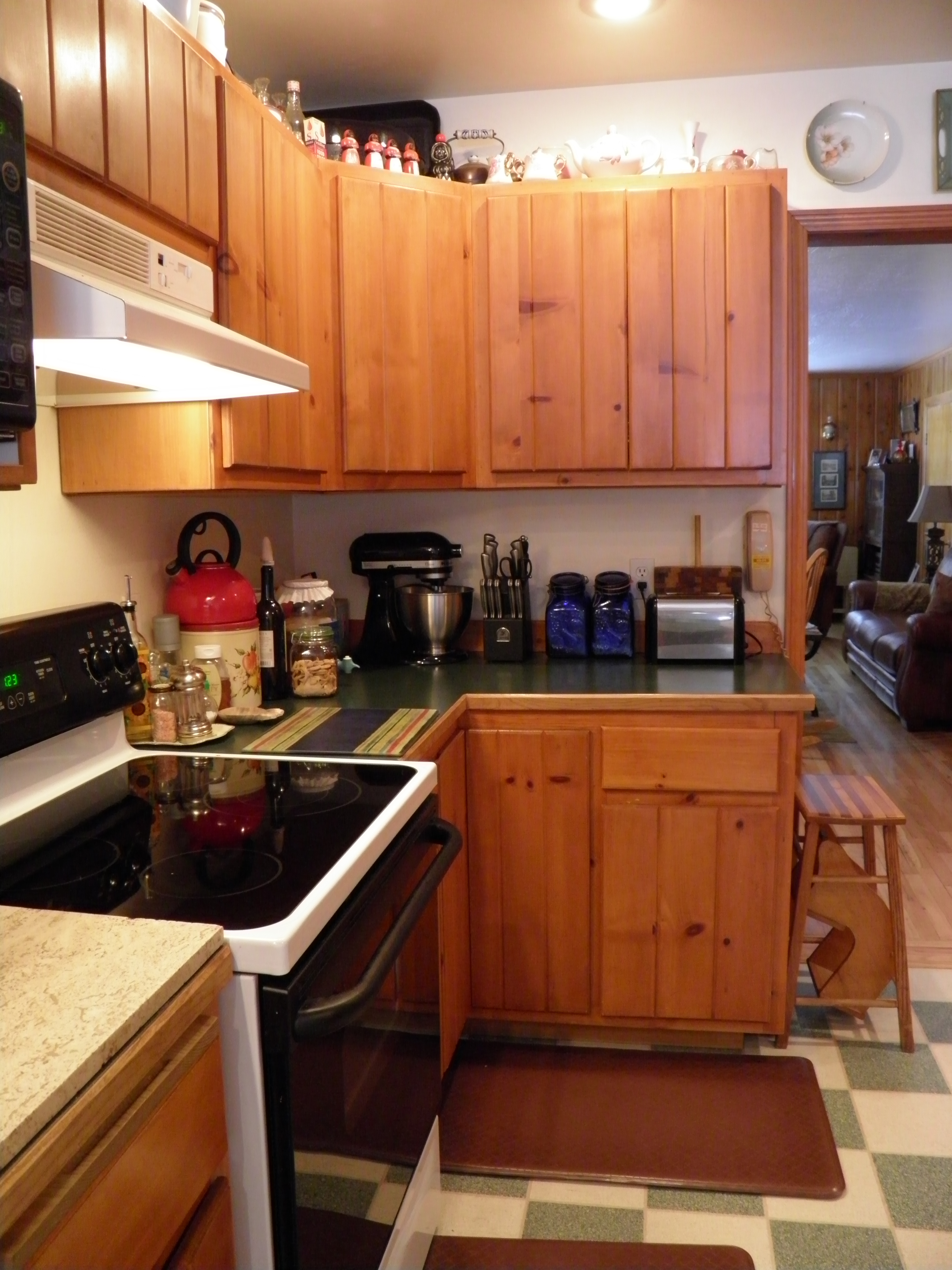One reason I expect the reno to take so long is that it is going to take us some time to demo. You know those shows where they take sledgehammers to old cabinets and clear out everything in a day? Well, that’s not us. Some of these knotty pine cabinets are still in good shape, and those will go in the pump houses, shed, and barn for storage. (And maybe some might go in my guest cabin one day if I ever get to build it.) So the cabinets are going to be taken down carefully, not smashed to smithereens. The counter top will be reused also. I want to use a section of it in the laundry room to create a folding counter, and some of it might go in the cabin eventually. We will be putting the sink, stove, and dishwasher back in. I’d love to be able to replace the stove and dishwasher so they match the fridge and sink, but I don’t have the money to do that all in one whack. We’ll make them match as they wear out and need to be replaced. And once all the cabinets and fixtures are out, we have to peel off the green, checkerboard linoleum and put down unstained red oak hardwood, to match what is in the living room. Yeah, it’s going to be a while before I’m cooking in that kitchen again.