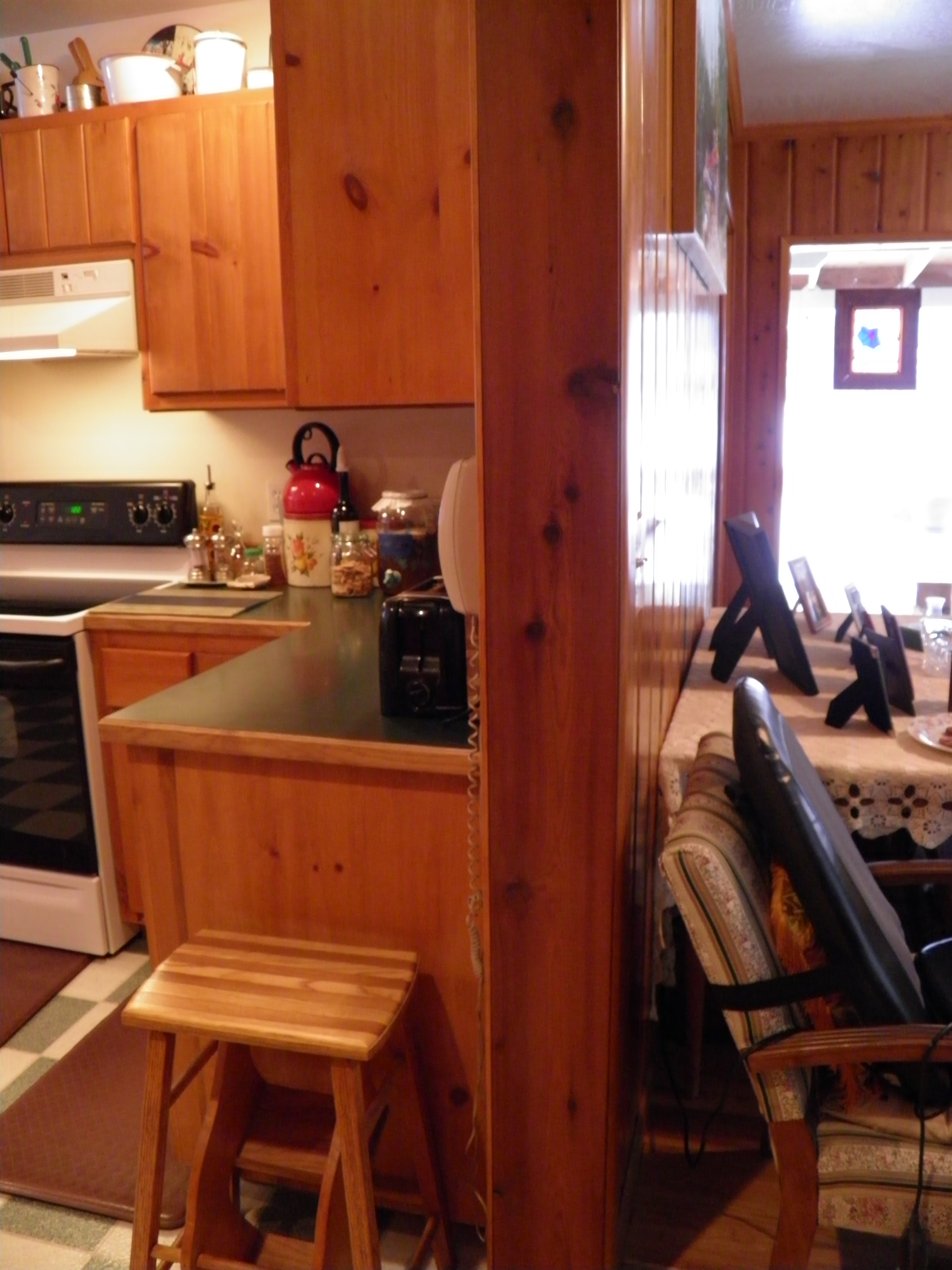This is a view of the section of wall that will be coming out. The knotty cedar paneling in the living room will be carefully cut out (don’t want to lose any of that stuff!) and the opening will be supported and cased. The burl bar top will come through the space where the wall is now and extend out a little way into the dining space. That table you can just see, covered with a hand-crocheted lace tablecloth (made by my husband’s grandmother) expands from a console table size (40″ x 24″) to become large enough, with a fold-out and pull-out function and three leaves, to seat 12 people. That table will go in the kitchen in the corner, for family dinners, and we will use another of Dennis’ burl slabs in the dining area to the right of the wall here to create a live edge dining table.