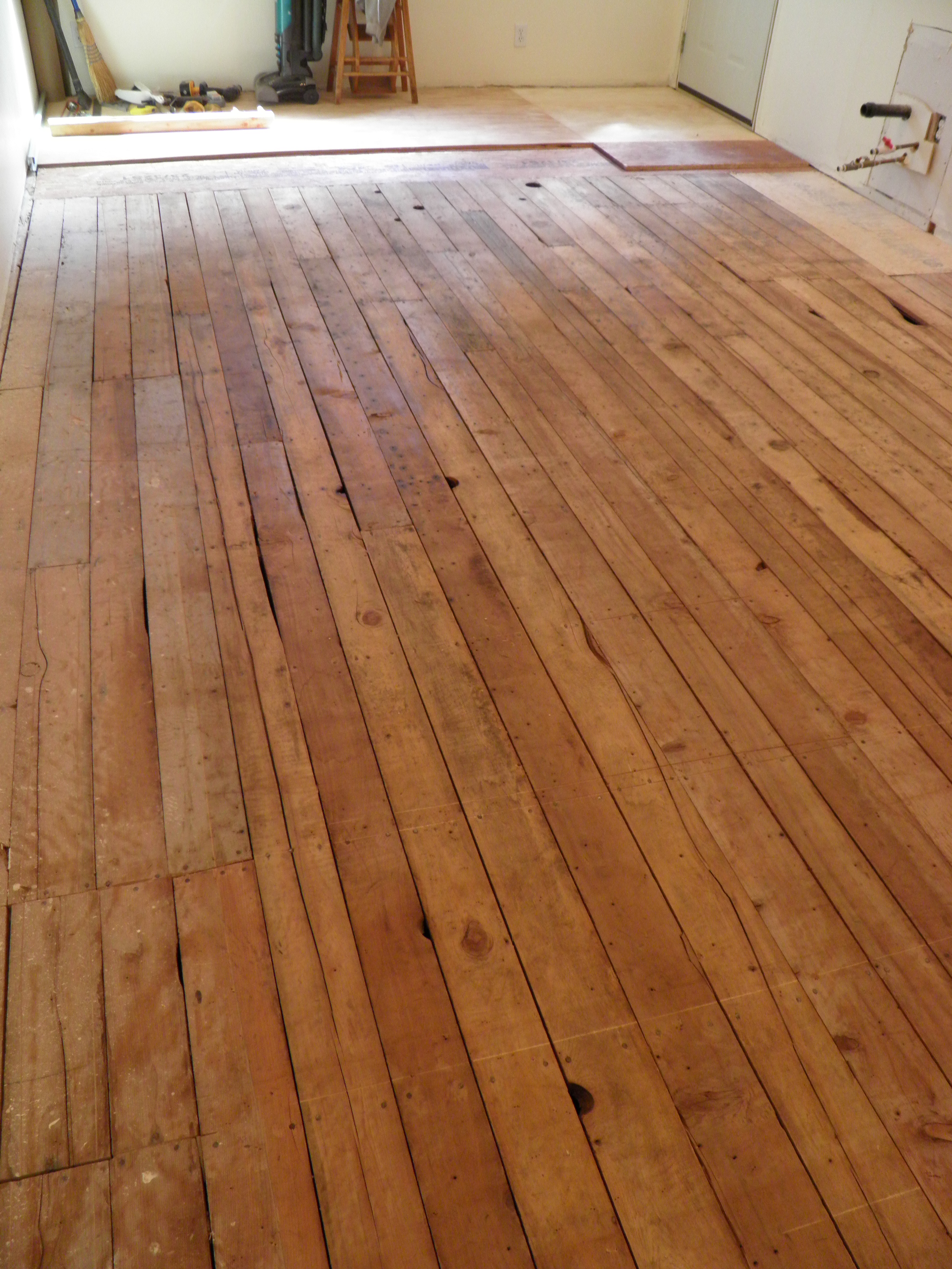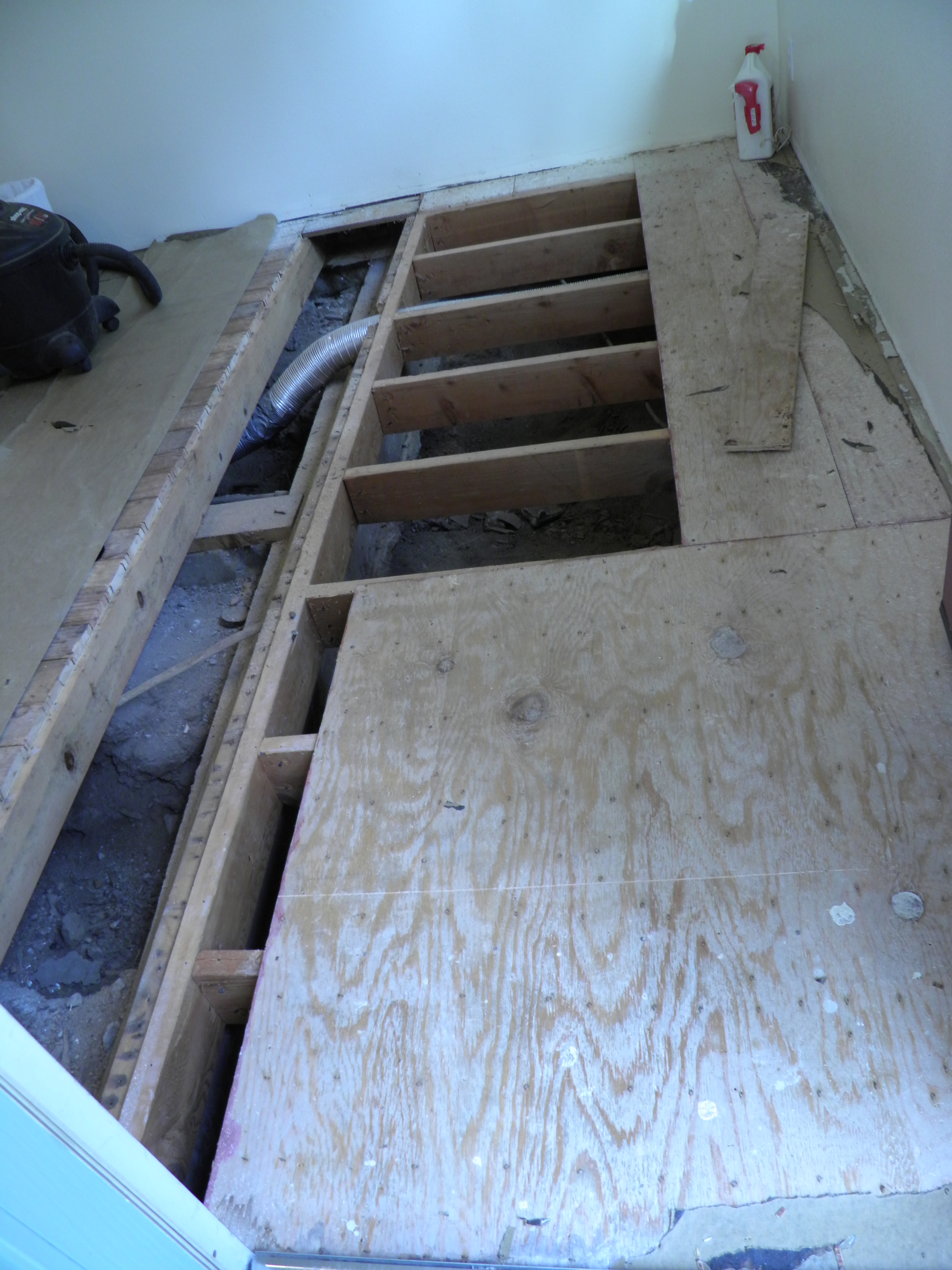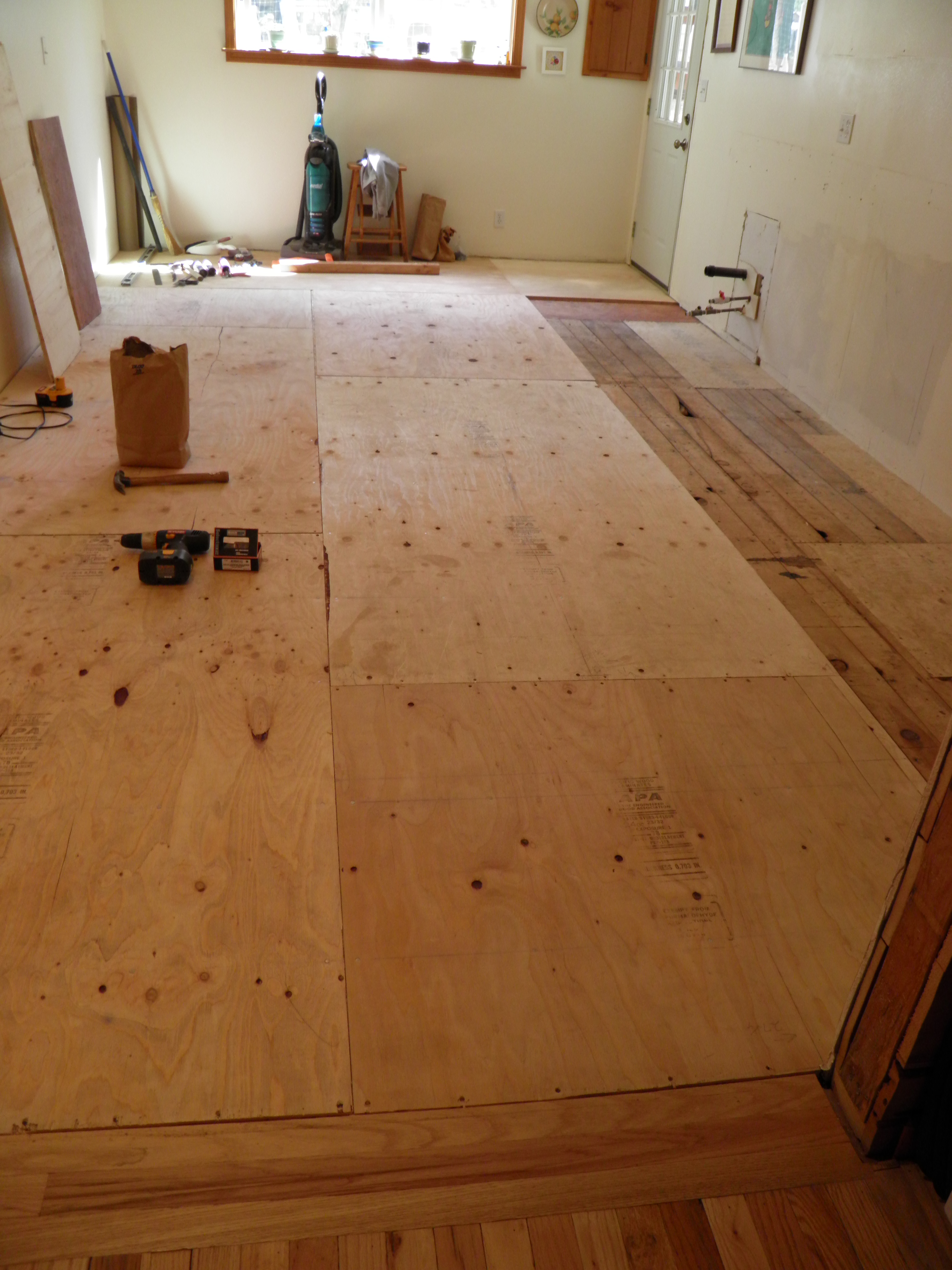 Then Dennis replaced the plywood subfloor over the addition in the kitchen. With the top flooring off, you can see the kitchen addition clearly. We don’t know exactly when the kitchen was added to the original “cabin,” but we think this addition to the kitchen was done in the ‘70s, when the back part of the house that contains bedrooms and bathrooms was added. A new foundation was poured at that time, and new floor joists were laid. The builders didn’t use the same building techniques of laying planks for the subfloor. They used plywood, so the addition becomes visible when the subfloor is exposed.