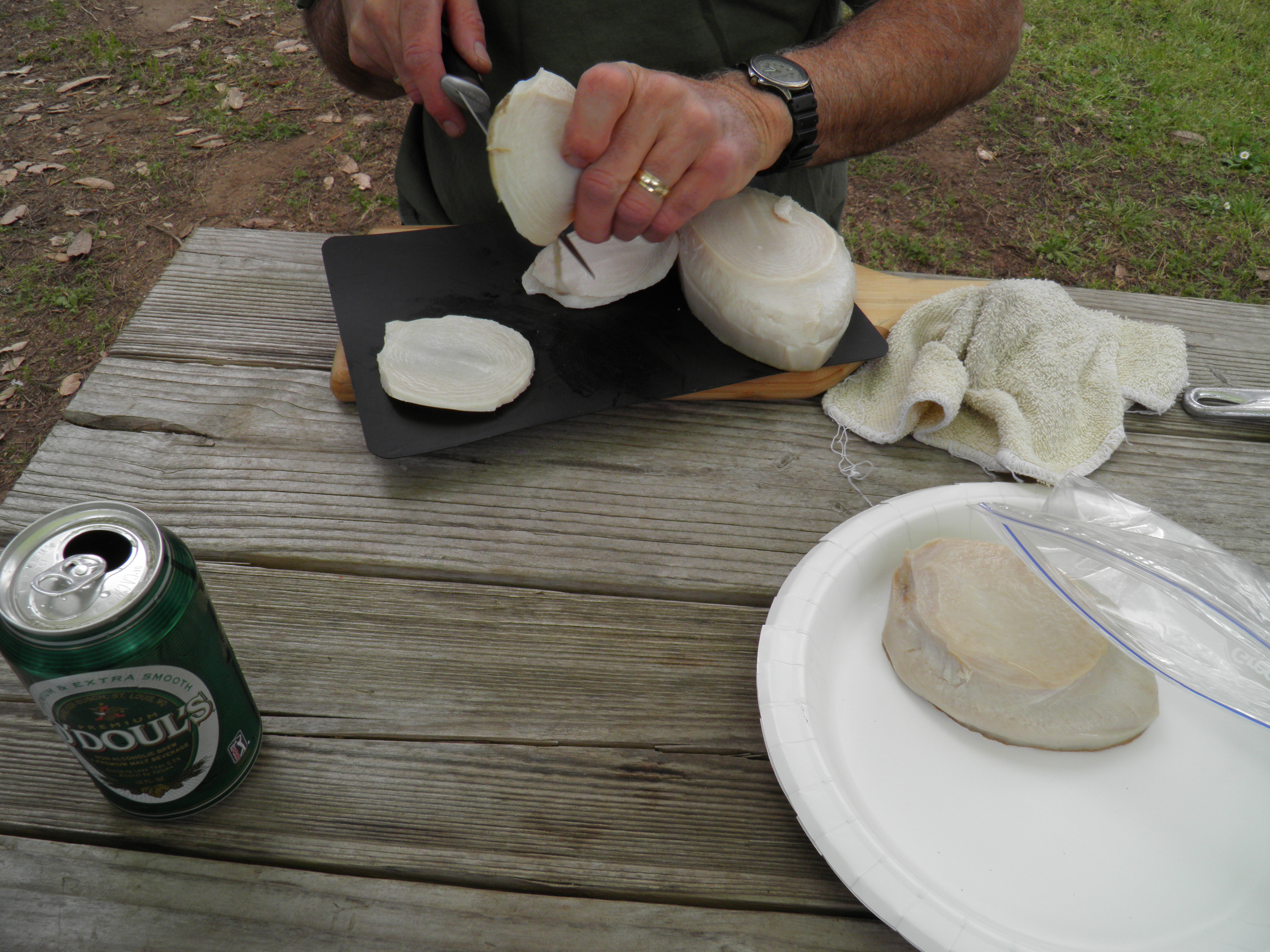 First, Dennis pries the abalone out of the shell, cleans away the gut (full of ground kelp), and trims off the black “lips” around the edge of the creature. These lips are actually the abalone’s feet. They help it move around on the rocks on which it lives under the surface of the sea. The meat is pounded a few times with an ab iron (the tool used to pry the abalone off the rock) or a mallet, or even a two by four, if that’s all that’s handy. This helps that incredibly strong muscle to relax. Then the meat is rinsed clean, sliced thin into steaks, and pounded again, this time with a meat mallet, bumpy side down. It’s necessary for the abalone steaks to be tenderized this way, and Dennis usually pounds them until he can see the muscle fibers breaking down.