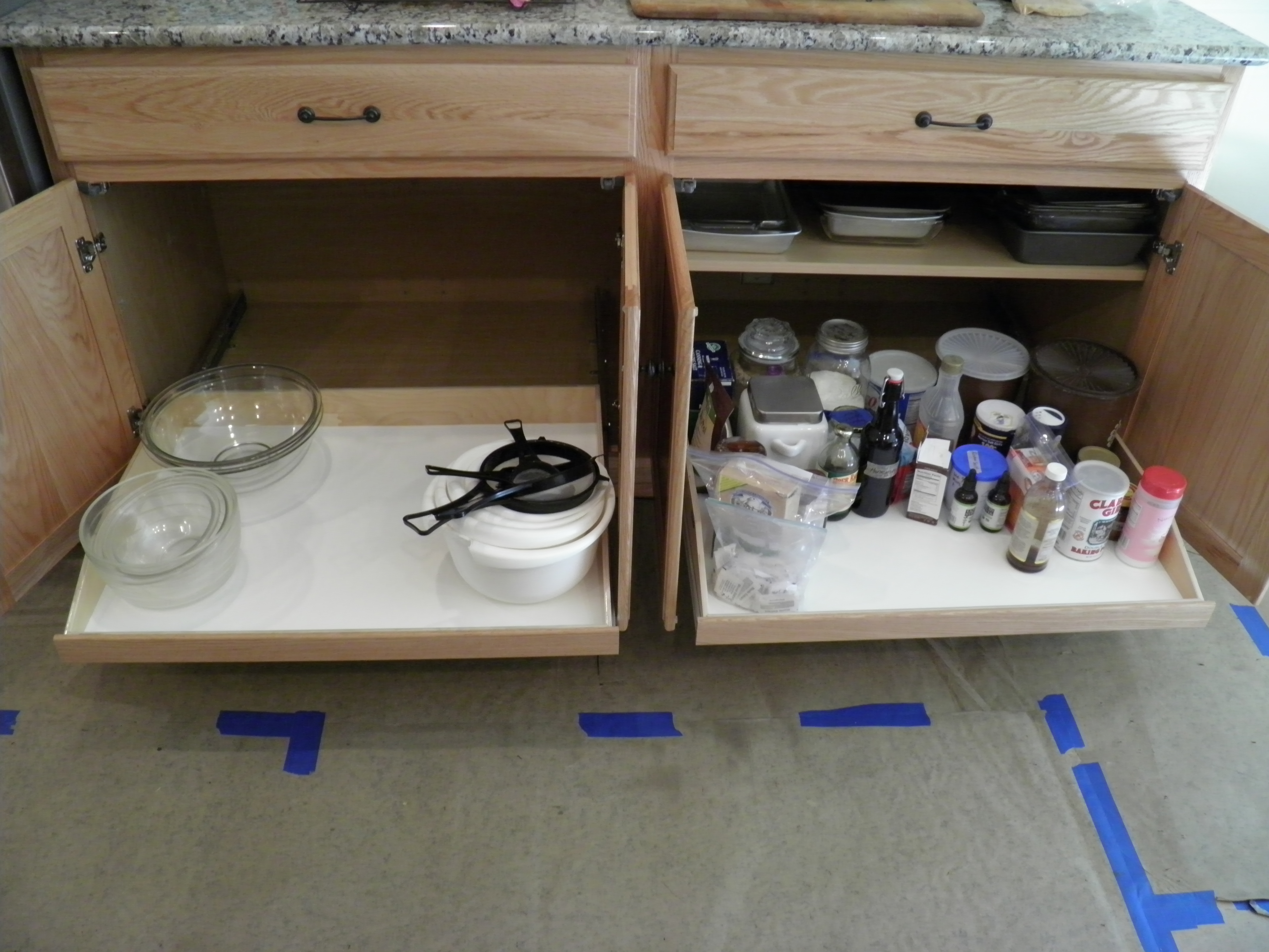 On the other side of the kitchen, I only have three base cabinets that need roll-out shelving. One is the sink base. I wanted to have two roll-out shelves on either side, but because of the plumbing and the garbage disposal, only one would fit. Dennis has drilled the holes for that one, which will hold the kitchen trash can and cleaning supplies, but he won’t install it until after the next round of countertop installation, because he has to crawl under that cabinet to hook up the plumbing to the sink, and the roll-out would be in the way.
