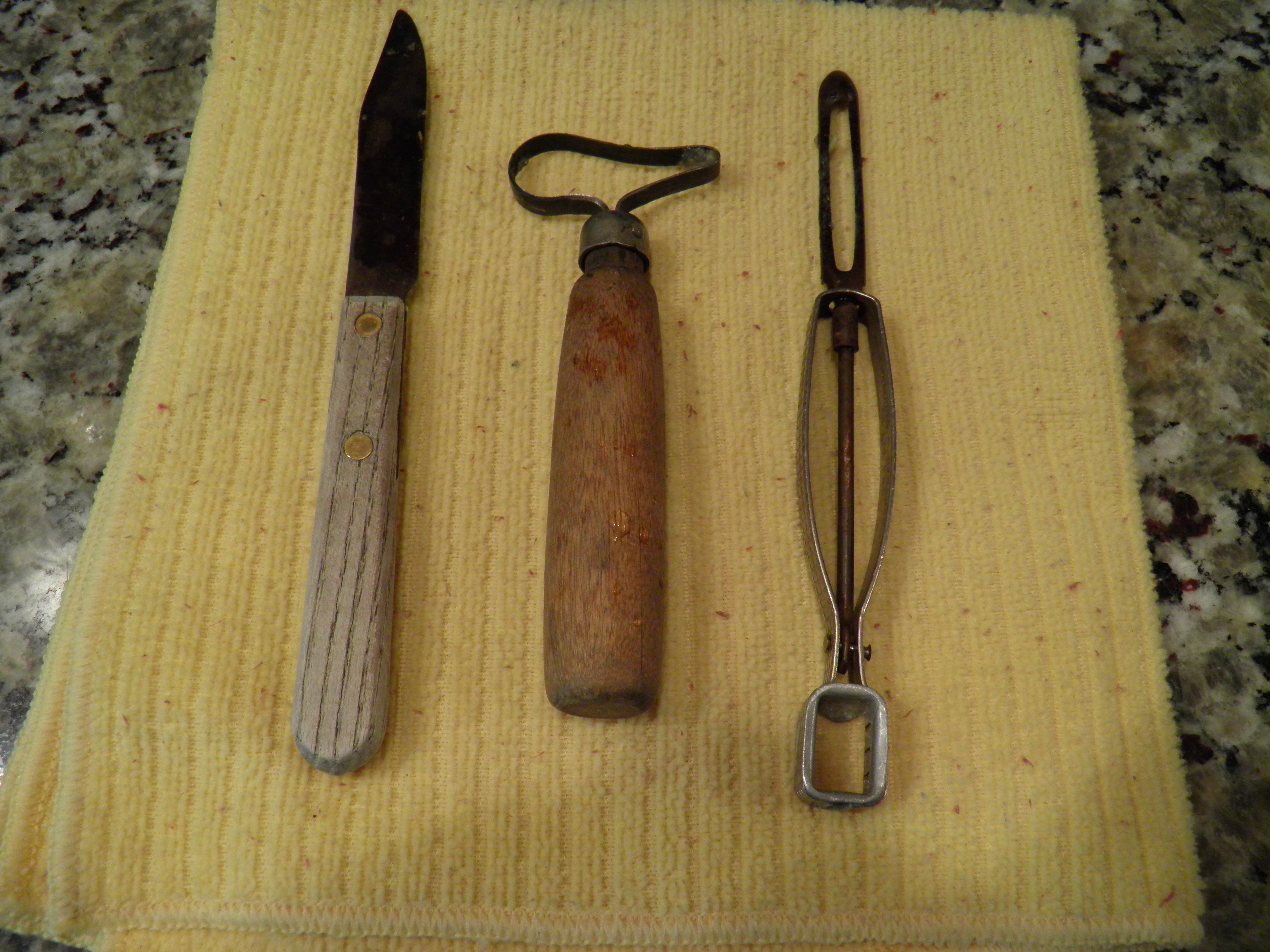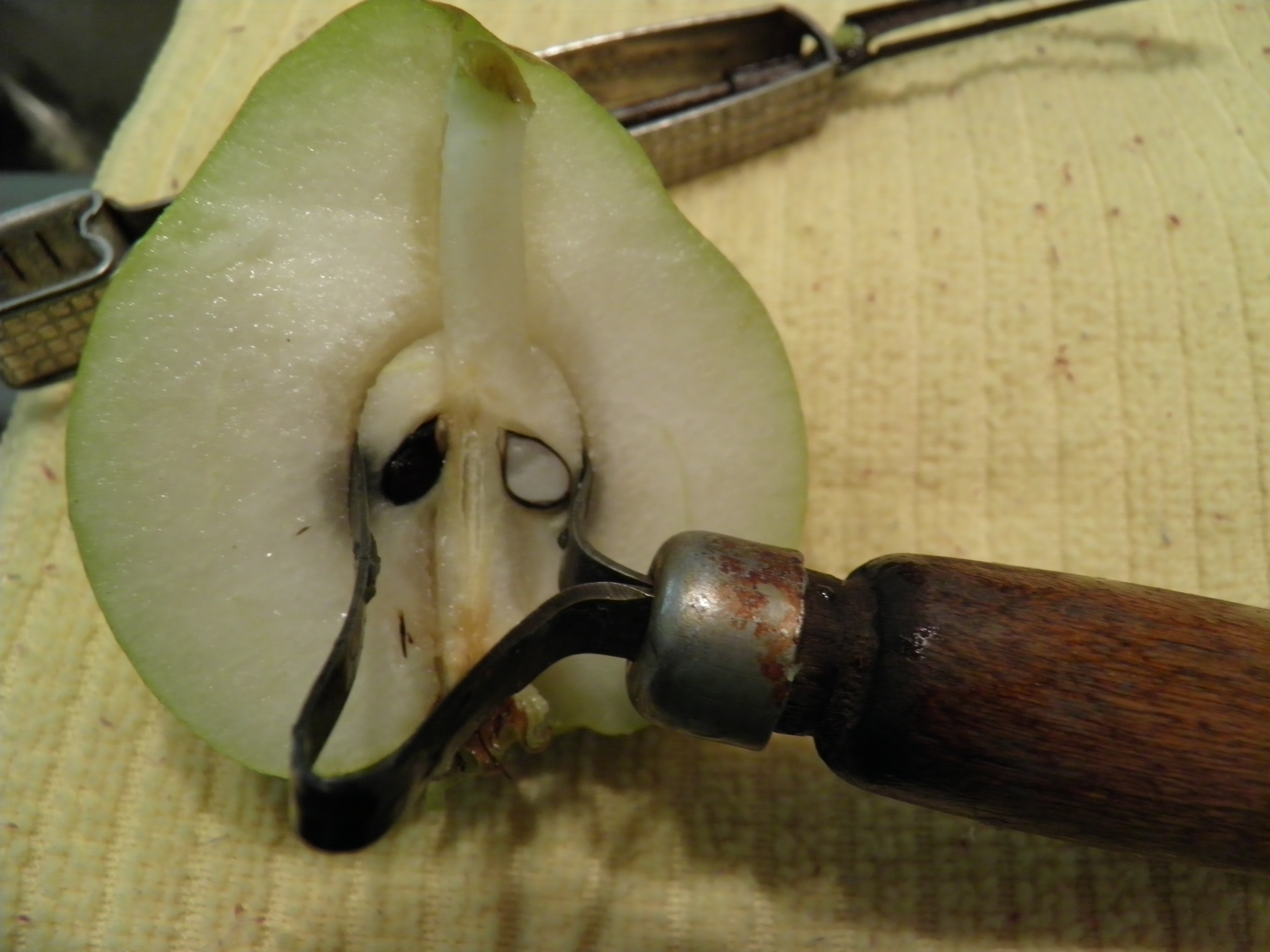 At this point, I have to interject a comment about a tool. Years ago, I found this little gadget in a box of kitchen tools in an antique store. I’m always trolling through those, looking for old vegetable peelers. (My favorite peeler is in the picture below. The old ones are so much sharper than the kind you can buy now.) I picked up the unfamiliar tool and looked and looked at it, wondering what it was. And then the shape told me. It is a pear corer. Pears can’t be cored on an apple corer. They are too soft, and the shape is wrong. I’ve only ever been able to do it properly with a small paring knife like the one in the photo, and it is so hard on my hands. I bought the pear corer and stashed it in a drawer and forgot about it. I found it last winter when I was boxing up the kitchen cabinets and drawers in preparation for the kitchen remodel. I made a mental note to try it if I did get any pears to can this year. And I’m here to tell you, be on the lookout for one of these. It worked beautifully! After I cut the fruit in half lengthwise, the narrow end of the corer scraped out the blossom scar on the bottom and removed the strings that run down to the core from the stem. (Canning books tell you remove them because they will darken in the jar and look unattractive.) The large end scoops out the core like a melon baller.