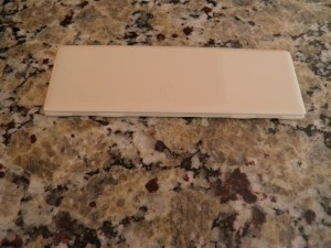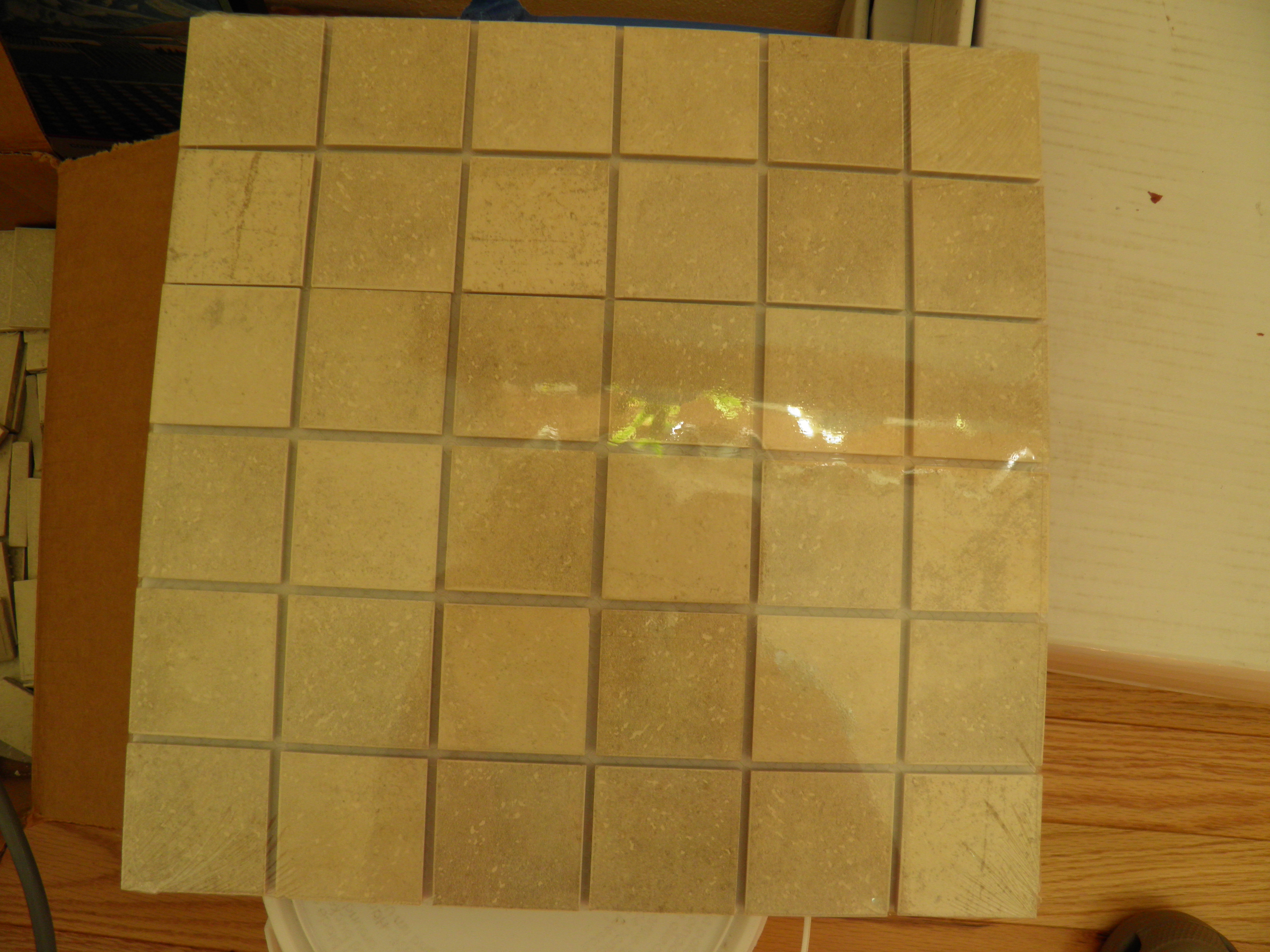 Because Dennis was nervous about the tile job, he thought using those 12’X12’ mosaic squares, with the tiles attached to a web backing, would be easier than laying the subway tile I wanted. He thought it would be less work and there’d be less chance of messing up the lines. Just the opposite turned out to be true. This is the small subway tile I liked.