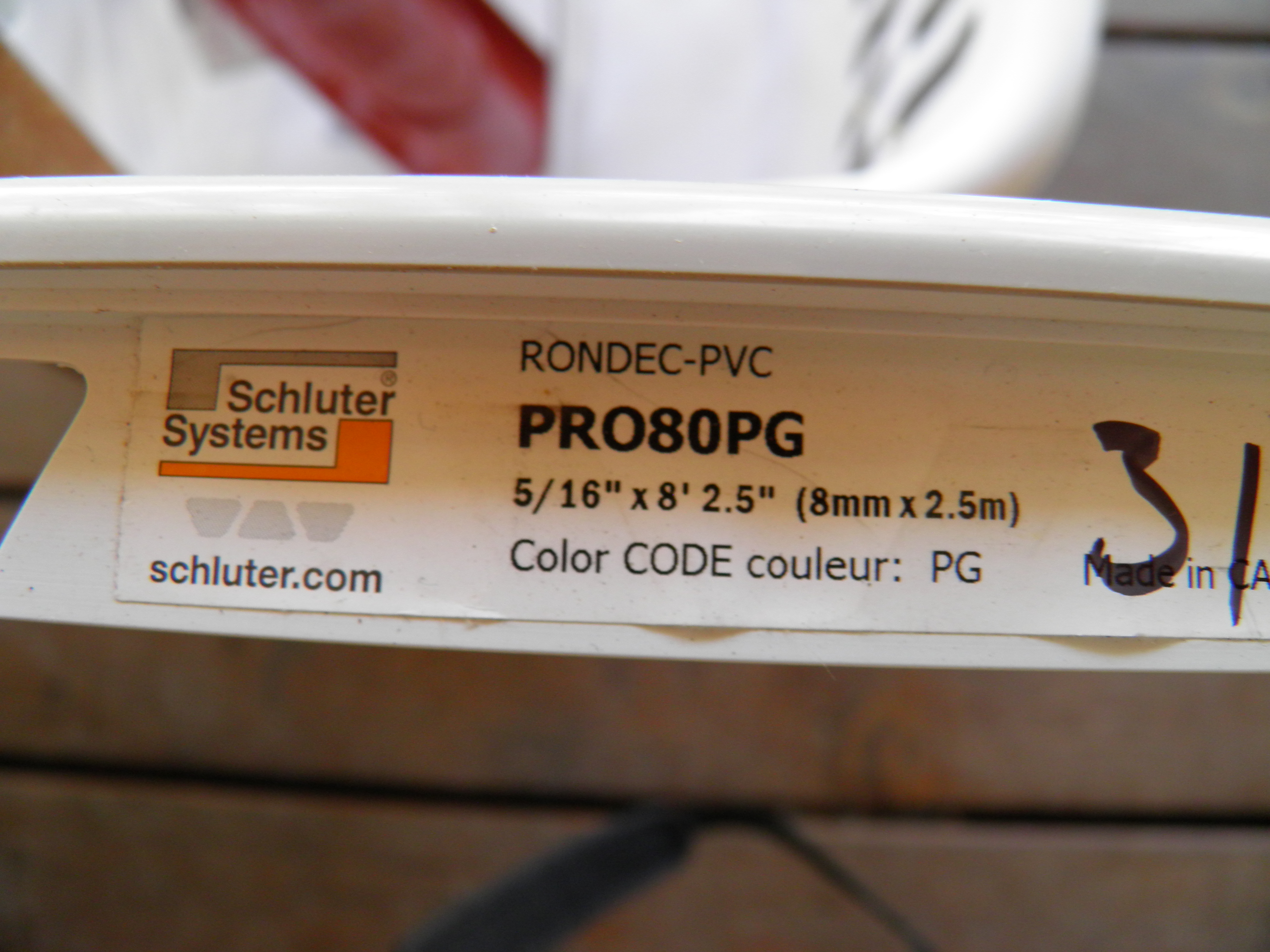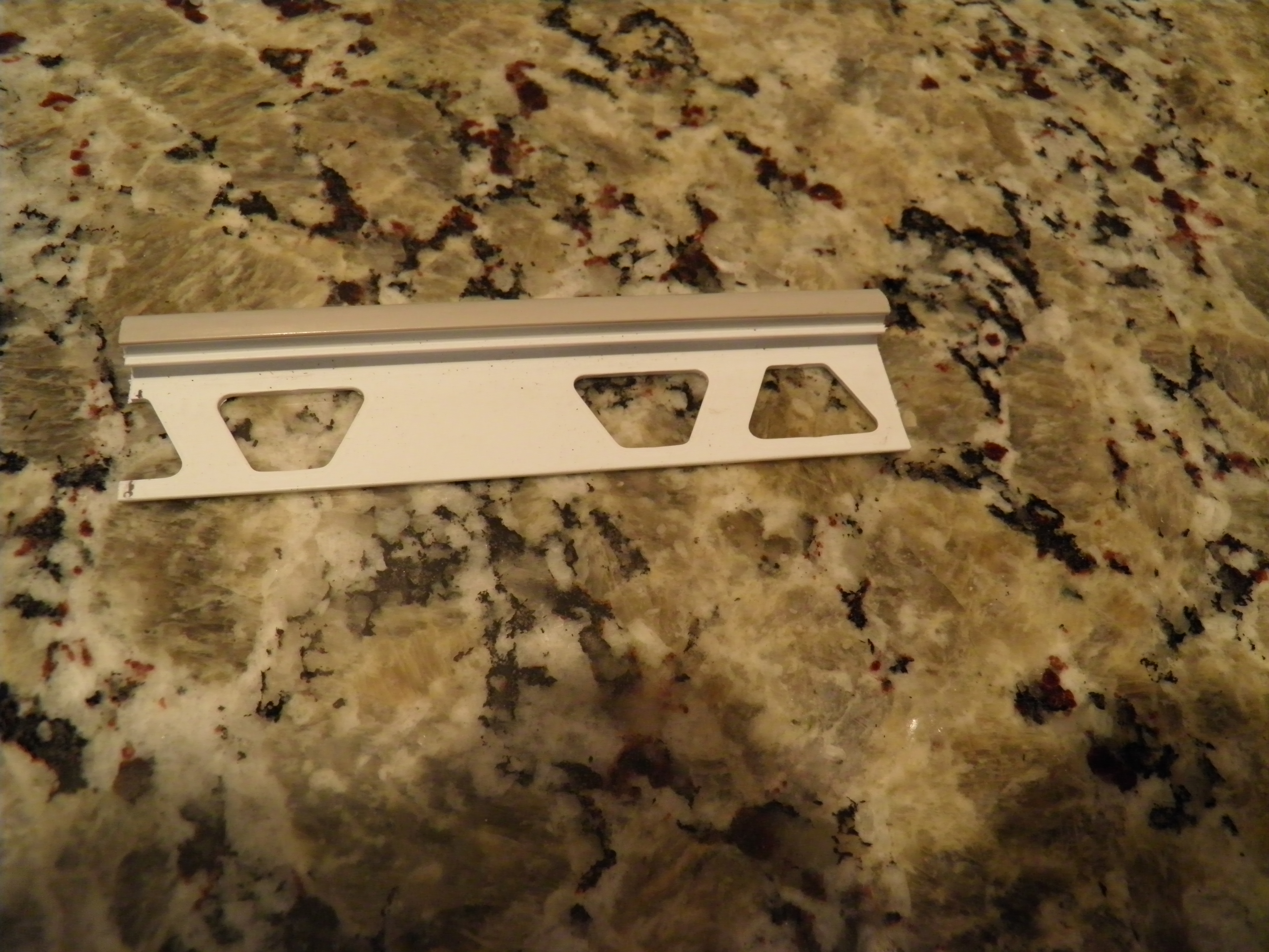 Dennis finally admitted that laying subway tile would probably have been easier and less time-consuming. I think it took him two weeks to completely finish the job with caulk in the seam between the tile and the edge finishing product we used. (It’s nice that all this stuff, grout and caulk, comes color-matched.) The edging strip is made of PVC and creates a finished edge for tiles which don’t come with bullnose or tapered edge pieces. (We thought of edging after we’d purchased ten boxes of tiles for which bullnose was not available!) This edging is made by Schluter Systems, and it was fairly easy to use, Dennis said. It gives a finished look to the backsplash and was inexpensive compared to bullnose tile. The edging goes up on the mastic and the last row of tiles goes over the bottom of the edging.
