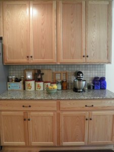 In general, I really like the way the backsplash tile and dark grout look against the granite countertops and the light oak cabinets with their dark hardware. The tile job isn’t perfect, but the tile in my daughter’s brand-new house, which was laid by professionals, isn’t perfect either. In the end, Dennis took the time to fix his worst mistakes, and the kitchen walls look very nice. More importantly, when I start making jam this summer, I’m going to be able to clean that backsplash easily instead of scrubbing paint (along with jam) off the walls.