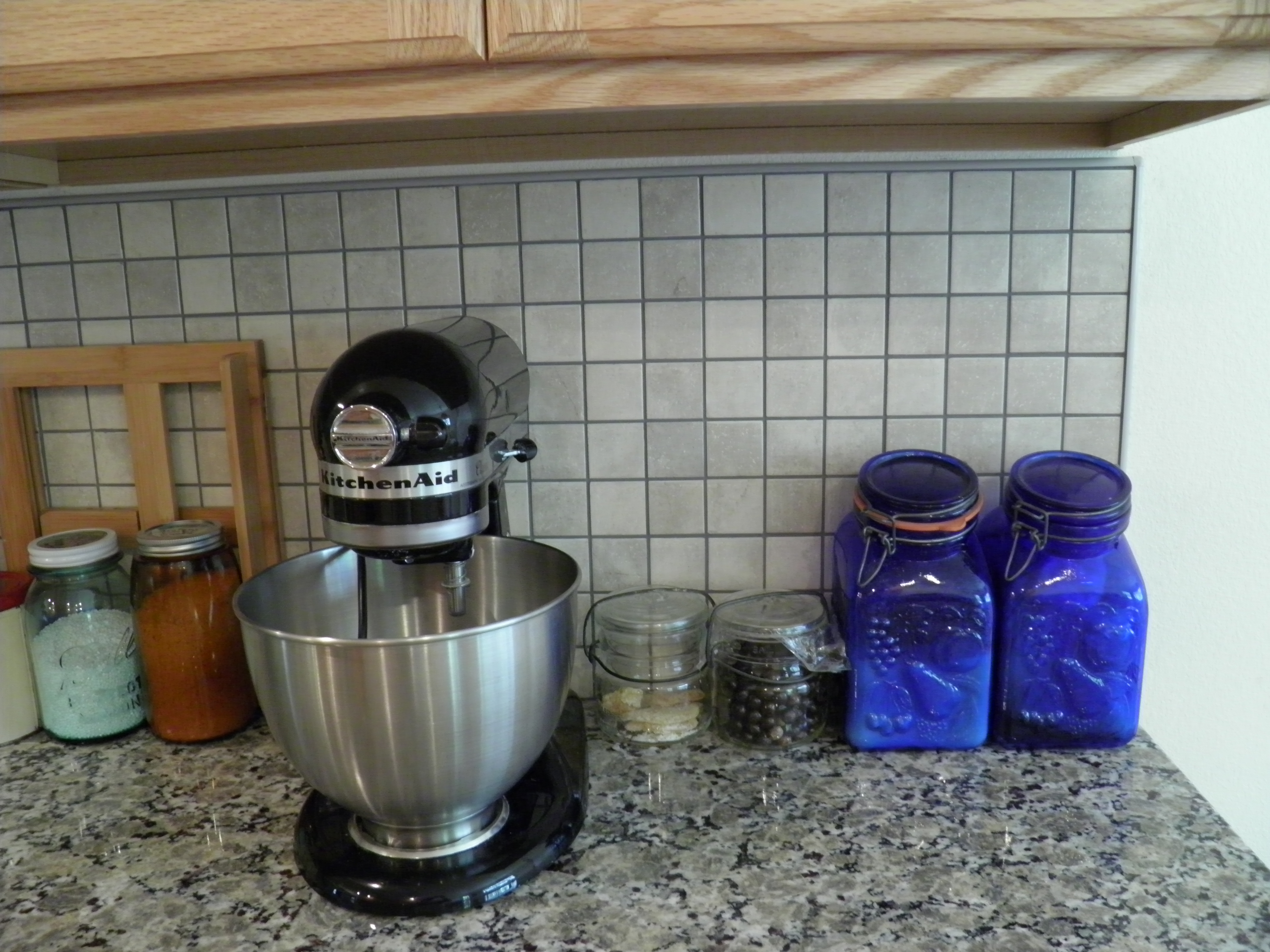 The only tiling Dennis has ever done was on our hearth a decade or more ago. He used big slate tiles on that job, and it came out quite nicely. He was nervous about tiling such a large area in the kitchen: two long walls and two short end walls. I don’t have pictures of all of it because I can’t keep it all clean enough at the same time to take a picture, but I will when the entire project is finally finished. (We still have to finish the pass-through slab and install it, and repair the wall where we cut it.) This is what I call my baking station. All my flours, sugars, and other baking paraphernalia are stored in the cabinets above and below, and my vintage canisters, bread board, and stand mixer can stay here on the counter. I love my baking counter!
