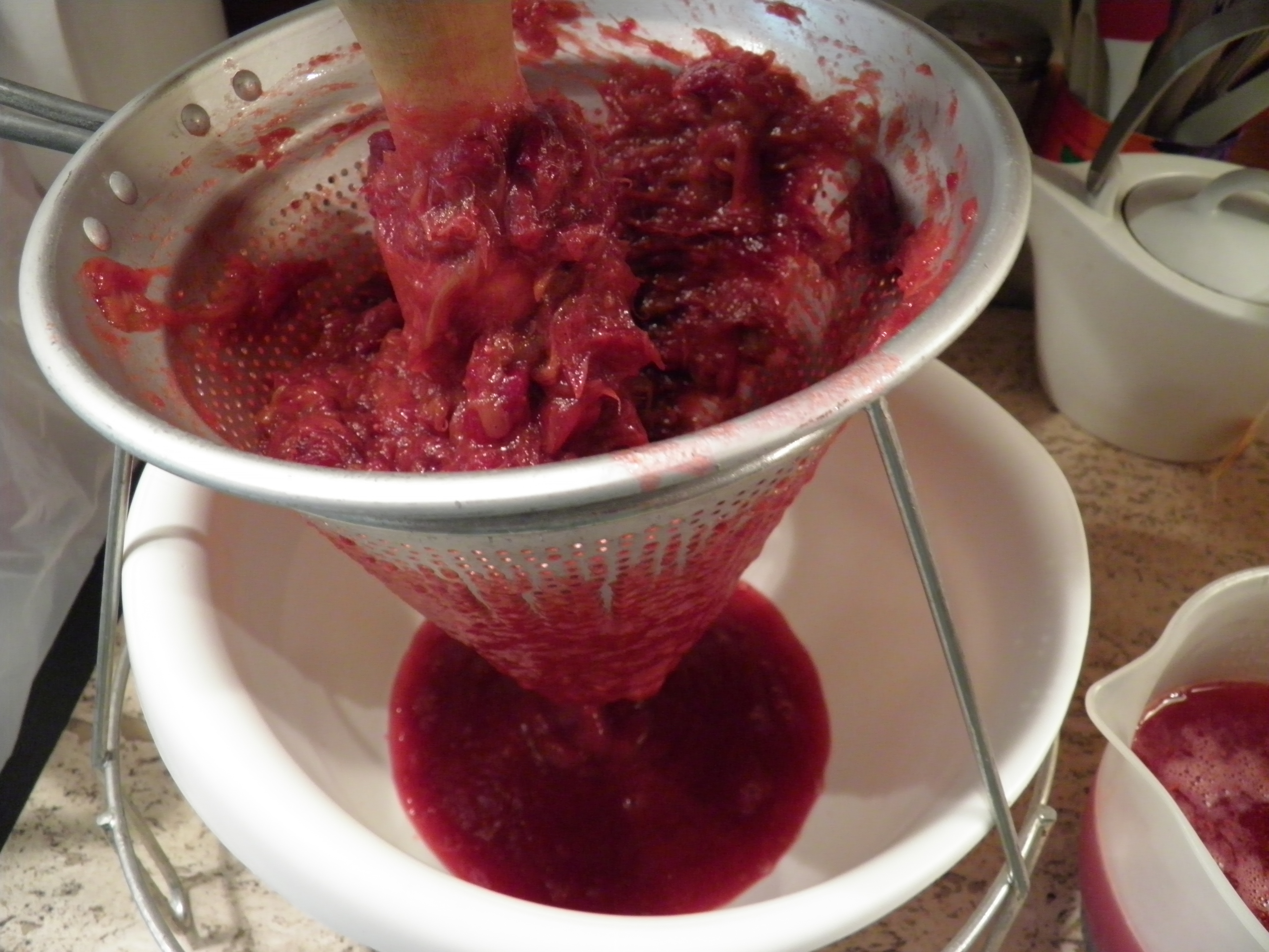 I cooked those tomatoes down in their own juice (another benefit of using frozen tomatoes—no need to add any water to the pot to keep them from sticking). I had about 18 quarts of juice after straining, maybe a little more. I didn’t measure it, but I can guestimate from the size of my big pans. One is 12 quarts and was almost full. The other one holds 7 quarts and was almost full as well. (I needed three pots to cook down the tomatoes, but I got about two quarts of skins and seeds for the dehydrator after straining.)
