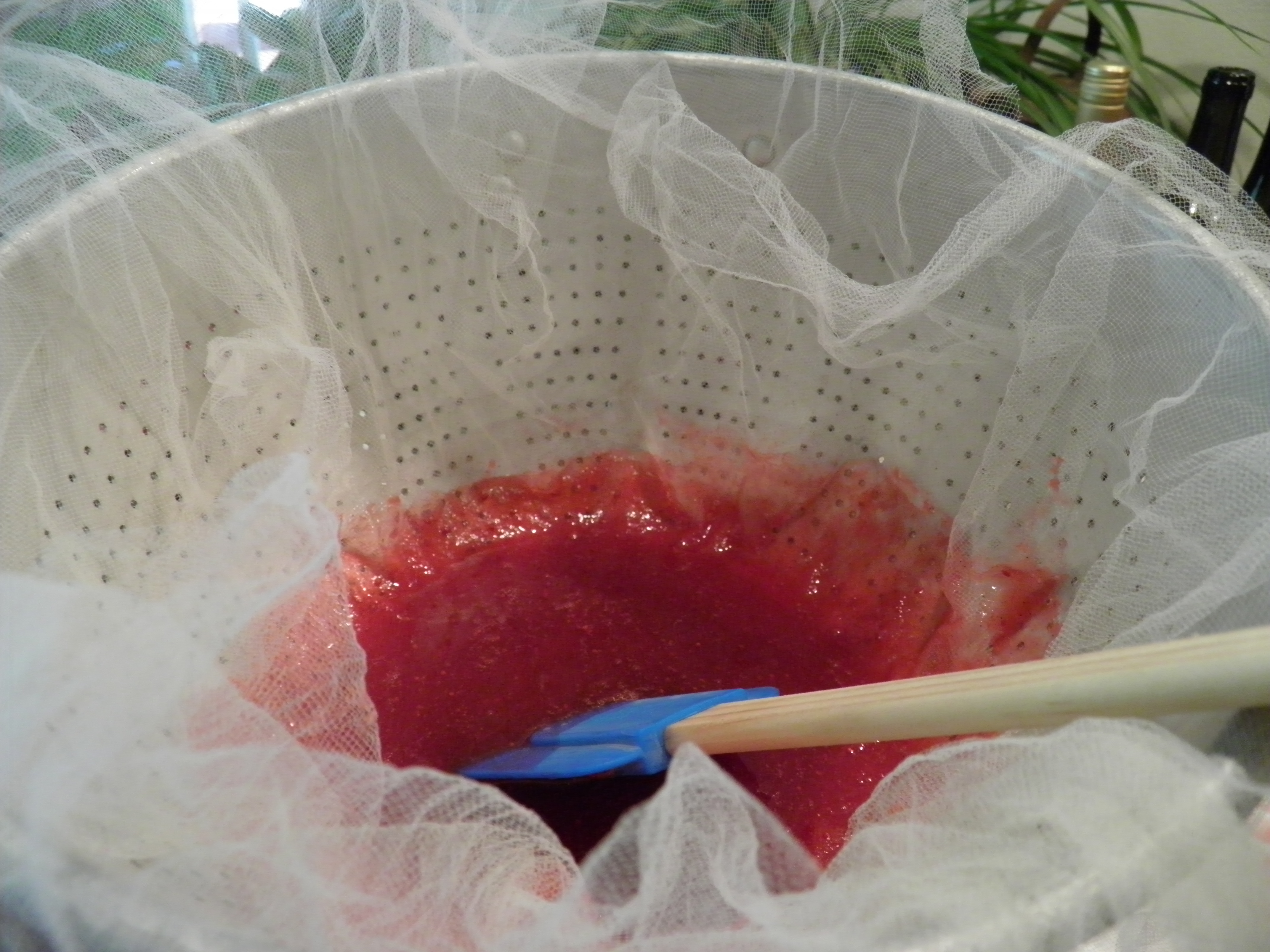 One side benefit to freezing tomatoes before cooking with them, I’ve discovered, is that when they thaw, the skins slip right off, and you can just pinch out the core with your fingers if you didn’t core them before freezing. If you don’t mind tomato seeds in your sauce, you can put the thawed, skinned, cored tomatoes in a big pot, get them started cooking and breaking down, and puree them with a stick blender. You can also puree them in batches in a counter-top blender. But I’m old-fashioned, and I like to get all the flavor I possibly can out of my tomatoes, so I cook them with the skins on until they are soft, and then run them through a chinois, or cone colander, to create a smooth texture and separate pulp from the skins and (most of) the seeds. If you have a Squeezo Strainer or a strainer attachment for a KitchenAid Stand Mixer, you might find that easier. For me, the chinois is easier to set up, take down, and clean up.