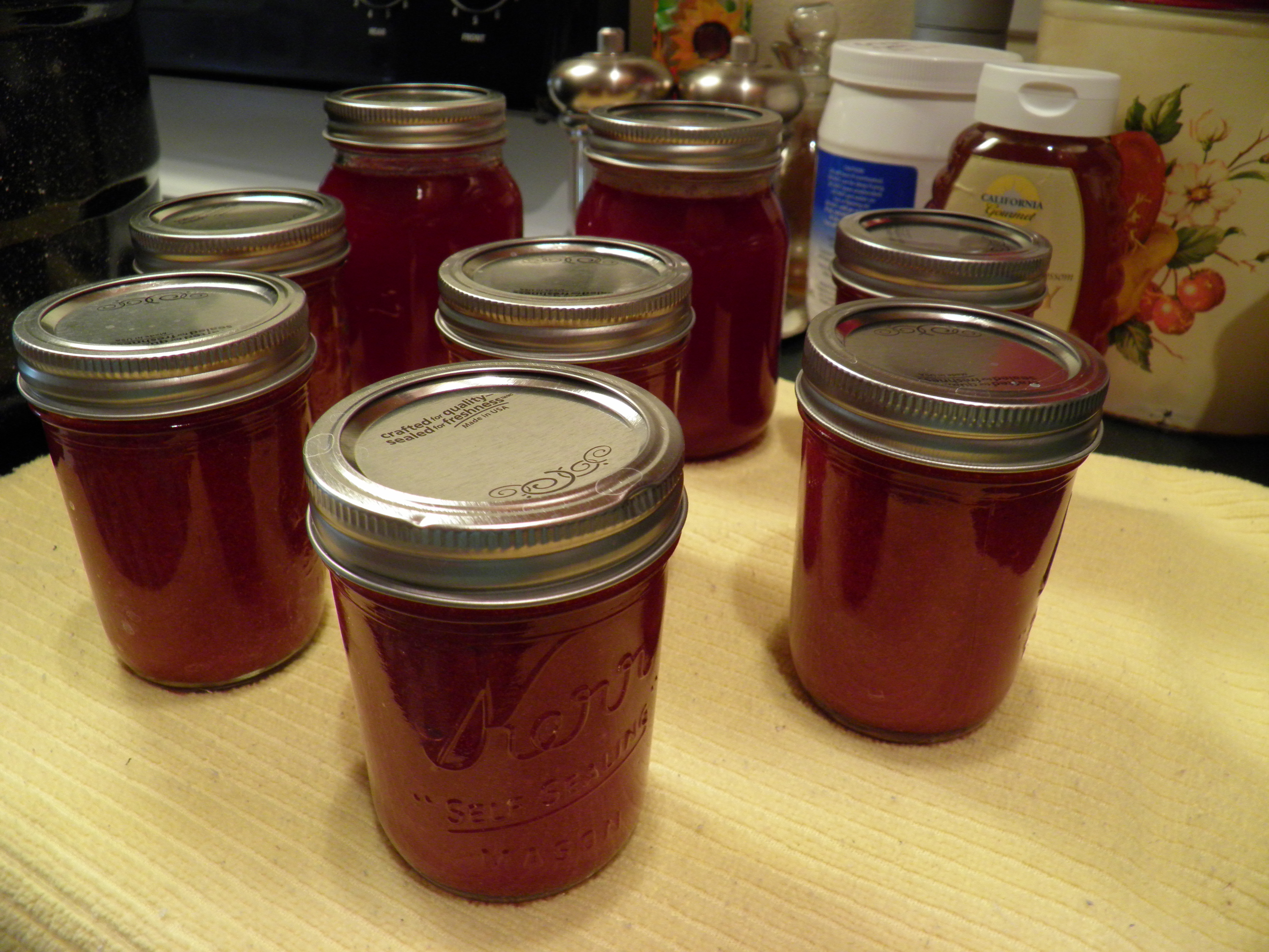 To those 18 or so quarts of tomato juice, after it had reduced enough in two pots to transfer it all into the big, 12-quart stockpot so that it was nearly full (probably about 10 quarts of thickened juice/sauce), I added three onions and 1 full head of garlic (all chopped in the food processor), 1 cup of red wine (and not anything expensive either, no matter what they tell you on Food Network!), 2 teaspoons of kosher salt, 1 teaspoon of ground black pepper, 2 tablespoons of crushed dried oregano, 2 tablespoons of crushed dried basil, and 2 tablespoons of crushed dried parsley. (I had fresh parsley in the garden, but it was raining, and I didn’t feel like going out in the rain and then having to wash mud off the parsley.) After cooking a bit longer following these additions to meld the flavors (and by now the sauce is thick enough that the heat must be lowered to medium to keep it from sticking), I added two tablespoons of sugar. I almost always add a bit of sugar to my pasta sauces to mellow out the acidity of the tomatoes, whether I’m making sauce from scratch, making it with home-grown, home-canned tomatoes, or using diced tomatoes or tomato sauce out a can. The red wine also has a sweetening effect, but I like just a bit more sweetness, especially with box-ripened tomatoes.
