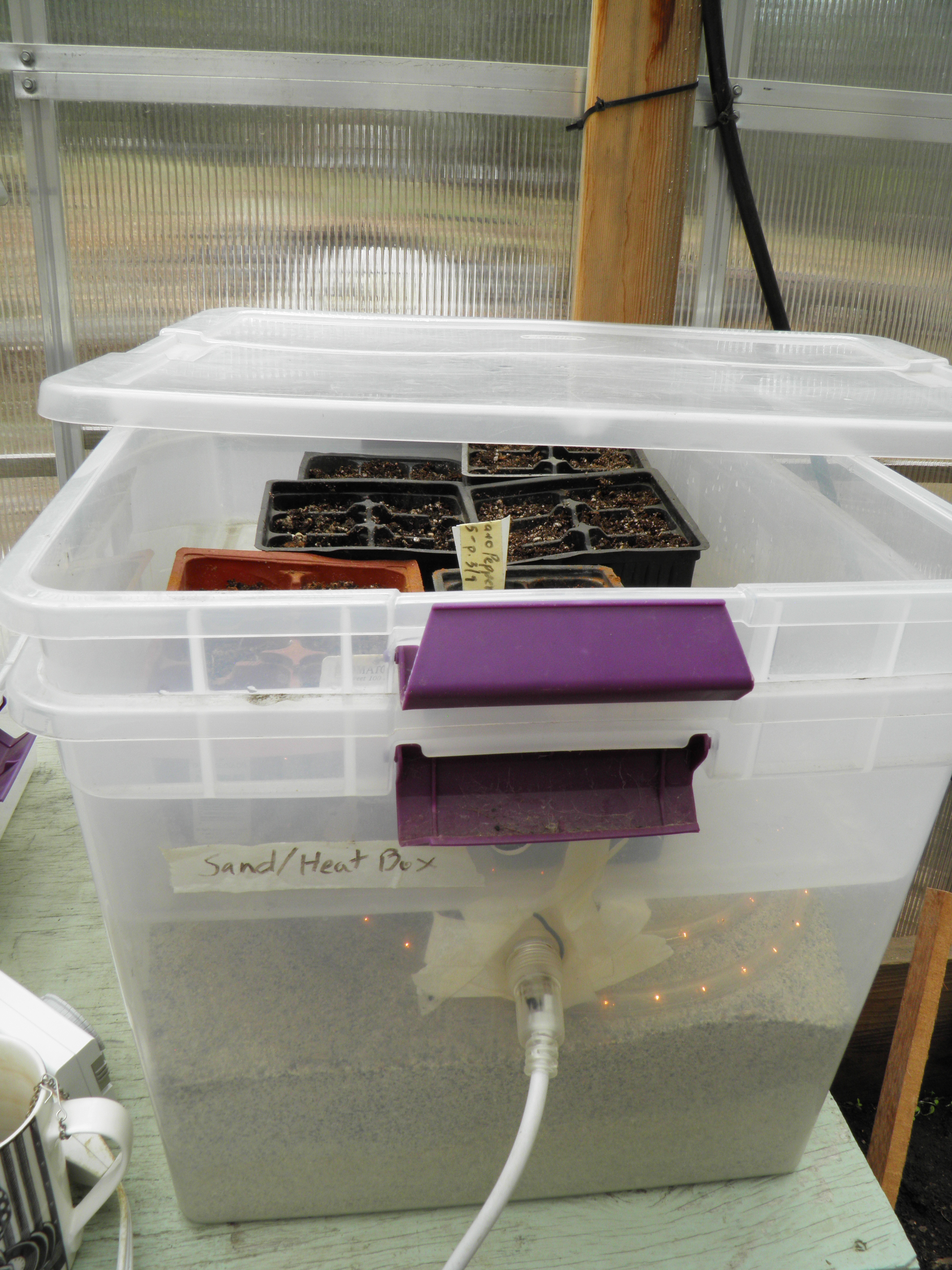 Last week, I put the germinated jalapeno, Serrano, habanero, and bell pepper seeds, and the eggplant, in the sand/heat box. Two days later, one of the jalapeno seeds had already put out two seed leaves and was ready to go into the light box. The light box is just a shallow, clear plastic tub that sits under the grow light I found at a thrift store for $3.