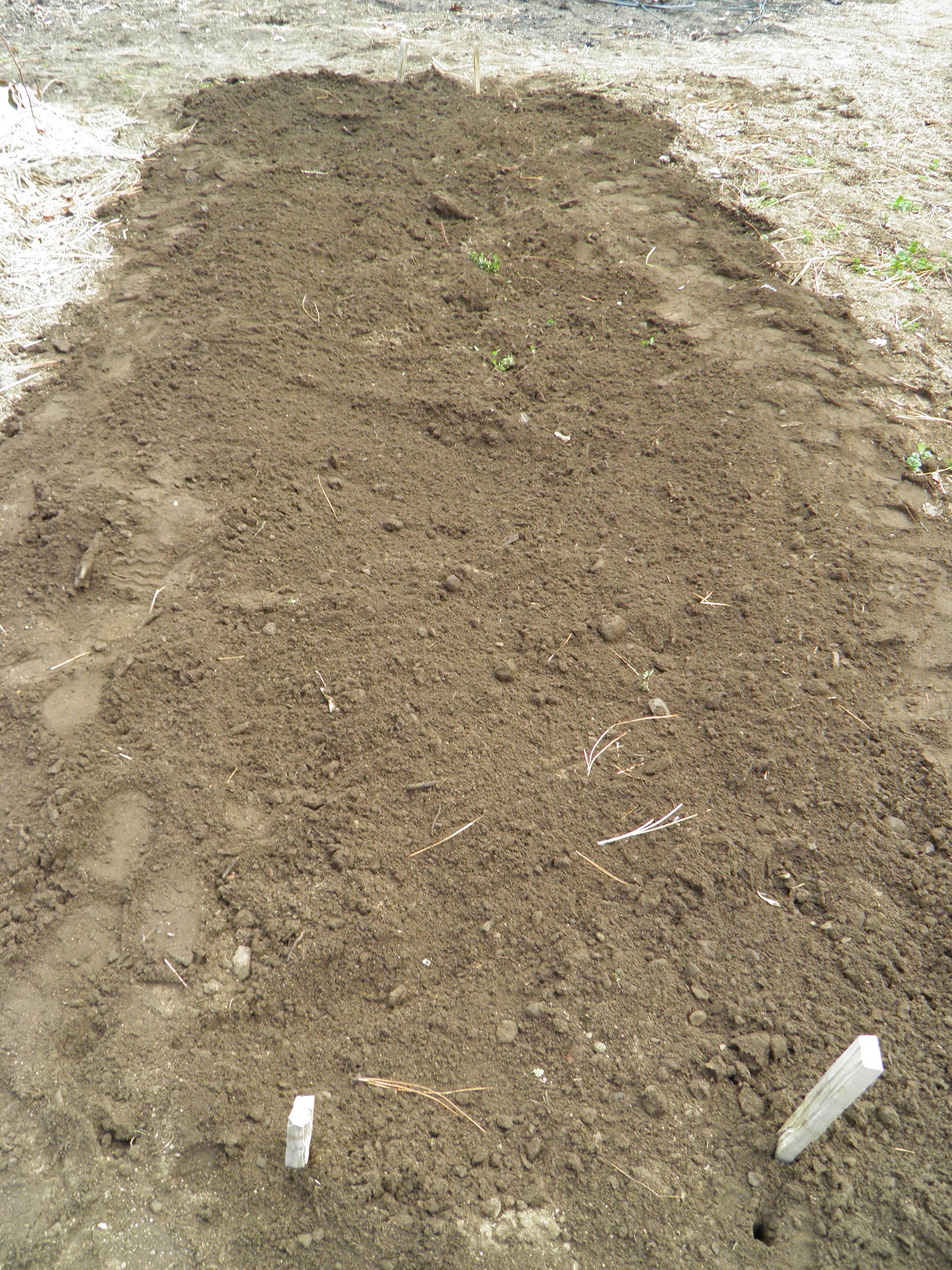 We plant the potatoes six inches deep over a sprinkling of Dr. Earth Organic Garden Fertilizer, and then I mulch with 6-12 inches of leaves, pine needles, and straw, if I have any clean straw. This mulch holds moisture in the soil, keeps down weeds, protects the potato plants from late frosts after they emerge, protects the potatoes from sunburn after they form, and makes it easier to dig them in the fall.