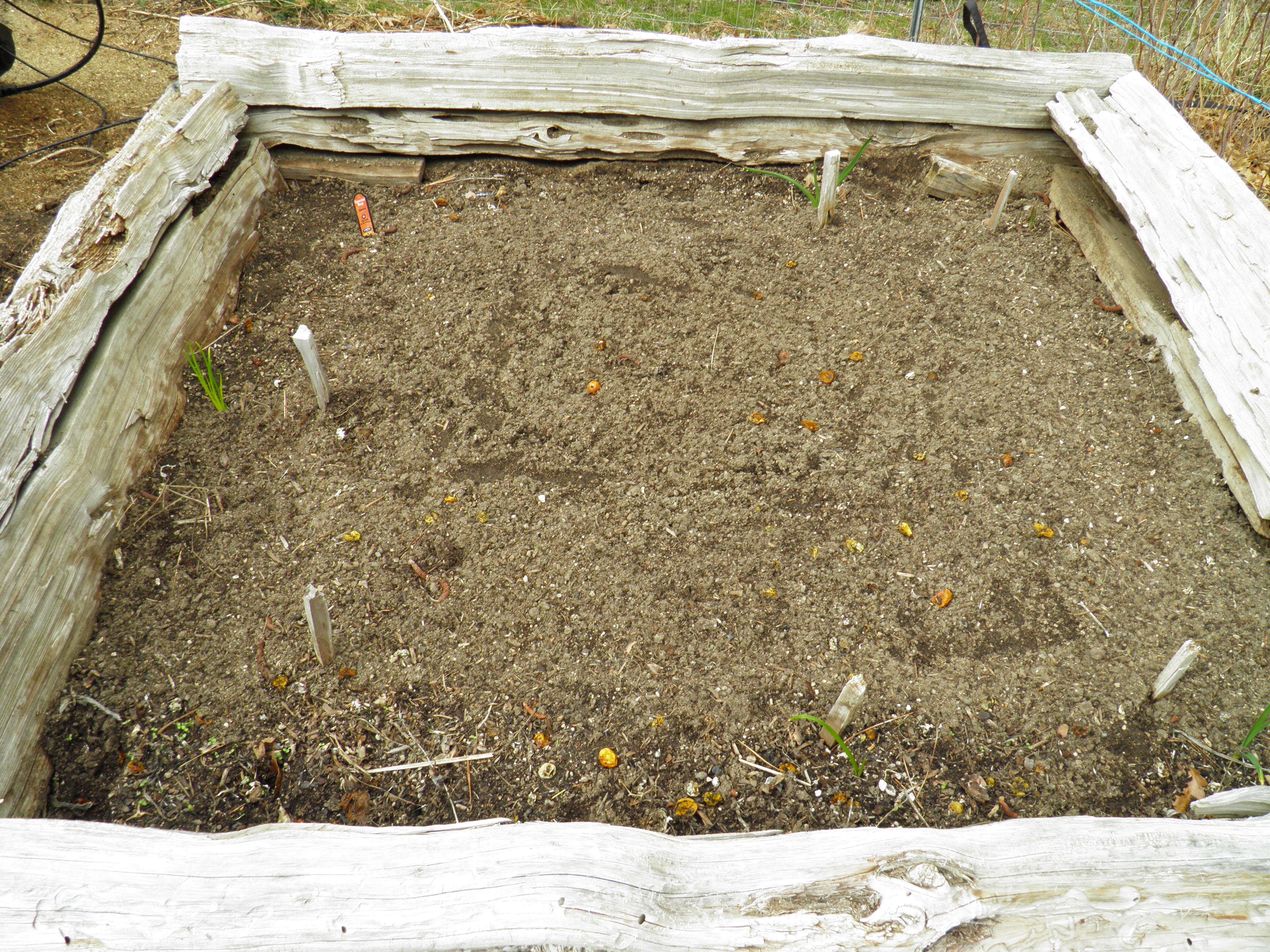 The same goes for spinach in the heirloom tomato box bed. I allow the spinach to go to seed in the summer and self-sow. This way, I have spinach much earlier in the spring than I would have it if I waited to sow seed myself. My spinach seedlings are several weeks old now, so I’ll have spinach to pick that much sooner than if I’d sown it this past week. Below is a picture of the heirloom tomato box bed last spring, after I’d planted the tomatoes but before I’d picked all the spinach. You can also see that baby garlic that I planted from seed early last spring. I love interplanting this way.