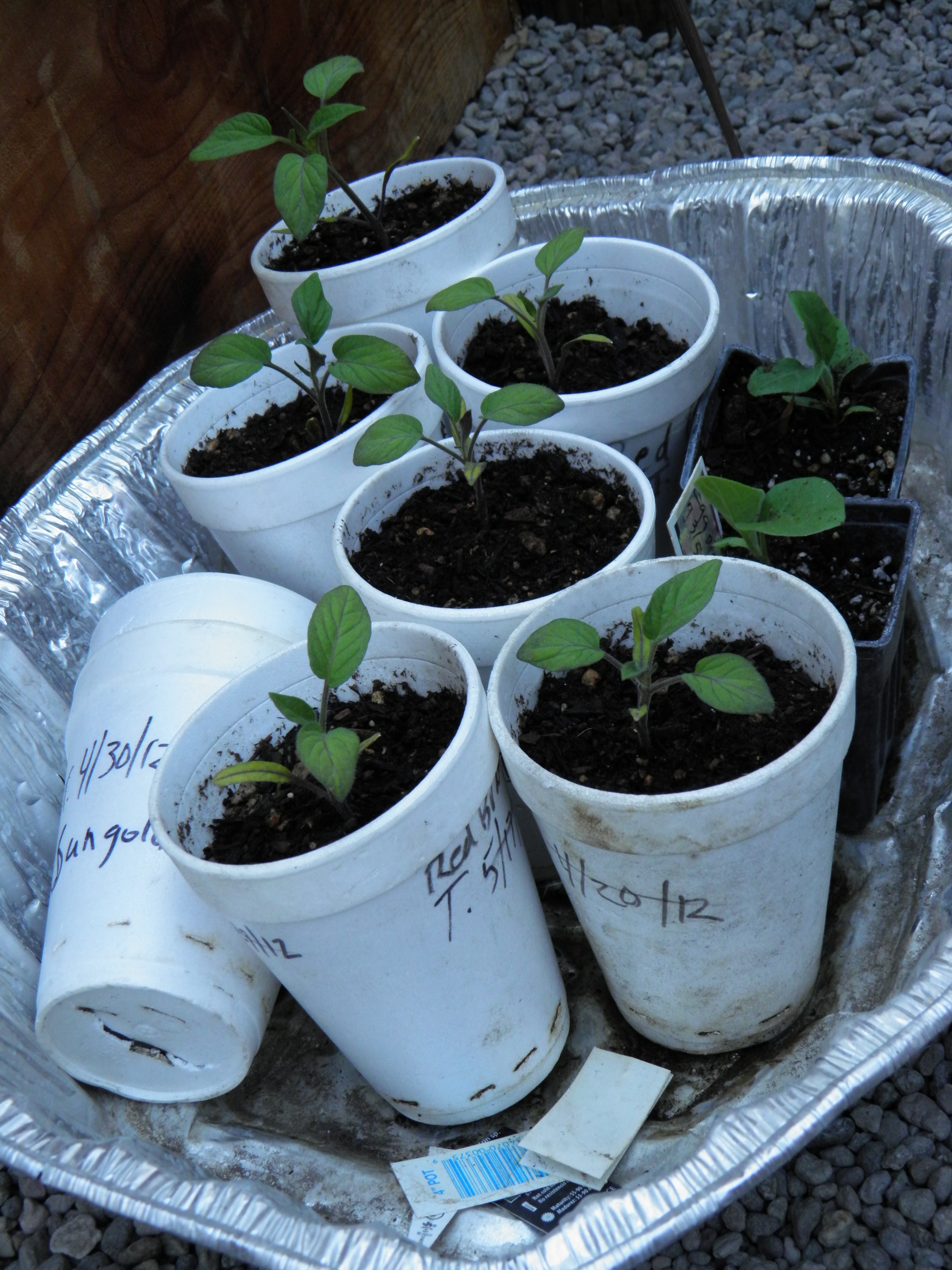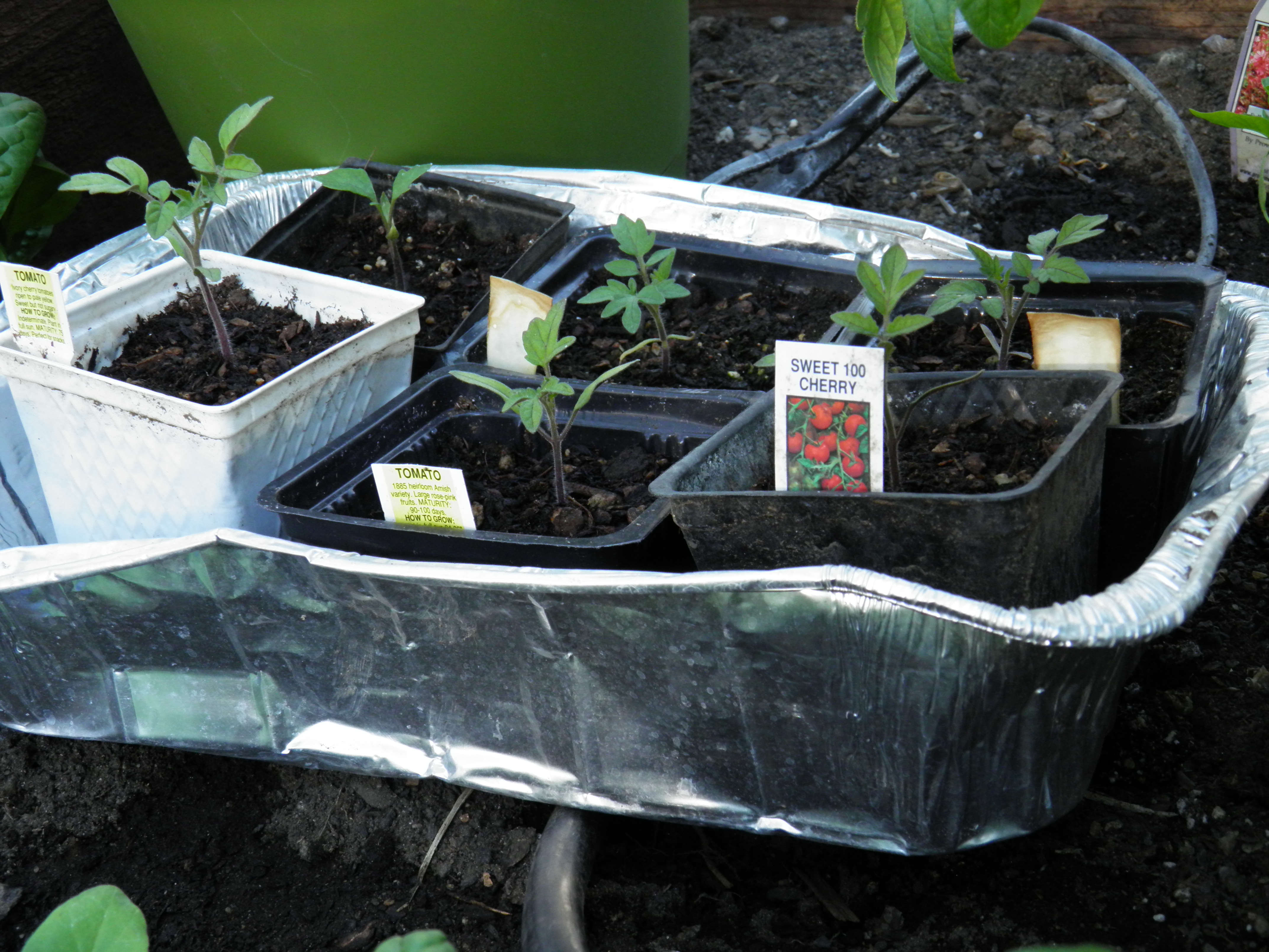 After transplanting, I water the seedling to settle the soil and the plant’s roots into the soil, and then the tomato cups go into an aluminum foil roasting pan which sits on the warmed planting beds in the greenhouse until it’s time to start hardening off the plants prior to planting out. If we get a late freeze, I plug in the radiant oil heater and set the foil pans around it to keep them from freezing. The foil pans also reflect light and warmth on dark days, and they make it easy for me to move the plants in and out of the greenhouse for hardening-off.