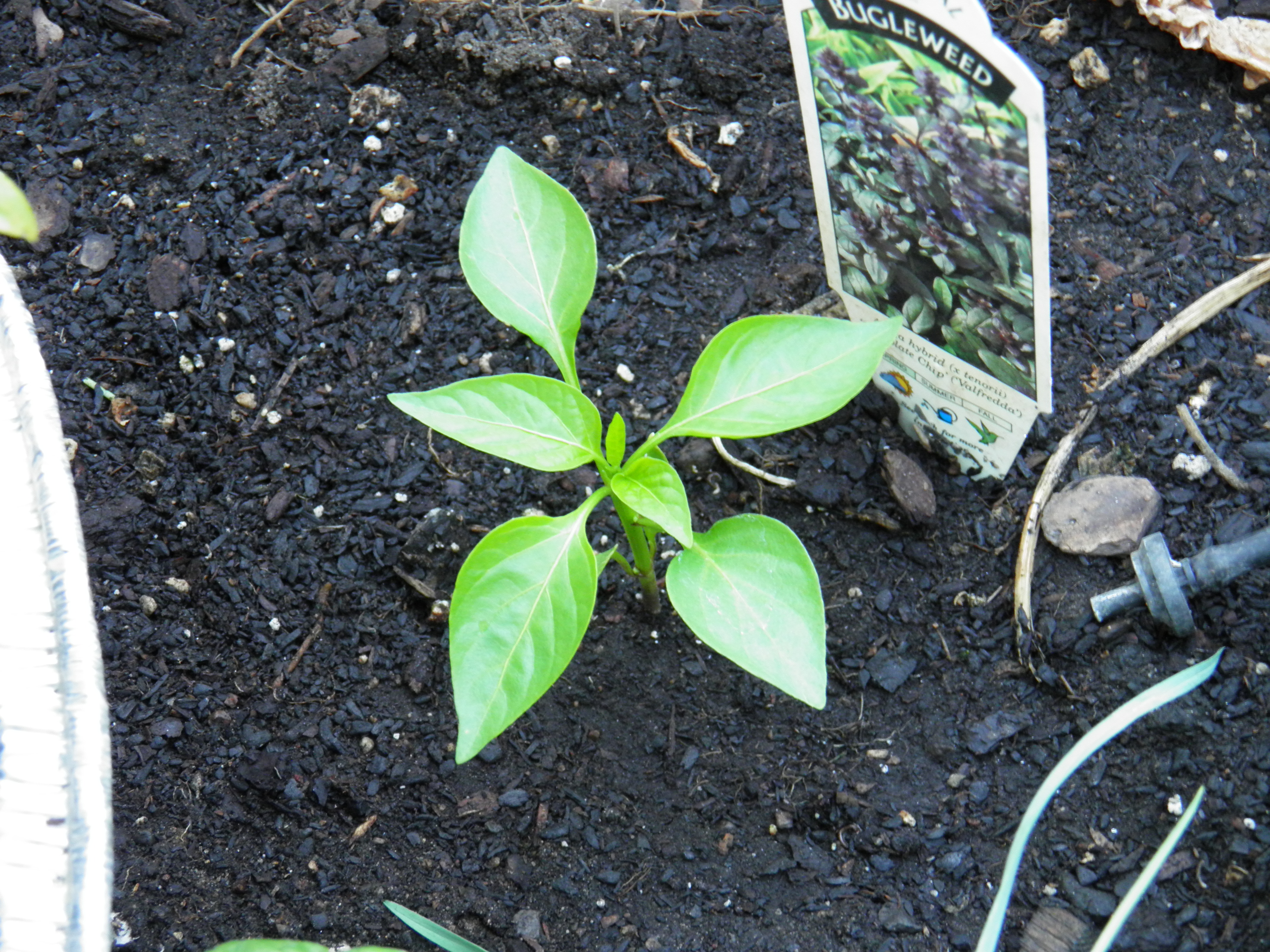 I do not deep-plant pepper seedlings. There’s some controversy about whether or not pepper stems grow roots like tomatoes, and whether or not it’s a good idea to deep-plant them. I don’t do it for one very simple reason. Peppers grow slowly. If you deep-plant a pepper seedling to grow roots on the stem, you are just delaying the fruiting process. I’ve never done it, and my hot peppers do very well outside in my short growing season. I’m afraid that trying to root pepper stems would seriously set back my pepper harvest. So I just transplant to the same soil level as the plant was in its original container.